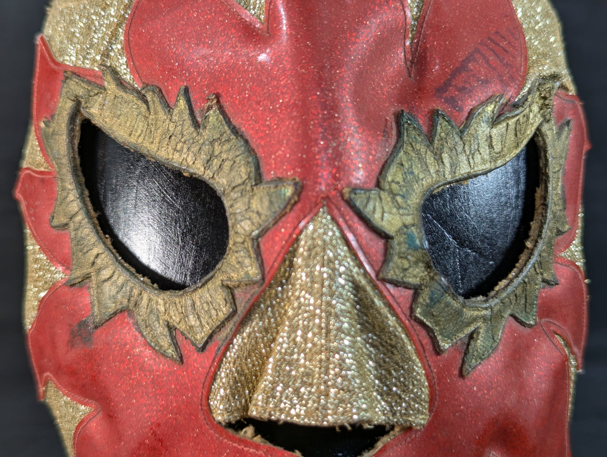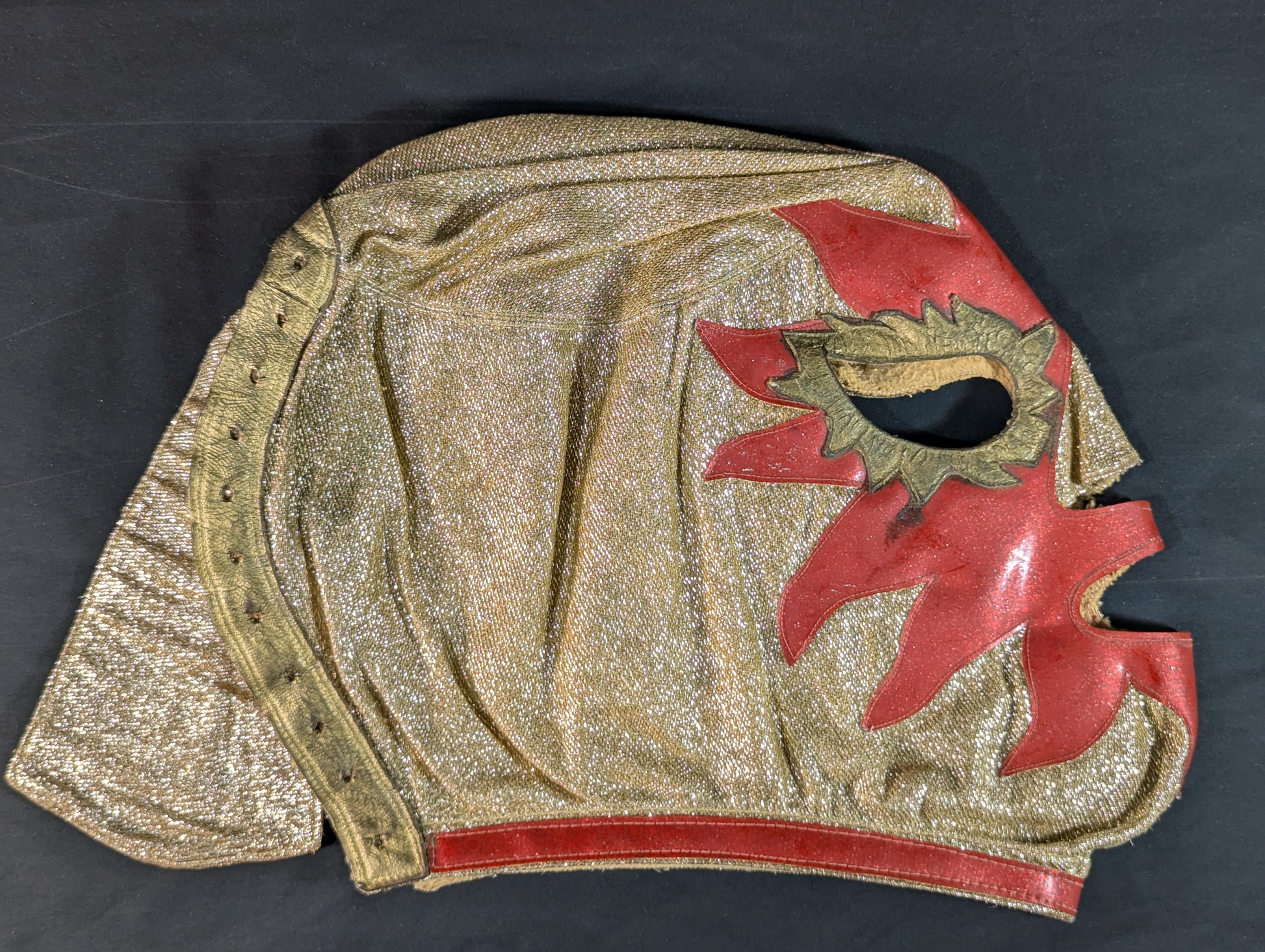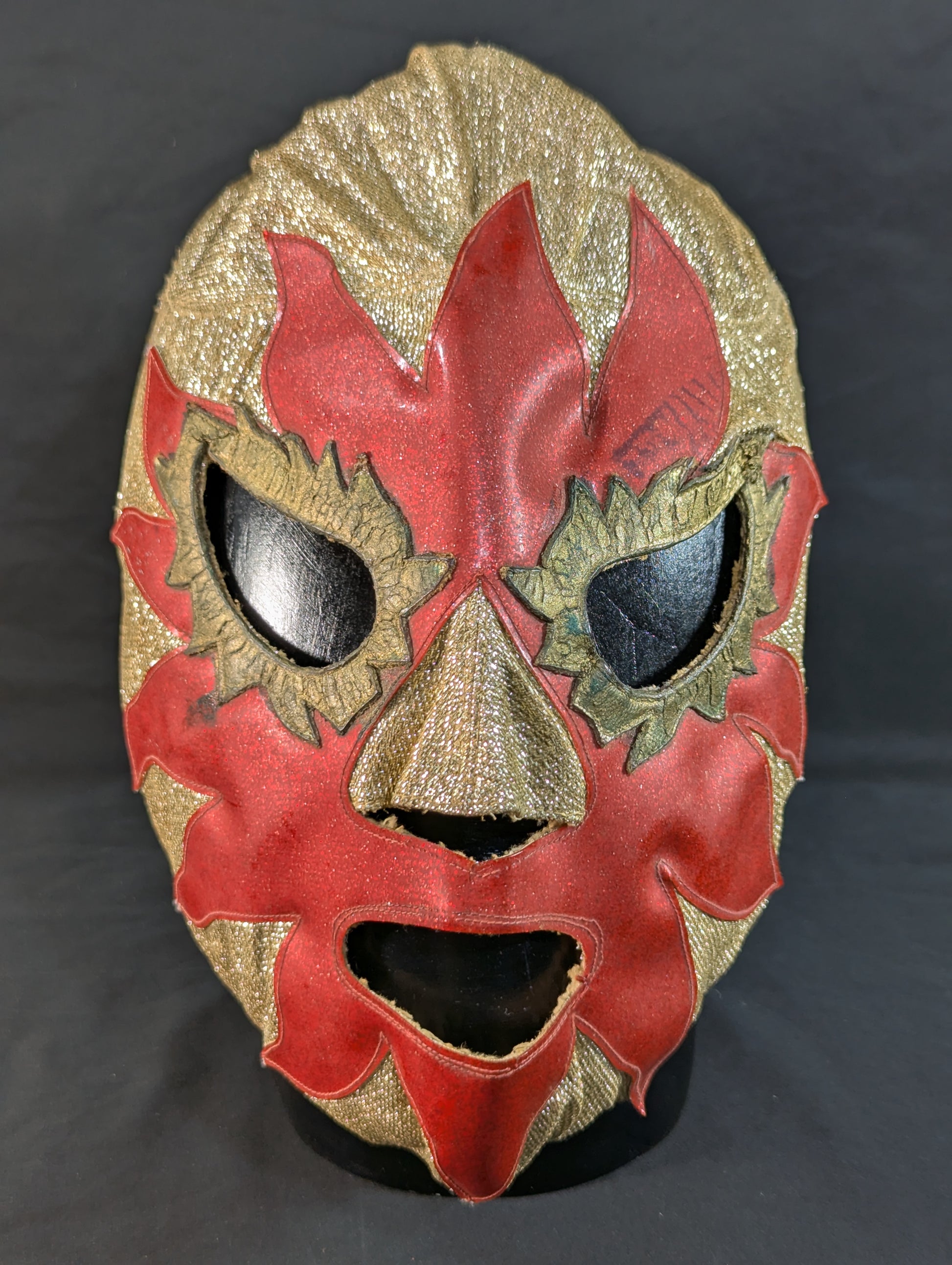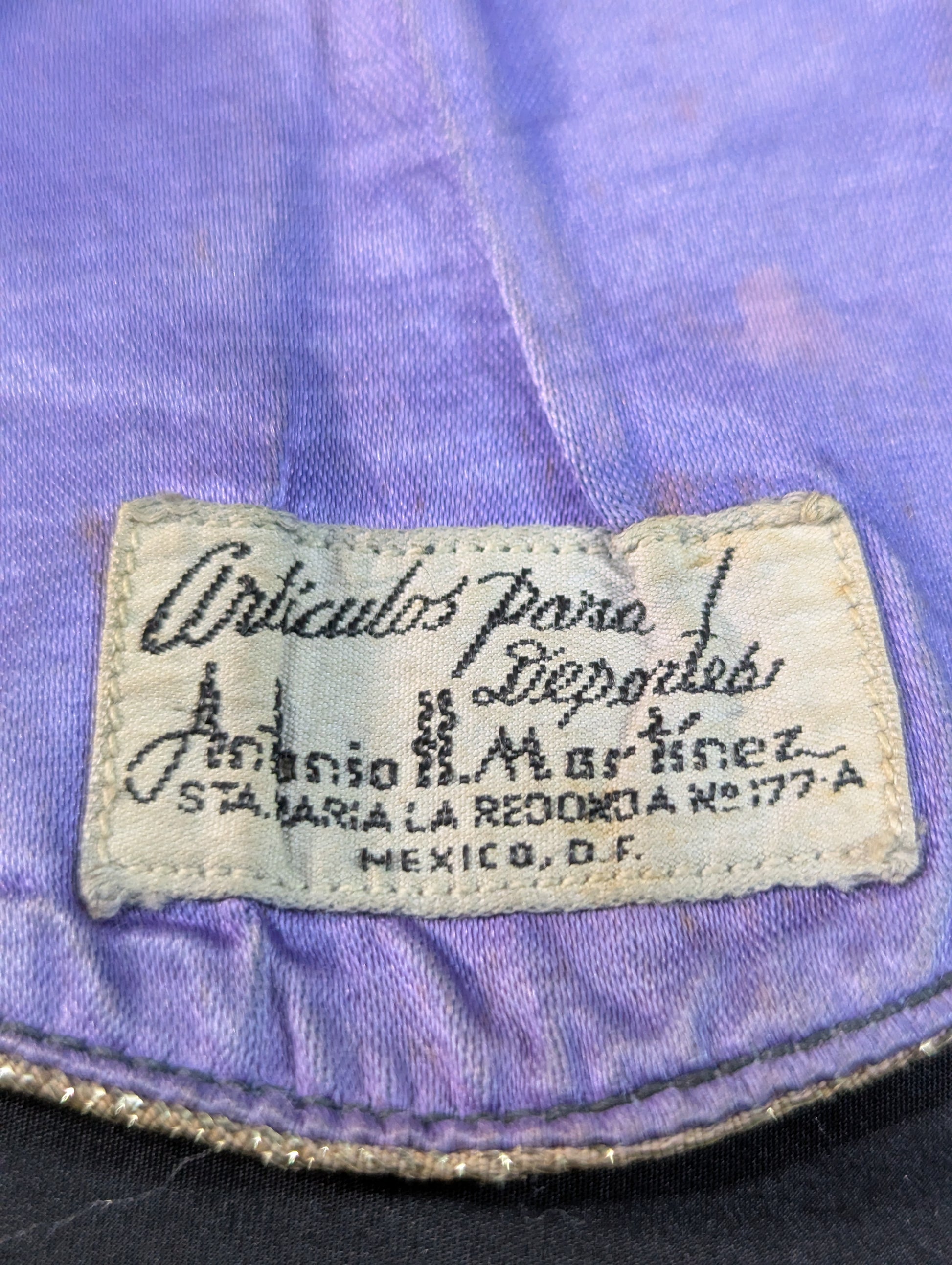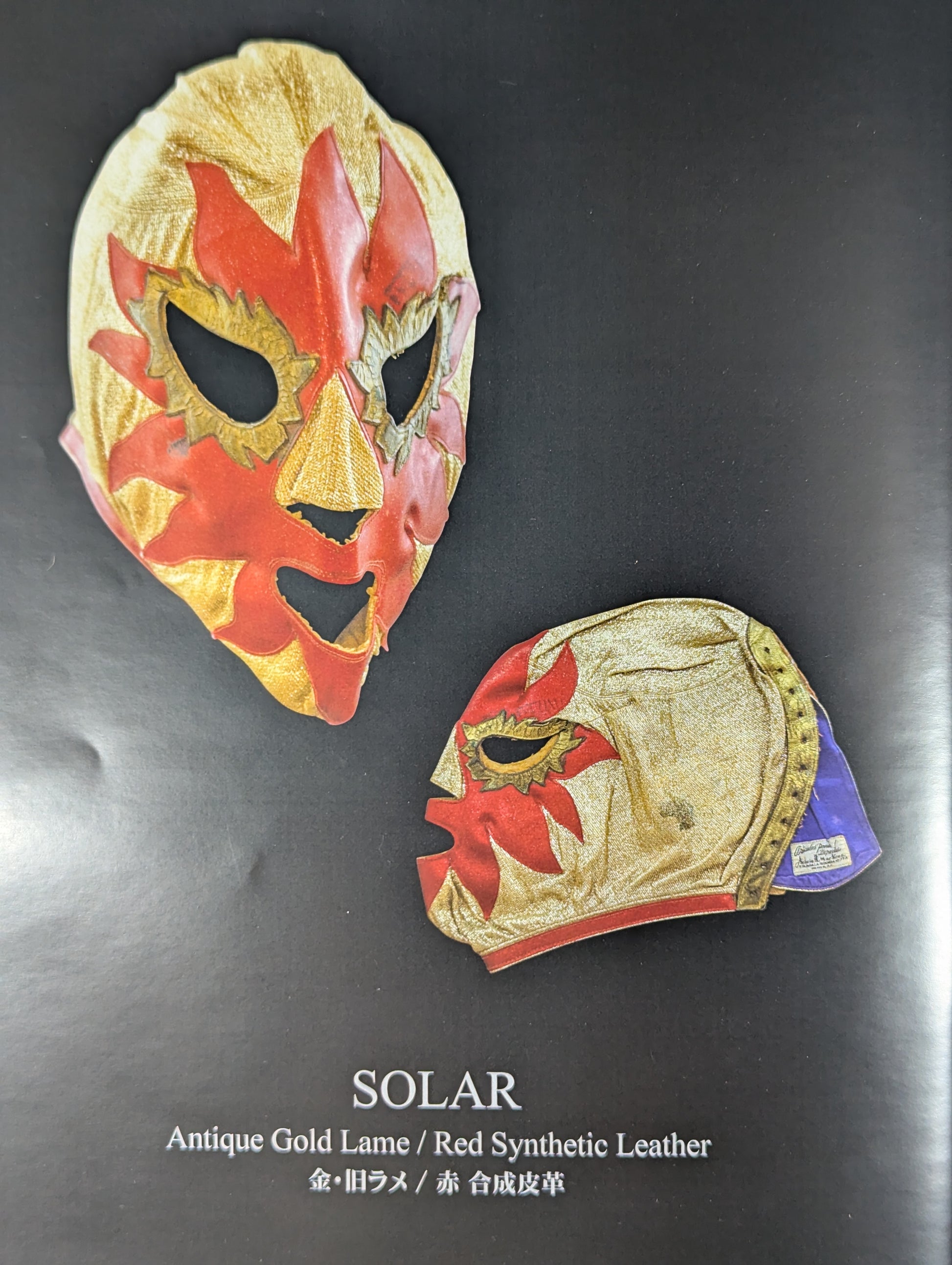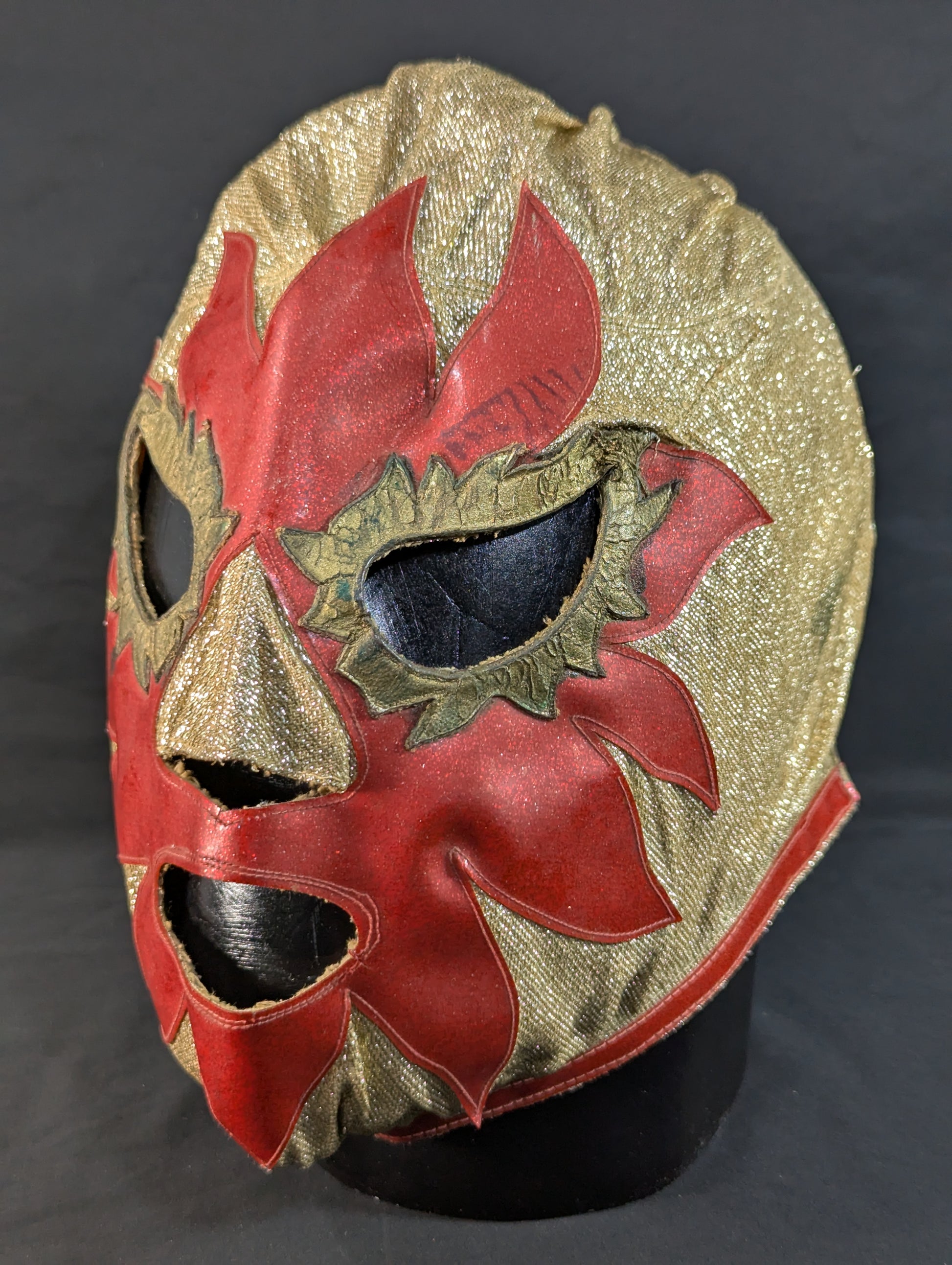 ★本人実使用!! 70年代当時モノ★ 旧金ラメ 赤特殊フチ&金革フチ(紐通し部分も同色本革) ベロは同色の旧ラメと青紫色の旧サテン生地 喉テープは縦幅1.6cmで薄青のセンターステッチ 横タグ ~神秘なるマスク芸術~マルチネス編の30ページに掲載されている現物マスク 1970年代中期にアントニオ・ウンベルト・マルチネス氏により製作されたもの
