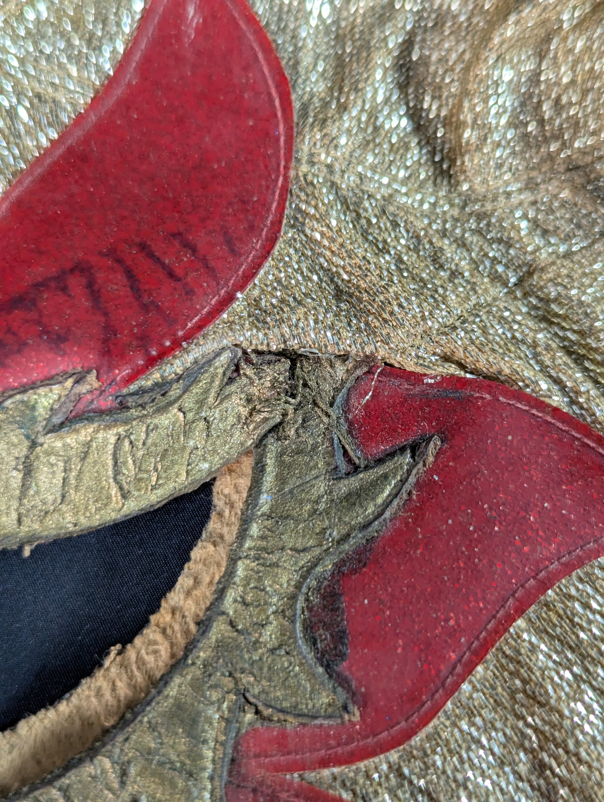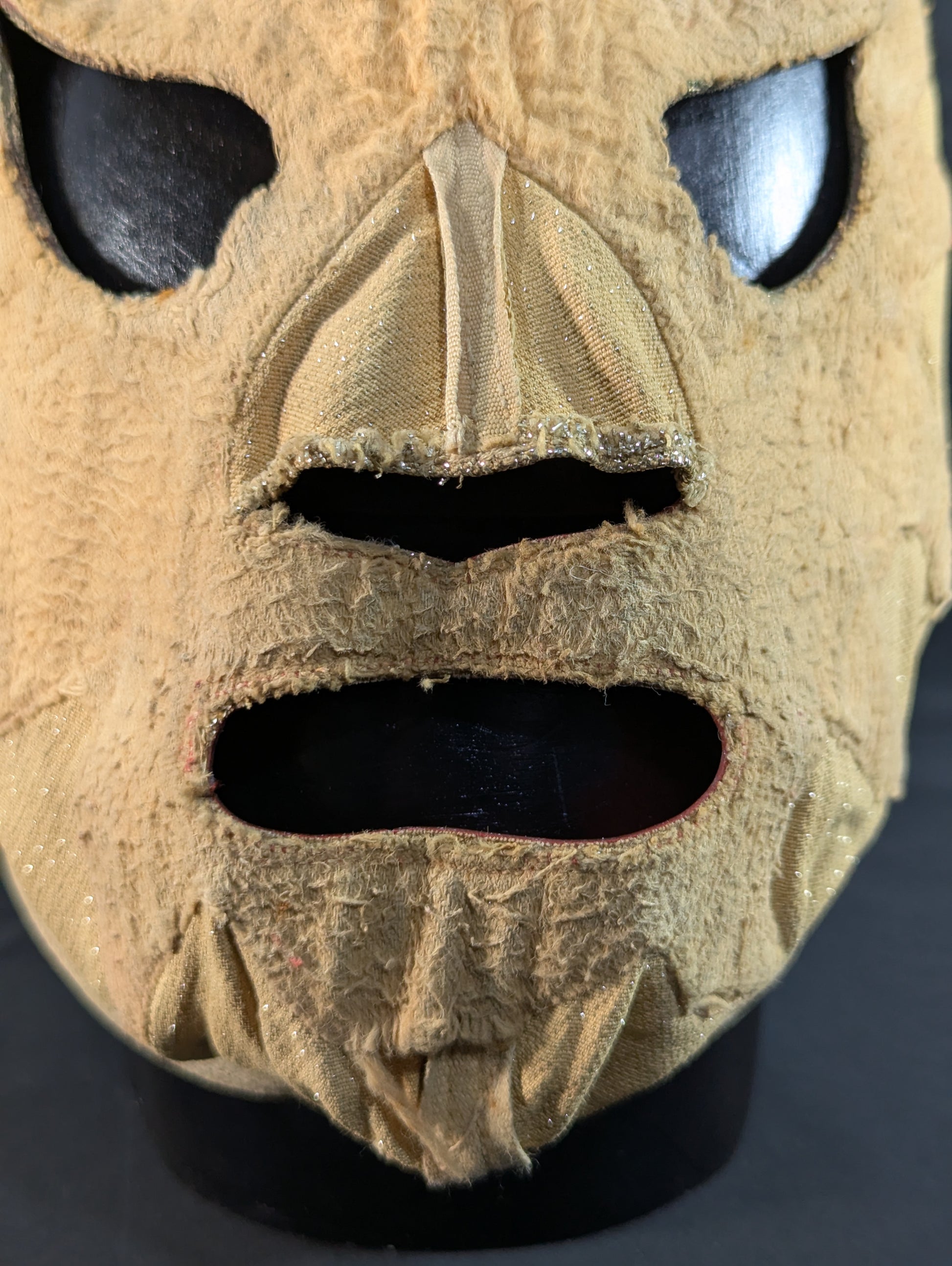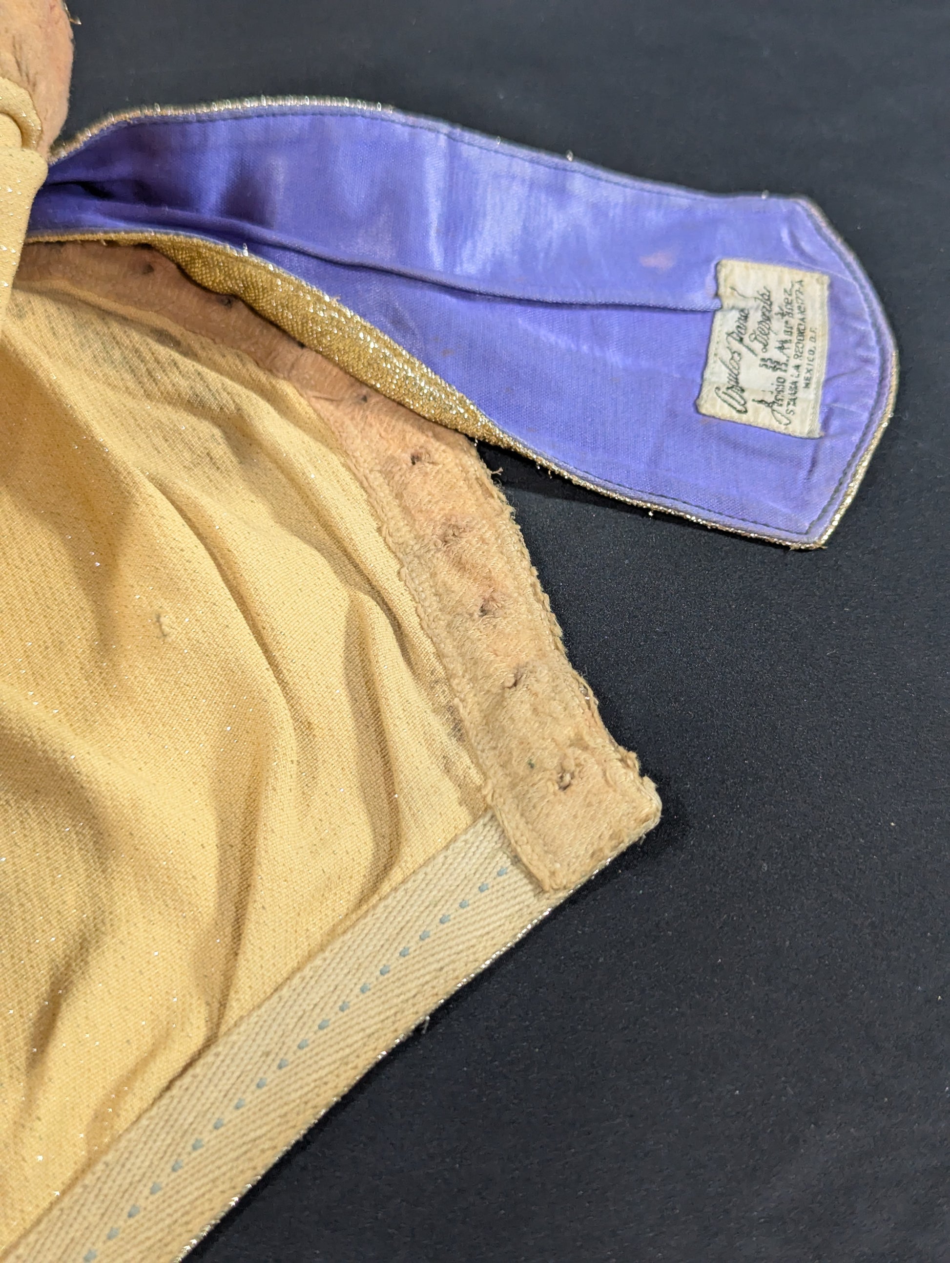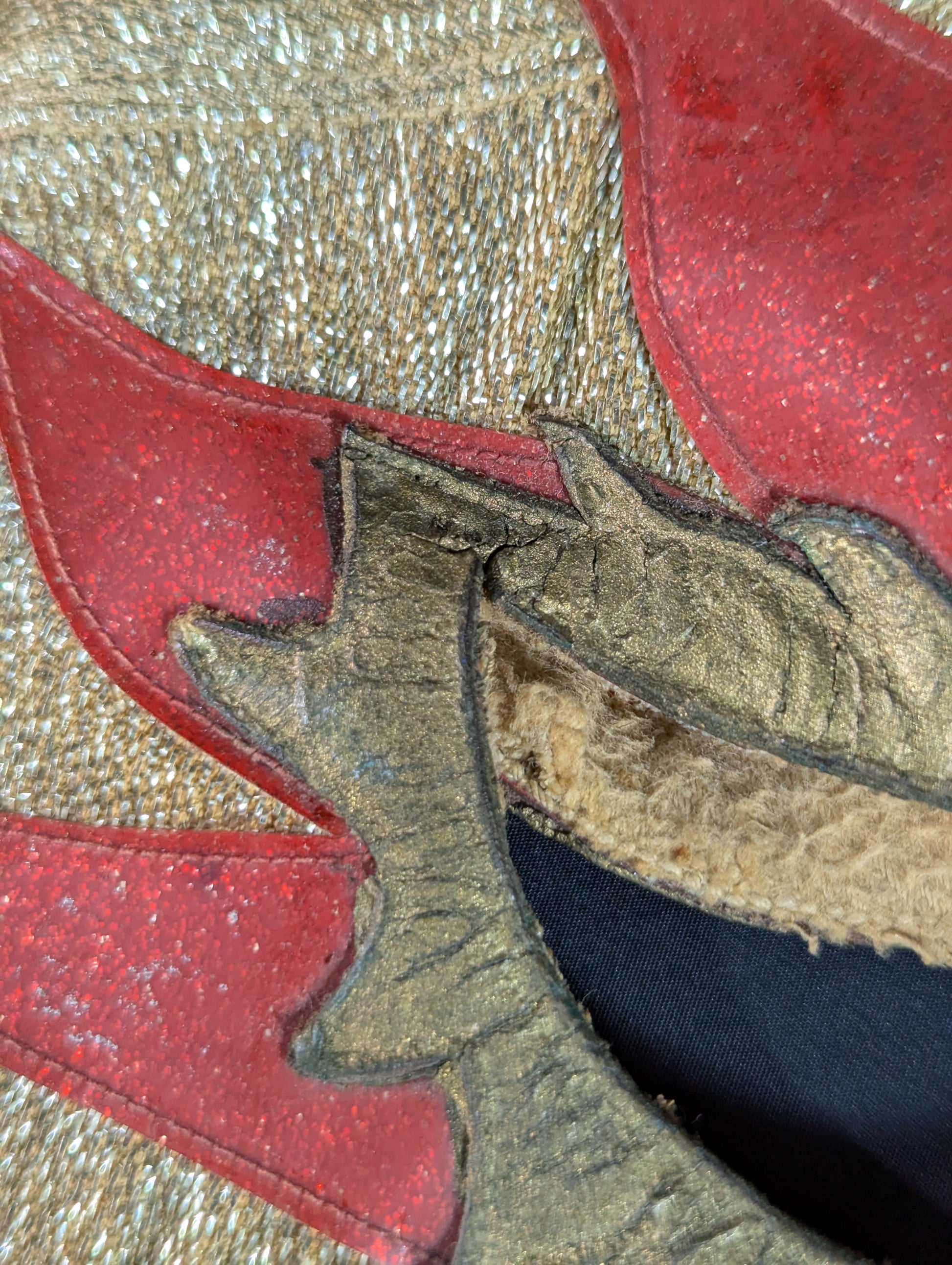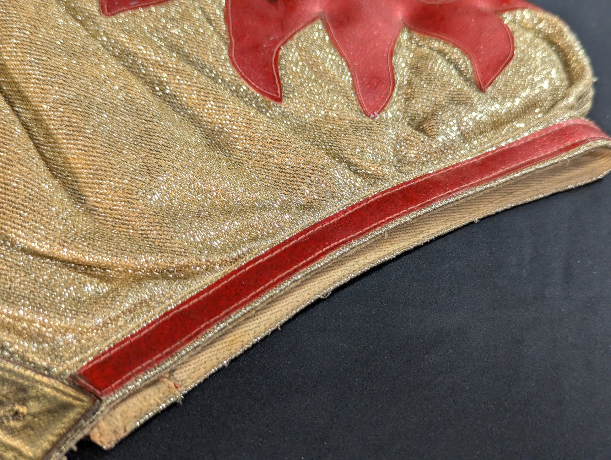 ★本人実使用!! 70年代当時モノ★ 旧金ラメ 赤特殊フチ&金革フチ(紐通し部分も同色本革) ベロは同色の旧ラメと青紫色の旧サテン生地 喉テープは縦幅1.6cmで薄青のセンターステッチ 横タグ ~神秘なるマスク芸術~マルチネス編の30ページに掲載されている現物マスク 1970年代中期にアントニオ・ウンベルト・マルチネス氏により製作されたもの