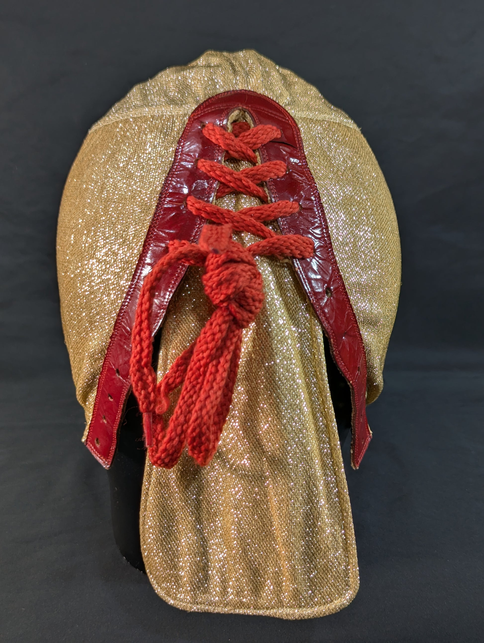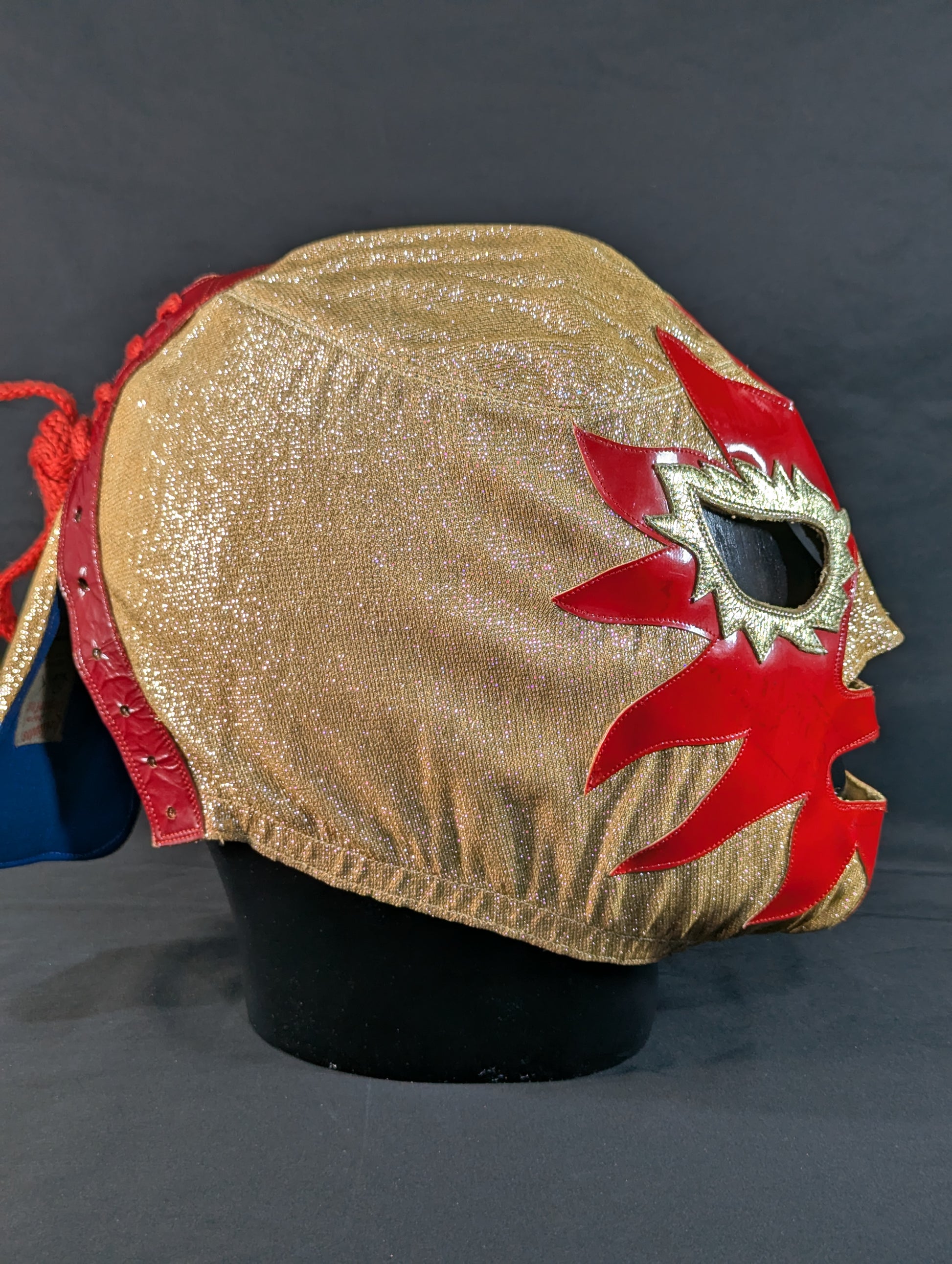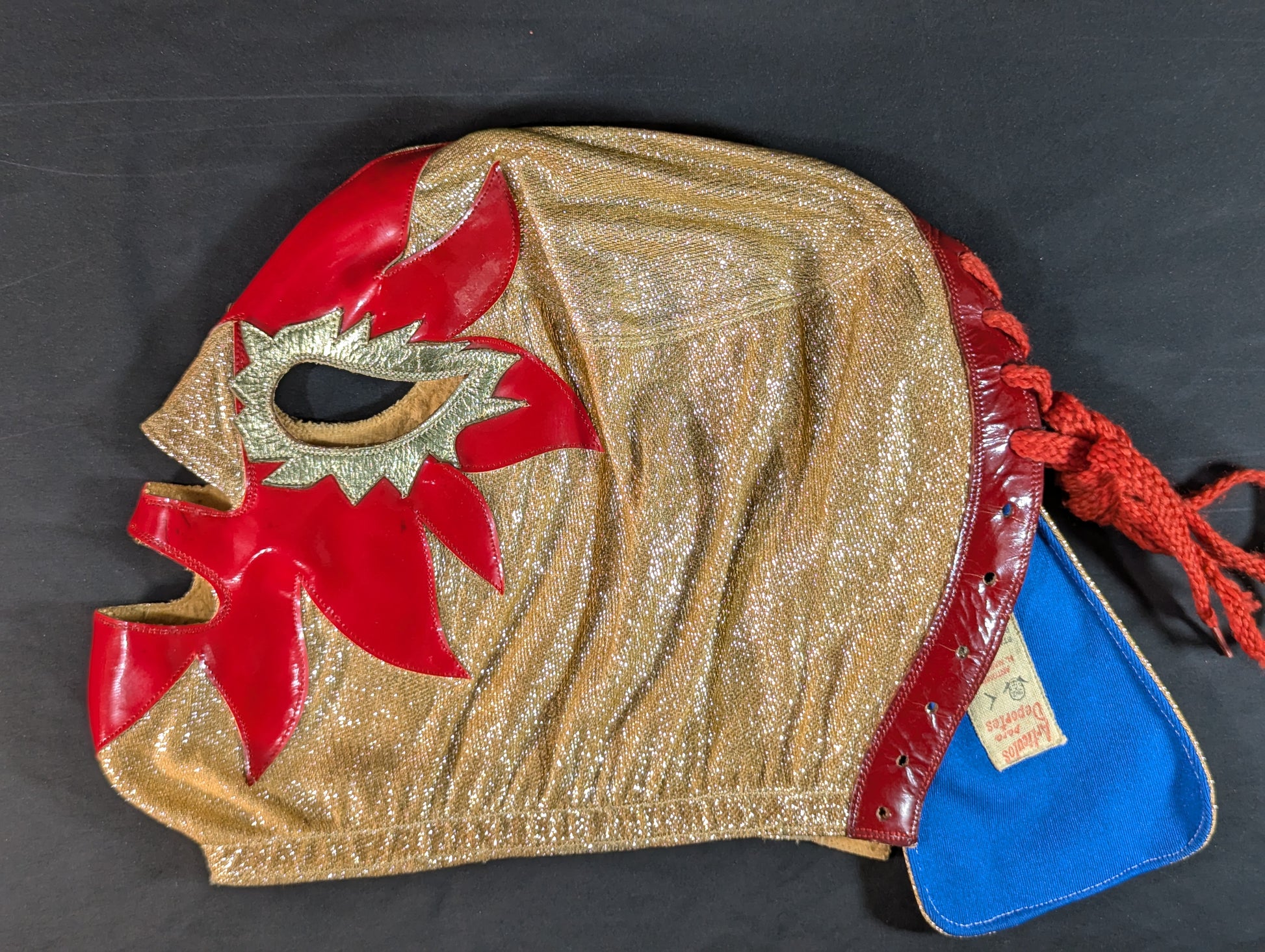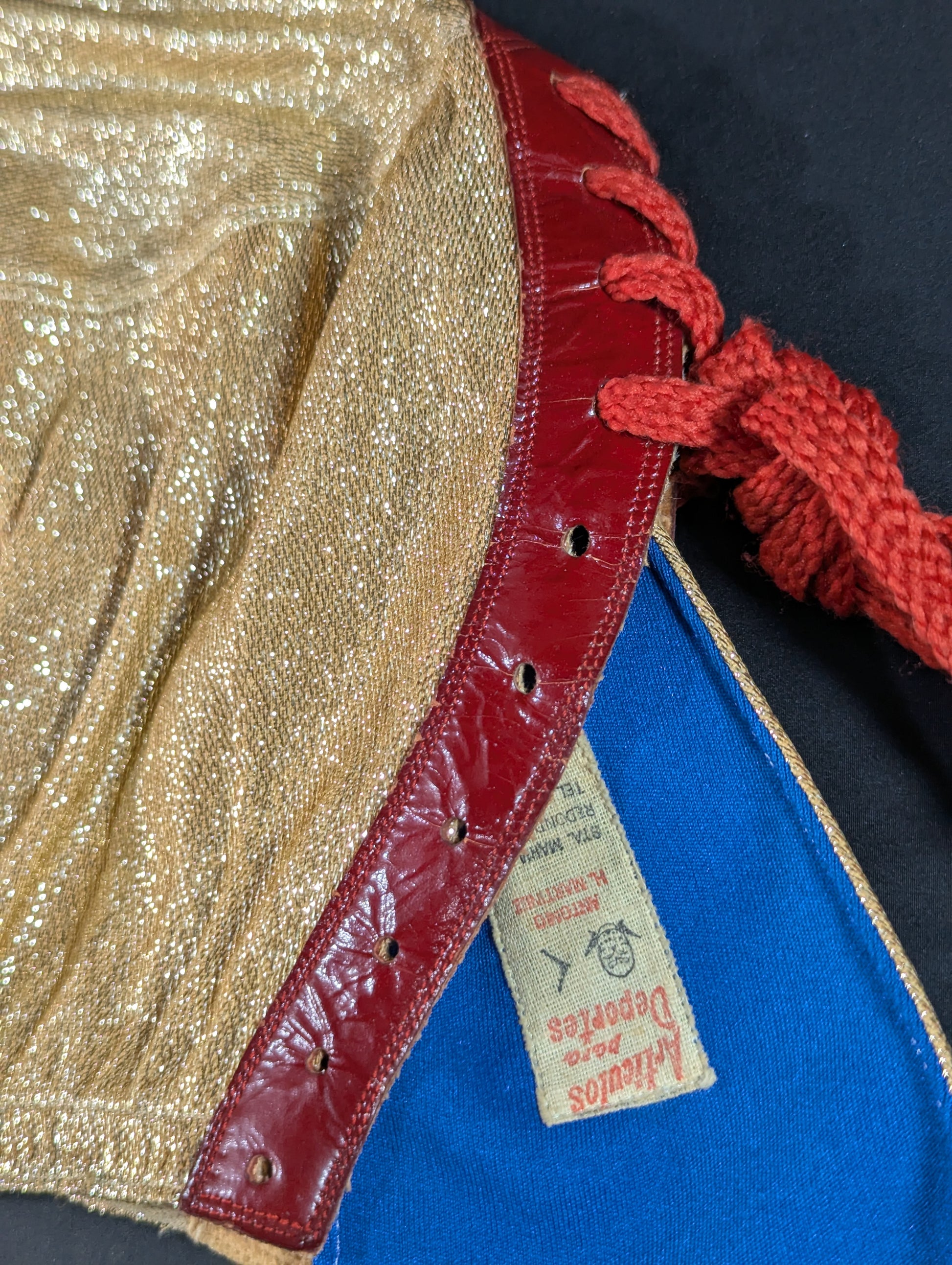 ★本人実使用!! 80年代当時モノ★ 旧金ラメ 赤フチ&金革フチ&濃赤革フチ(紐通し部分) ロングベロで同色の旧ラメと青ジャージ生地 喉テープは縦幅1.4cmの無地の綿素材 縦タグ ~神秘なるマスク芸術~マルチネス編の31ページと同書メキシコ・ルチャリブレ編61ページに掲載されている現物マスク 1981年の新日本プロレス初来日時に本人が持参 1980年代初頭にアントニオ・ウンベルト・マルチネス氏により製作されたもの