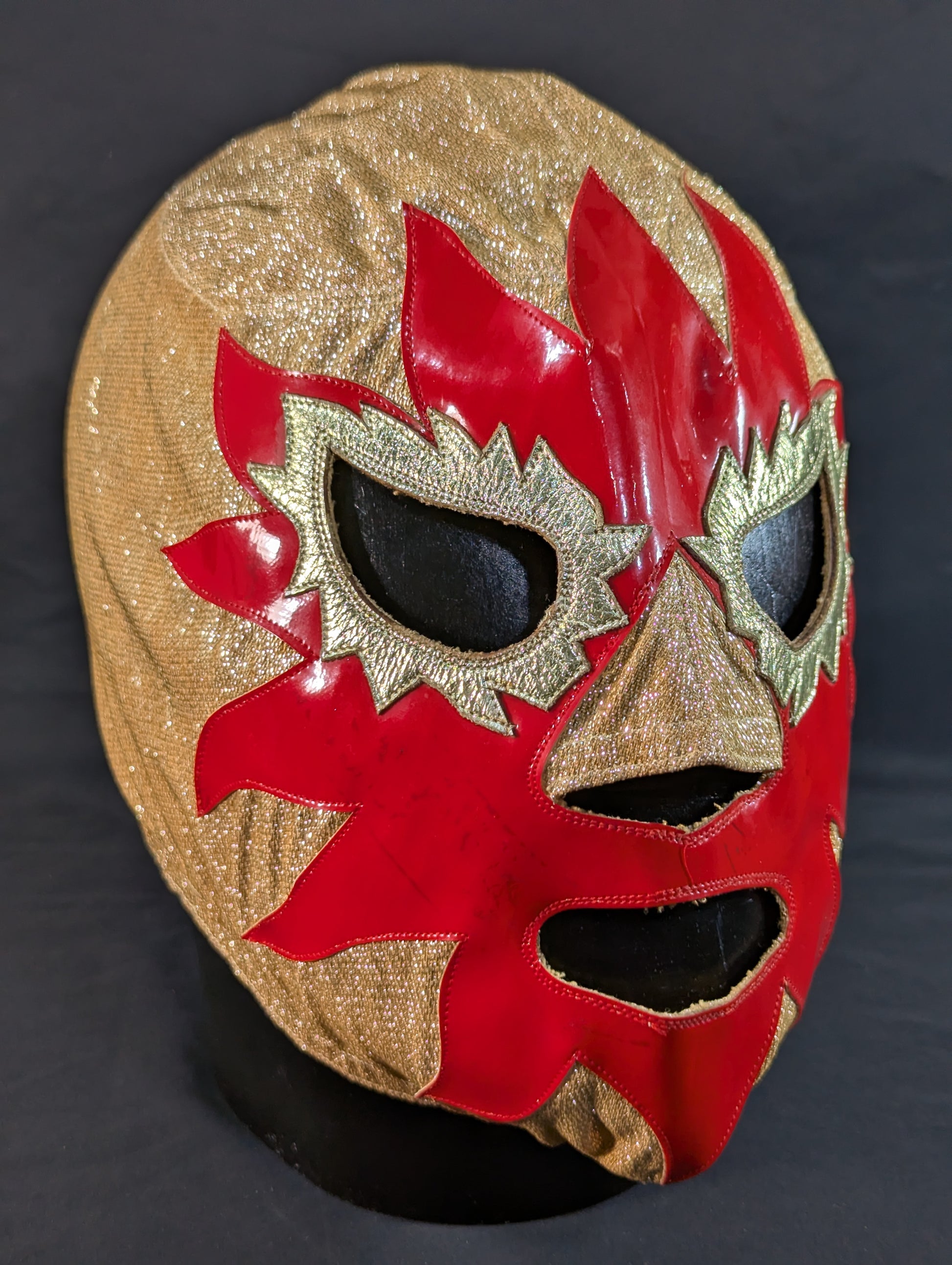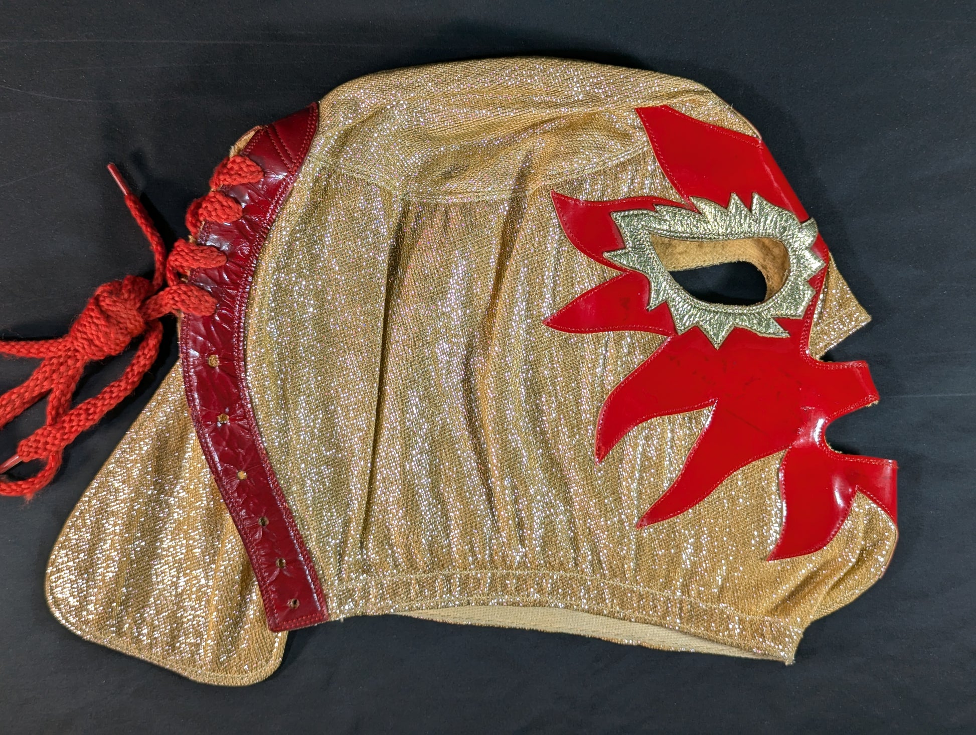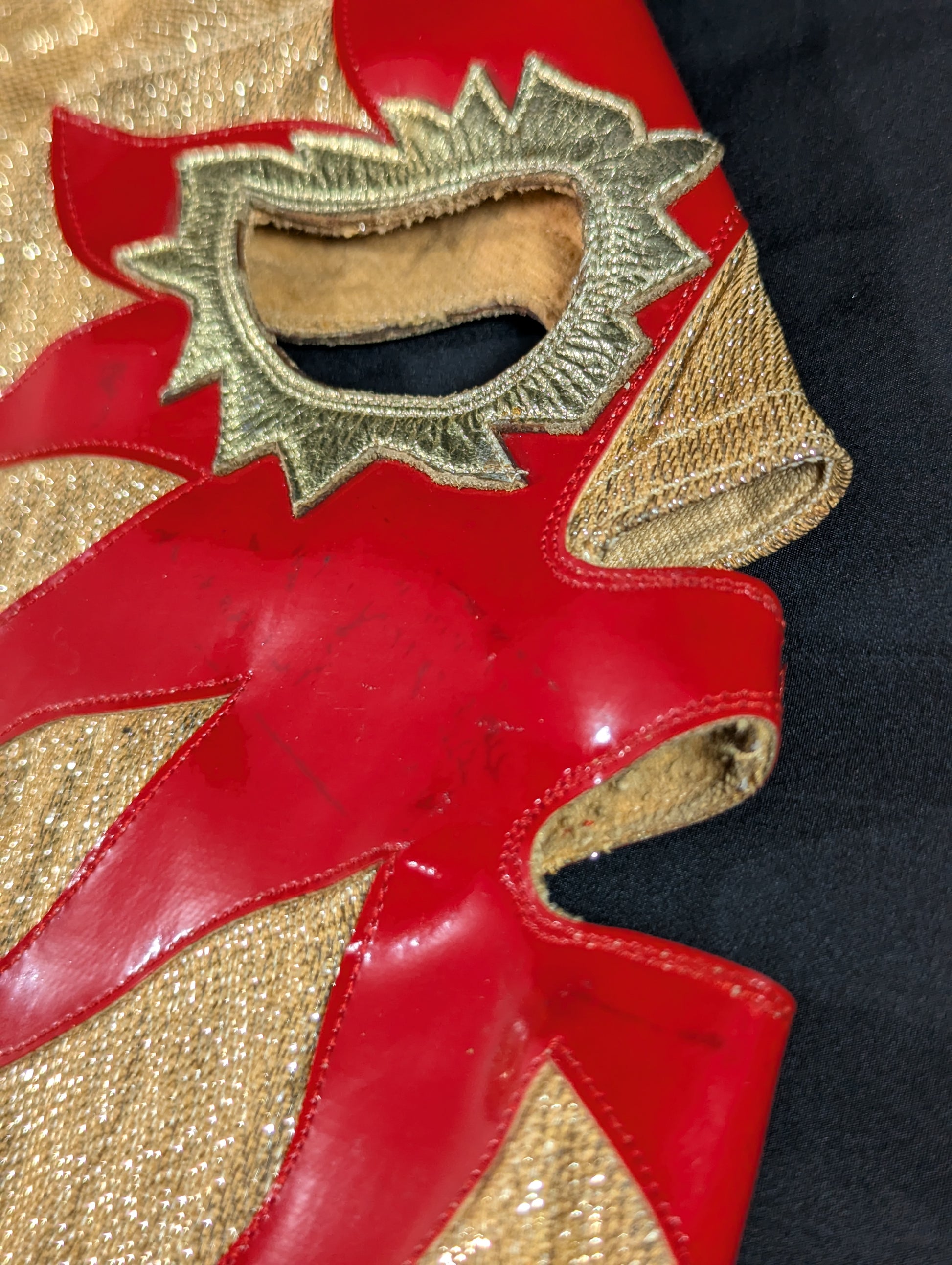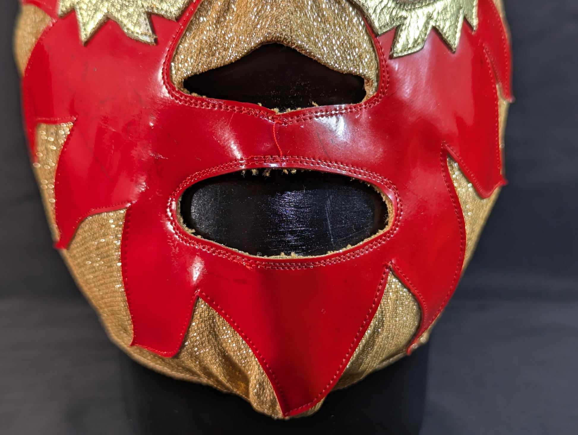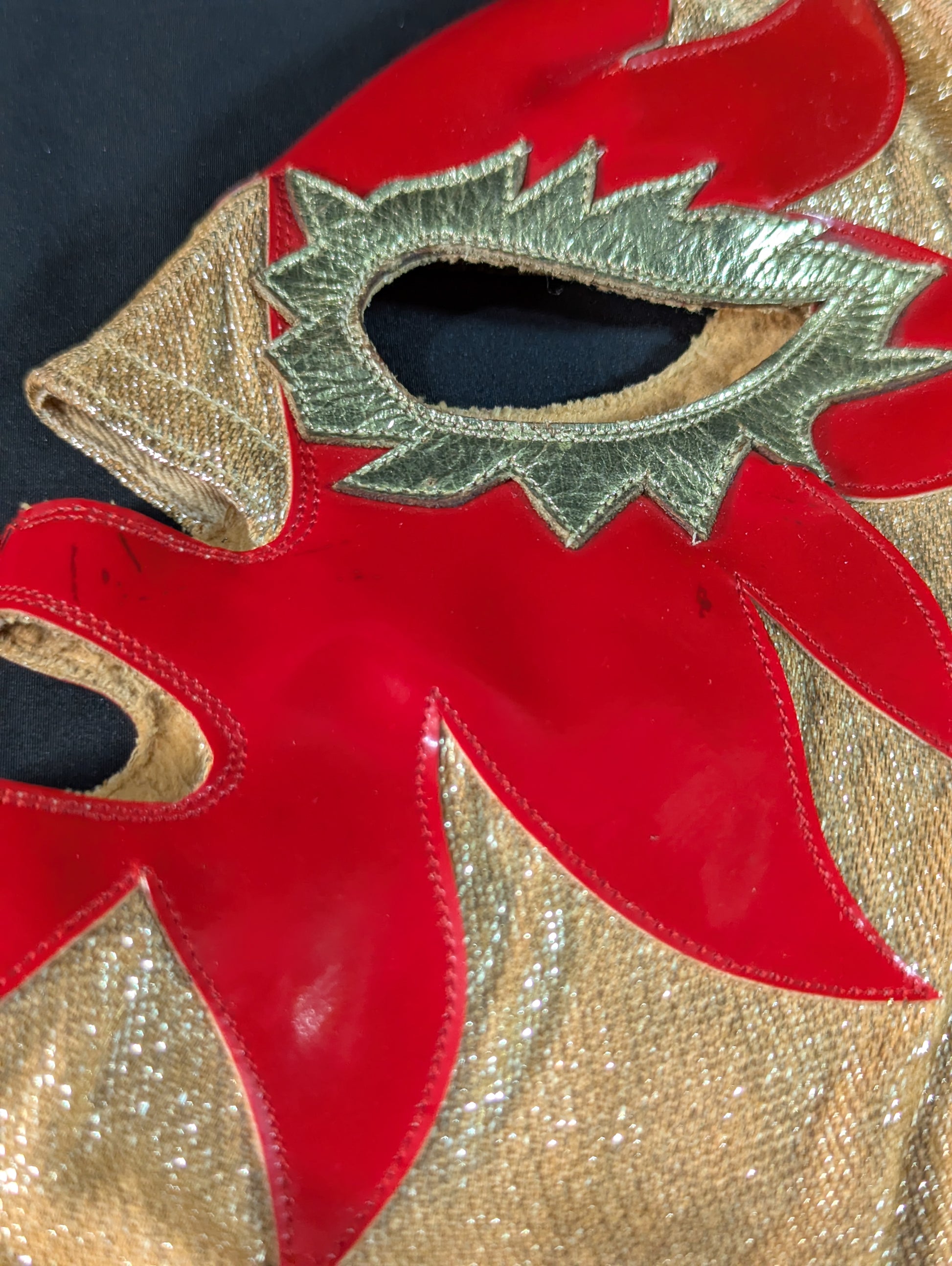 ★本人実使用!! 80年代当時モノ★ 旧金ラメ 赤フチ&金革フチ&濃赤革フチ(紐通し部分) ロングベロで同色の旧ラメと青ジャージ生地 喉テープは縦幅1.4cmの無地の綿素材 縦タグ ~神秘なるマスク芸術~マルチネス編の31ページと同書メキシコ・ルチャリブレ編61ページに掲載されている現物マスク 1981年の新日本プロレス初来日時に本人が持参 1980年代初頭にアントニオ・ウンベルト・マルチネス氏により製作されたもの
