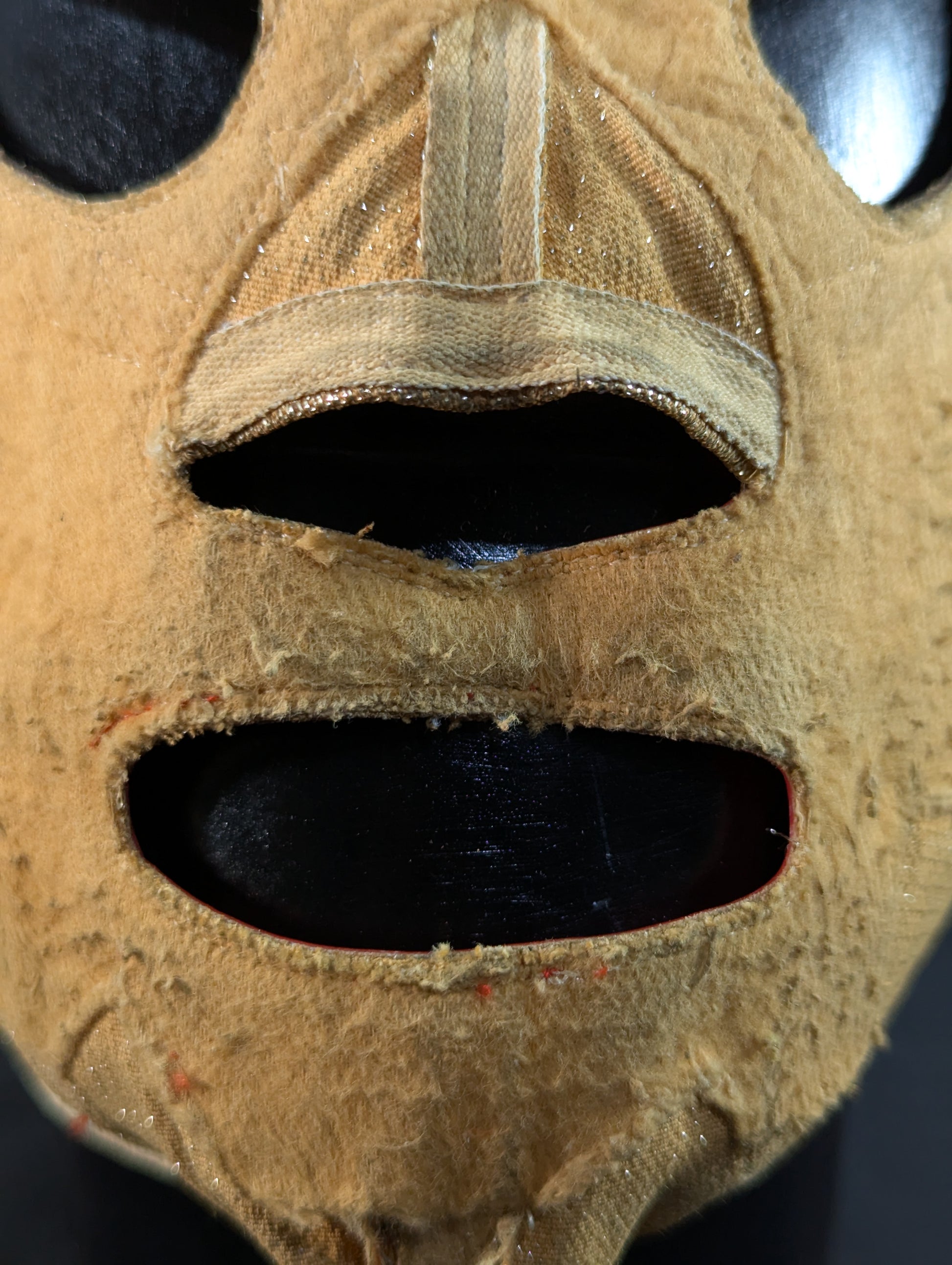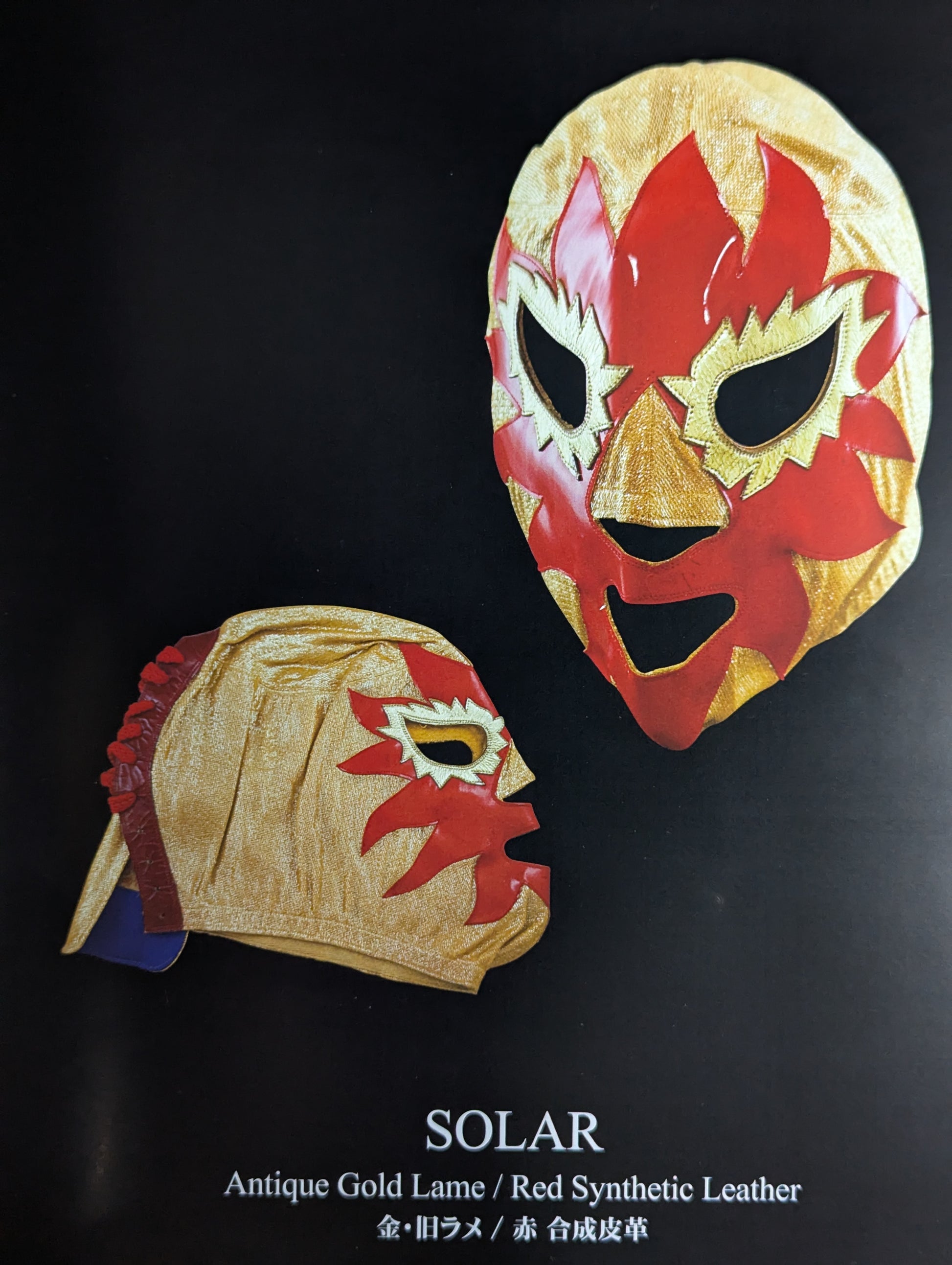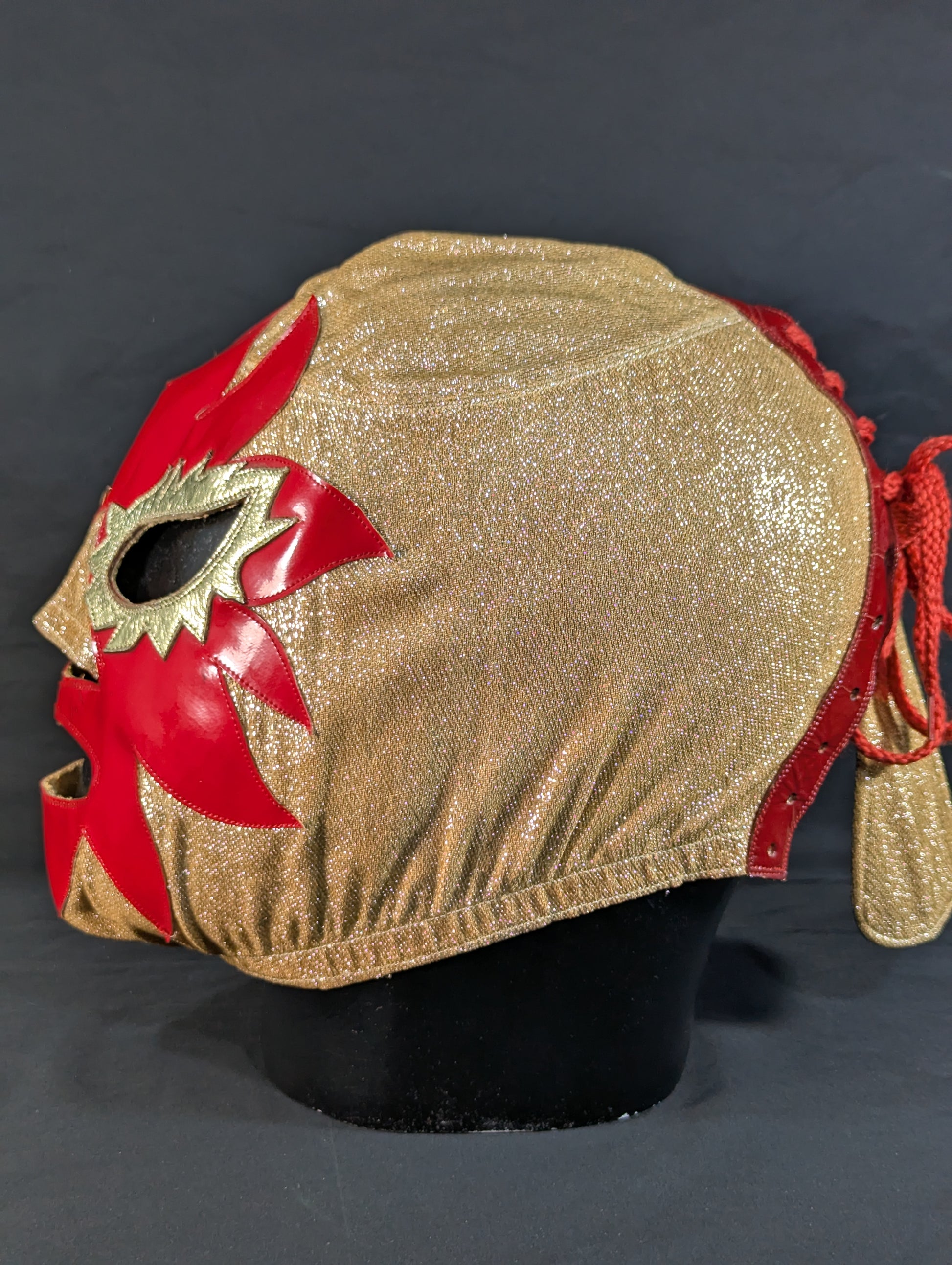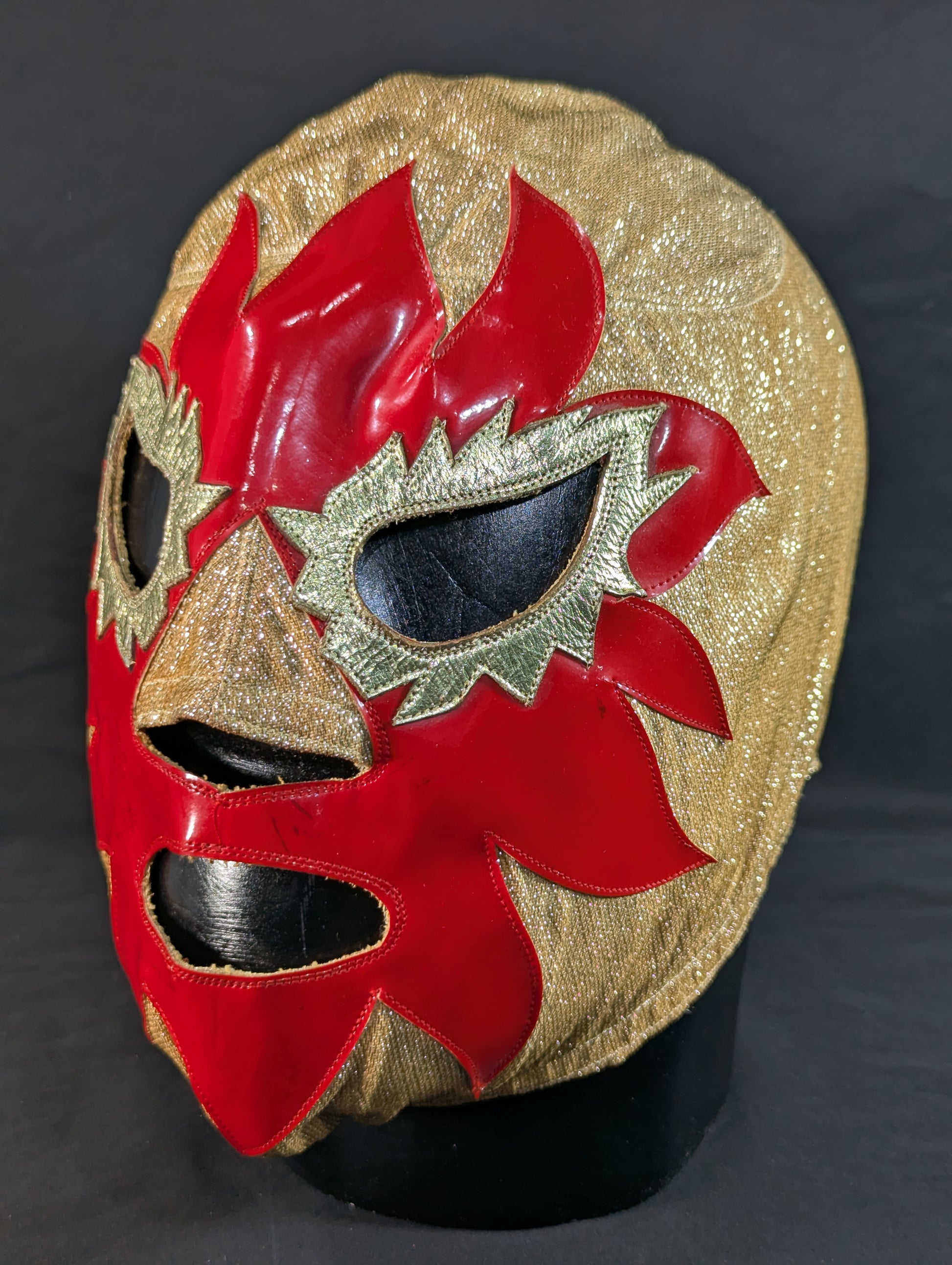 ★本人実使用!! 80年代当時モノ★ 旧金ラメ 赤フチ&金革フチ&濃赤革フチ(紐通し部分) ロングベロで同色の旧ラメと青ジャージ生地 喉テープは縦幅1.4cmの無地の綿素材 縦タグ ~神秘なるマスク芸術~マルチネス編の31ページと同書メキシコ・ルチャリブレ編61ページに掲載されている現物マスク 1981年の新日本プロレス初来日時に本人が持参 1980年代初頭にアントニオ・ウンベルト・マルチネス氏により製作されたもの
