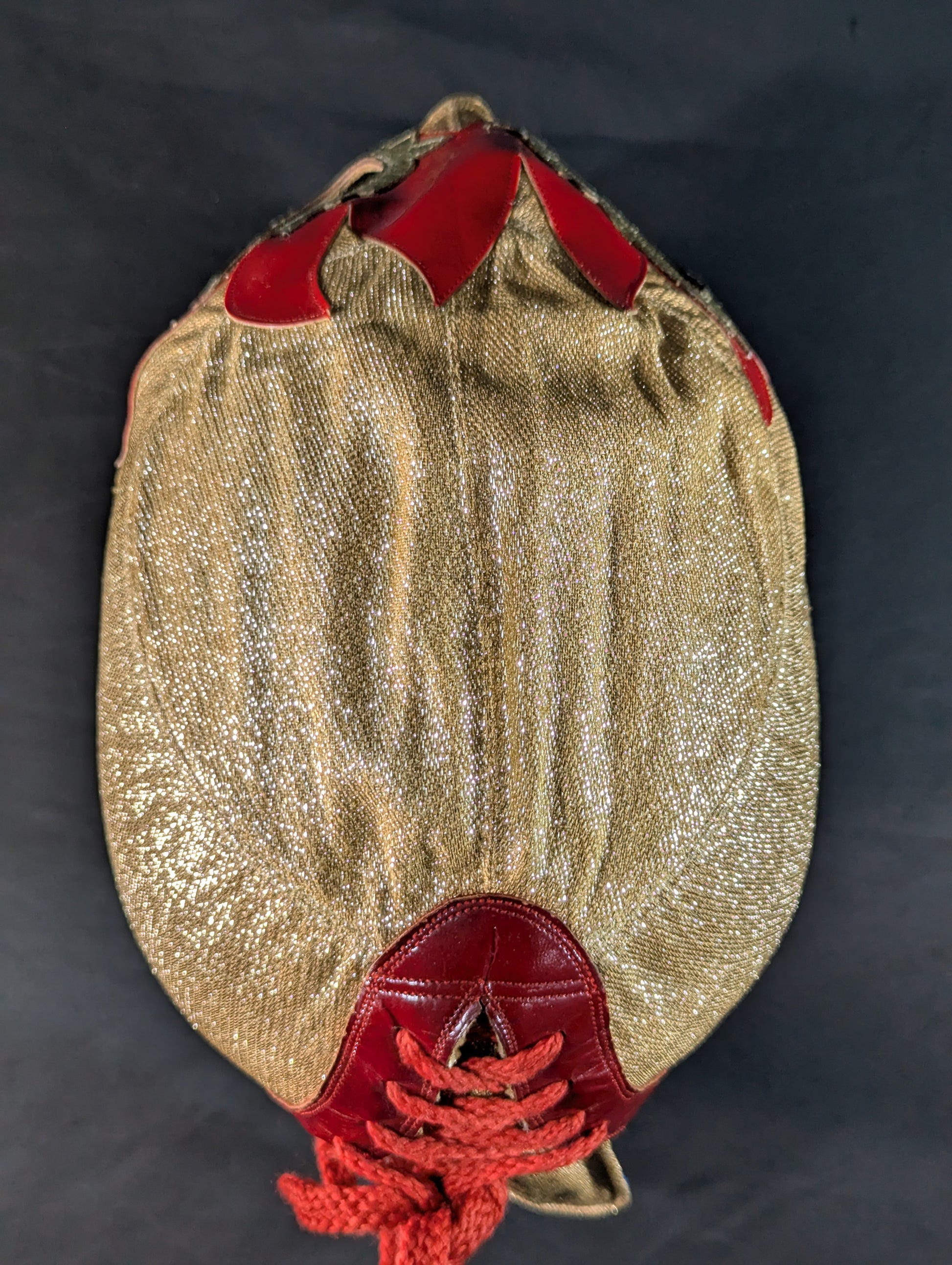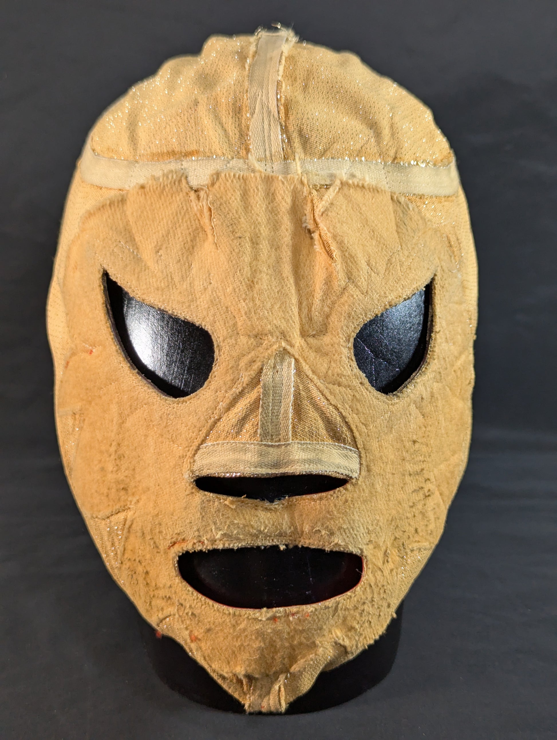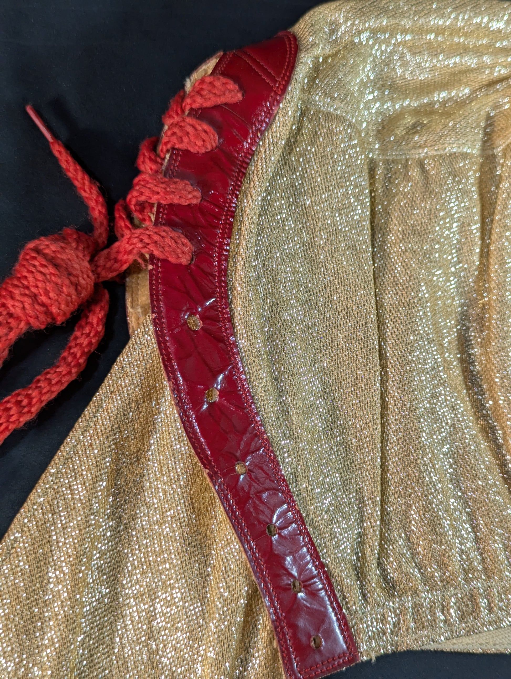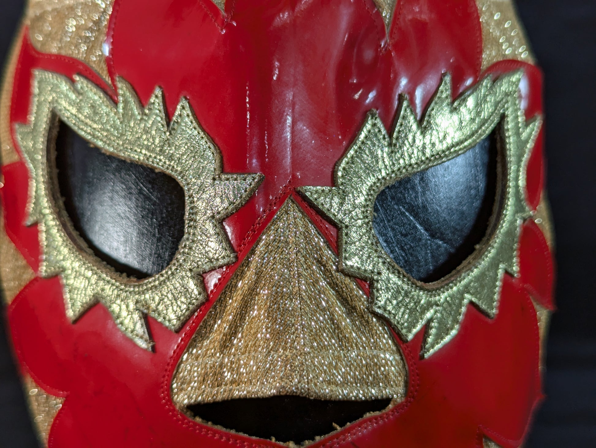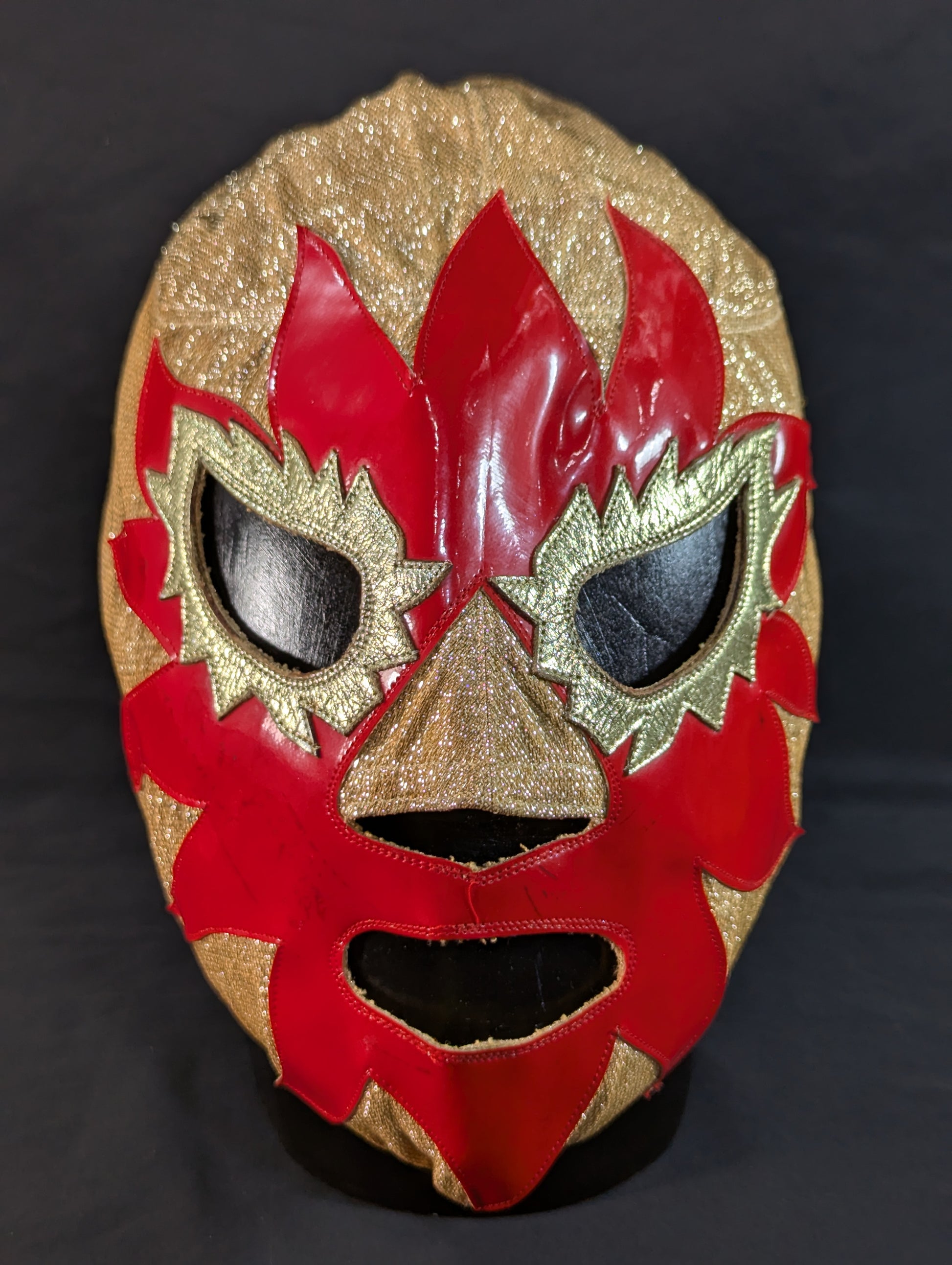 ★本人実使用!! 80年代当時モノ★ 旧金ラメ 赤フチ&金革フチ&濃赤革フチ(紐通し部分) ロングベロで同色の旧ラメと青ジャージ生地 喉テープは縦幅1.4cmの無地の綿素材 縦タグ ~神秘なるマスク芸術~マルチネス編の31ページと同書メキシコ・ルチャリブレ編61ページに掲載されている現物マスク 1981年の新日本プロレス初来日時に本人が持参 1980年代初頭にアントニオ・ウンベルト・マルチネス氏により製作されたもの