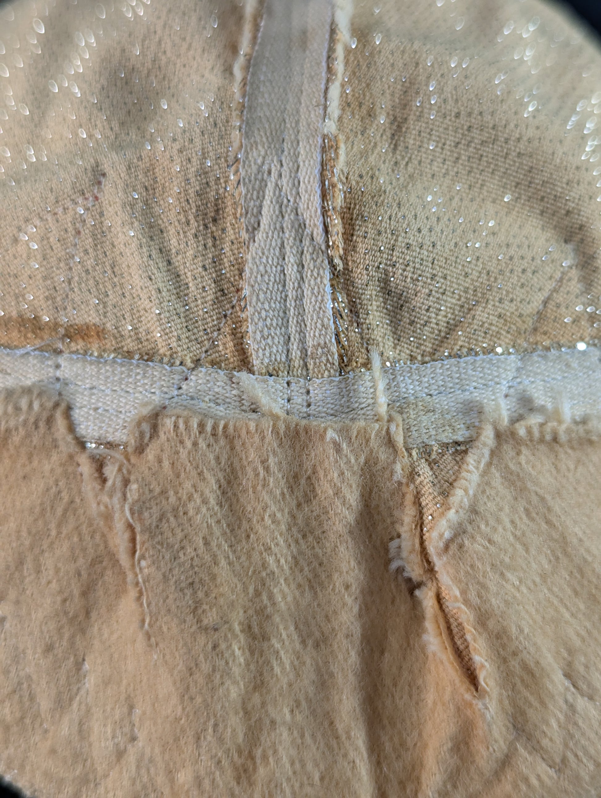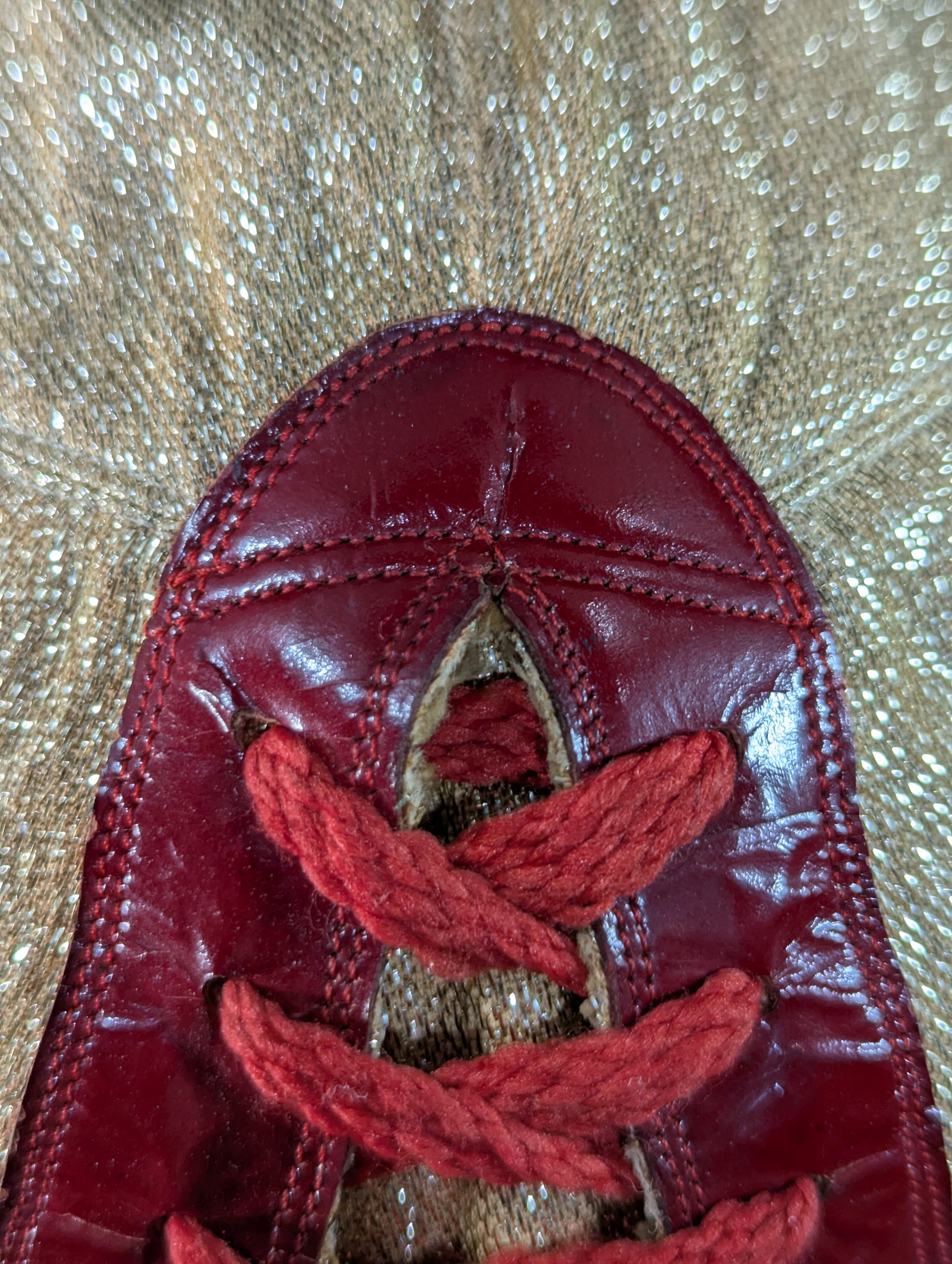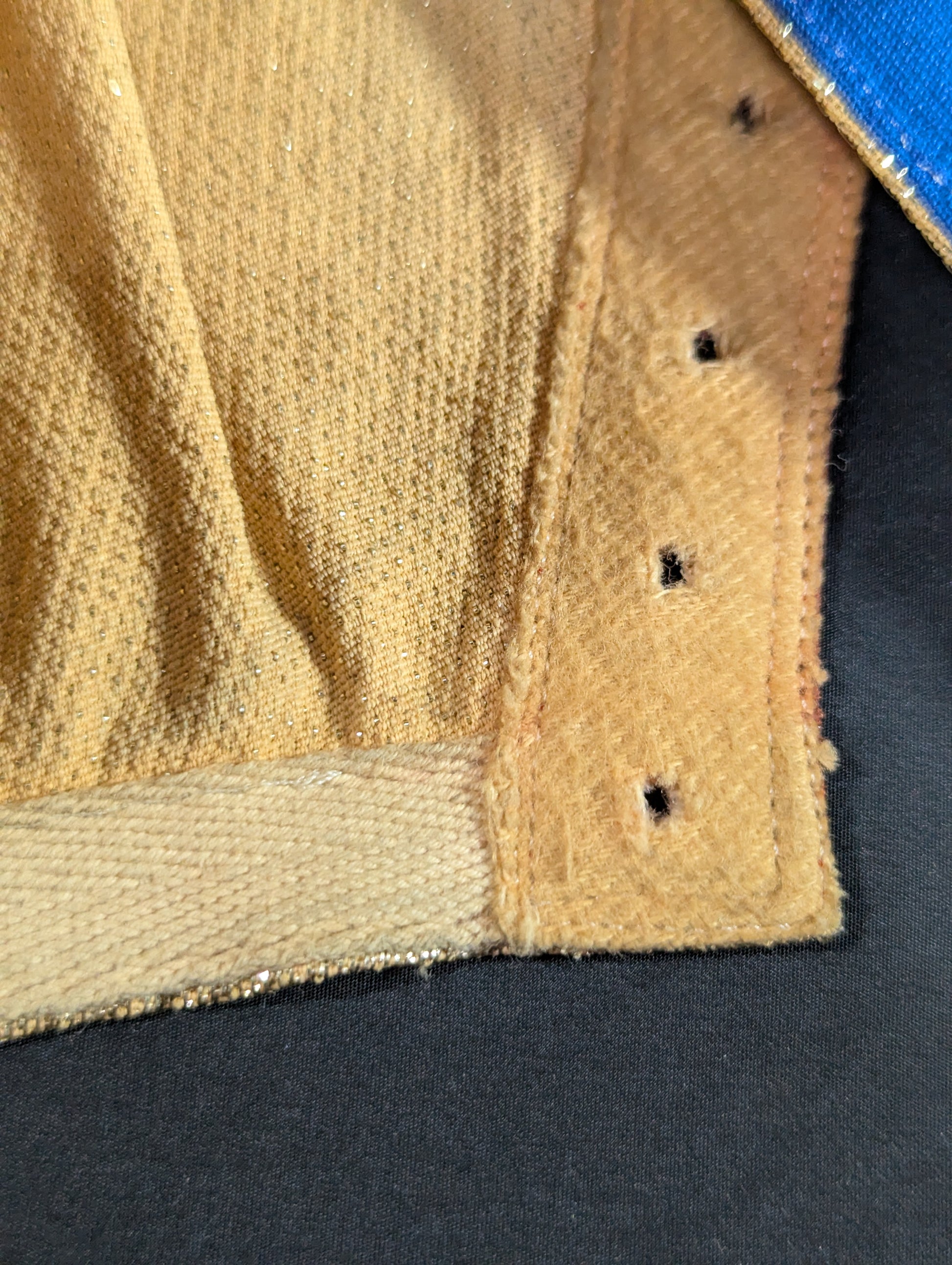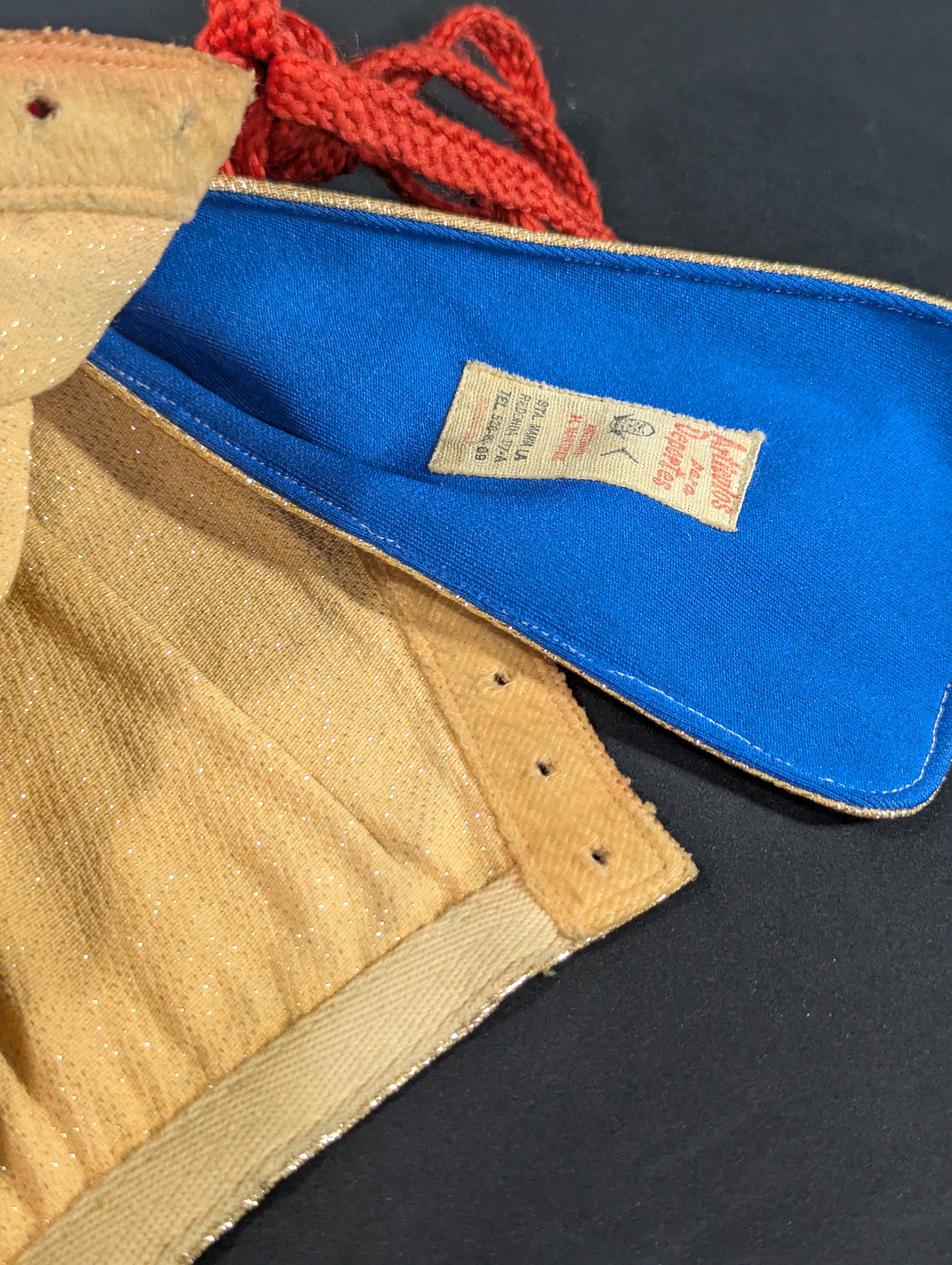 ★本人実使用!! 80年代当時モノ★ 旧金ラメ 赤フチ&金革フチ&濃赤革フチ(紐通し部分) ロングベロで同色の旧ラメと青ジャージ生地 喉テープは縦幅1.4cmの無地の綿素材 縦タグ ~神秘なるマスク芸術~マルチネス編の31ページと同書メキシコ・ルチャリブレ編61ページに掲載されている現物マスク 1981年の新日本プロレス初来日時に本人が持参 1980年代初頭にアントニオ・ウンベルト・マルチネス氏により製作されたもの