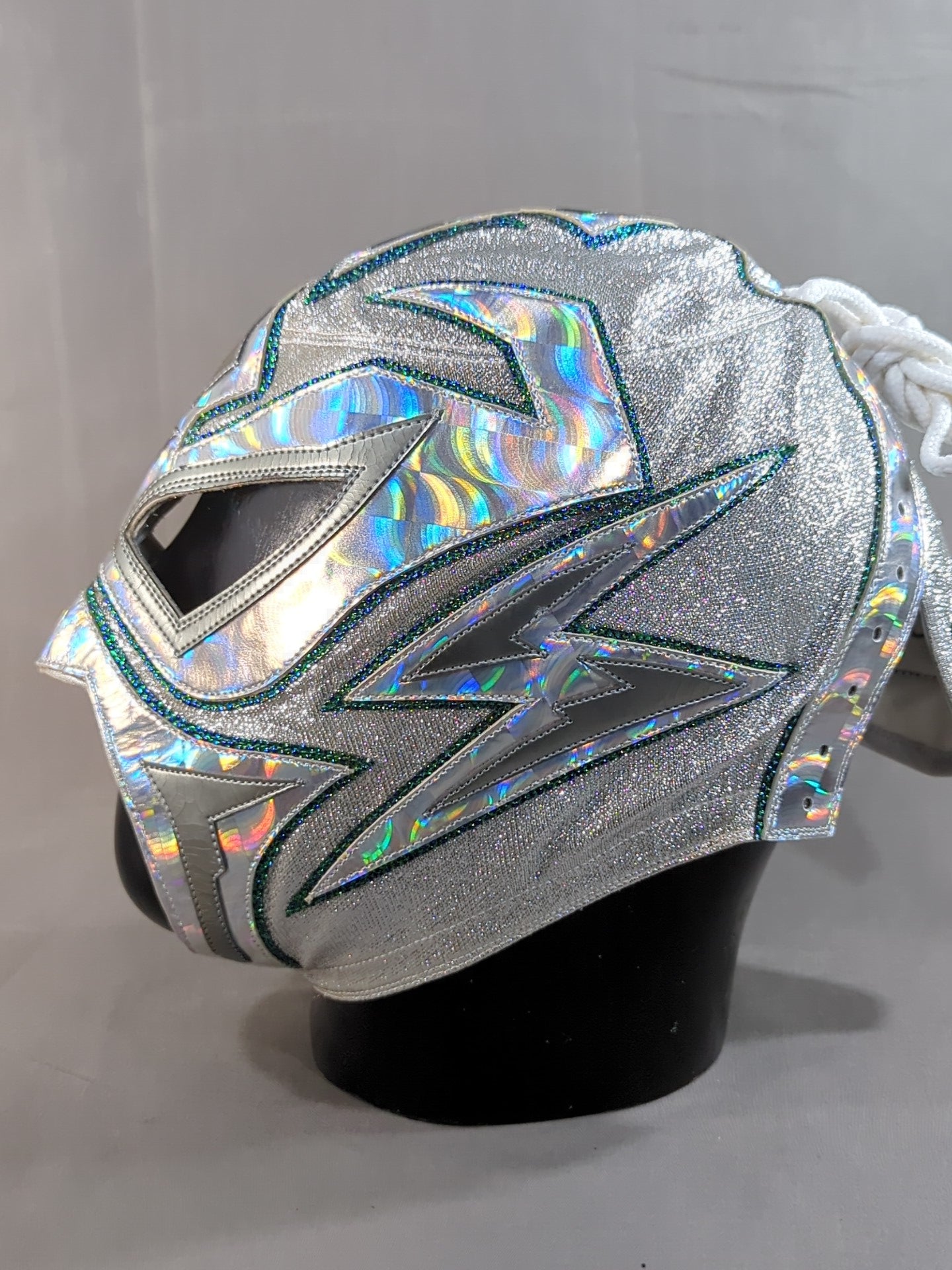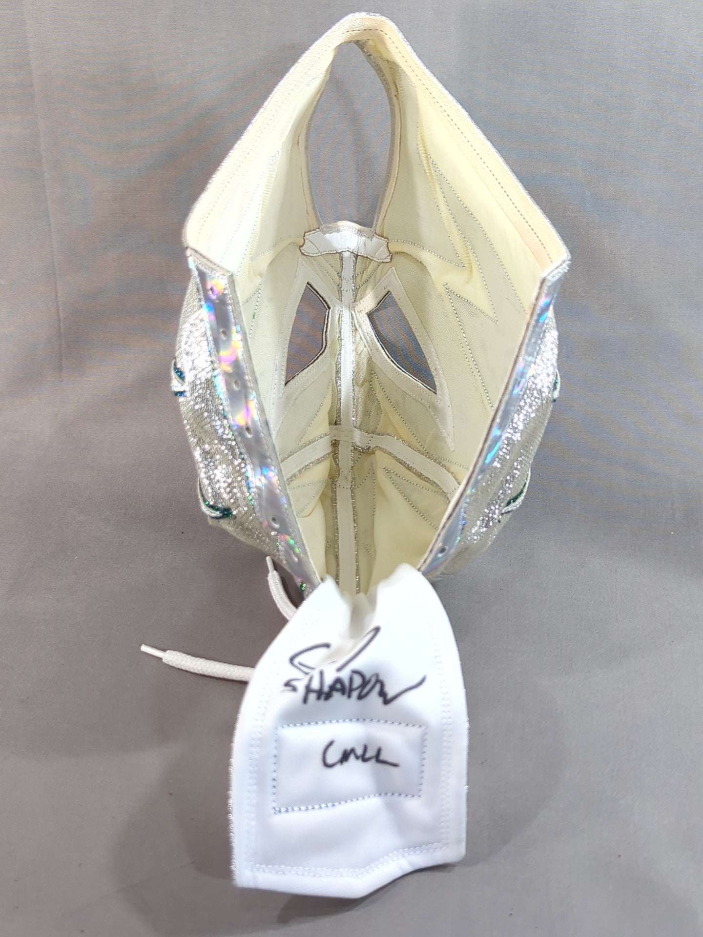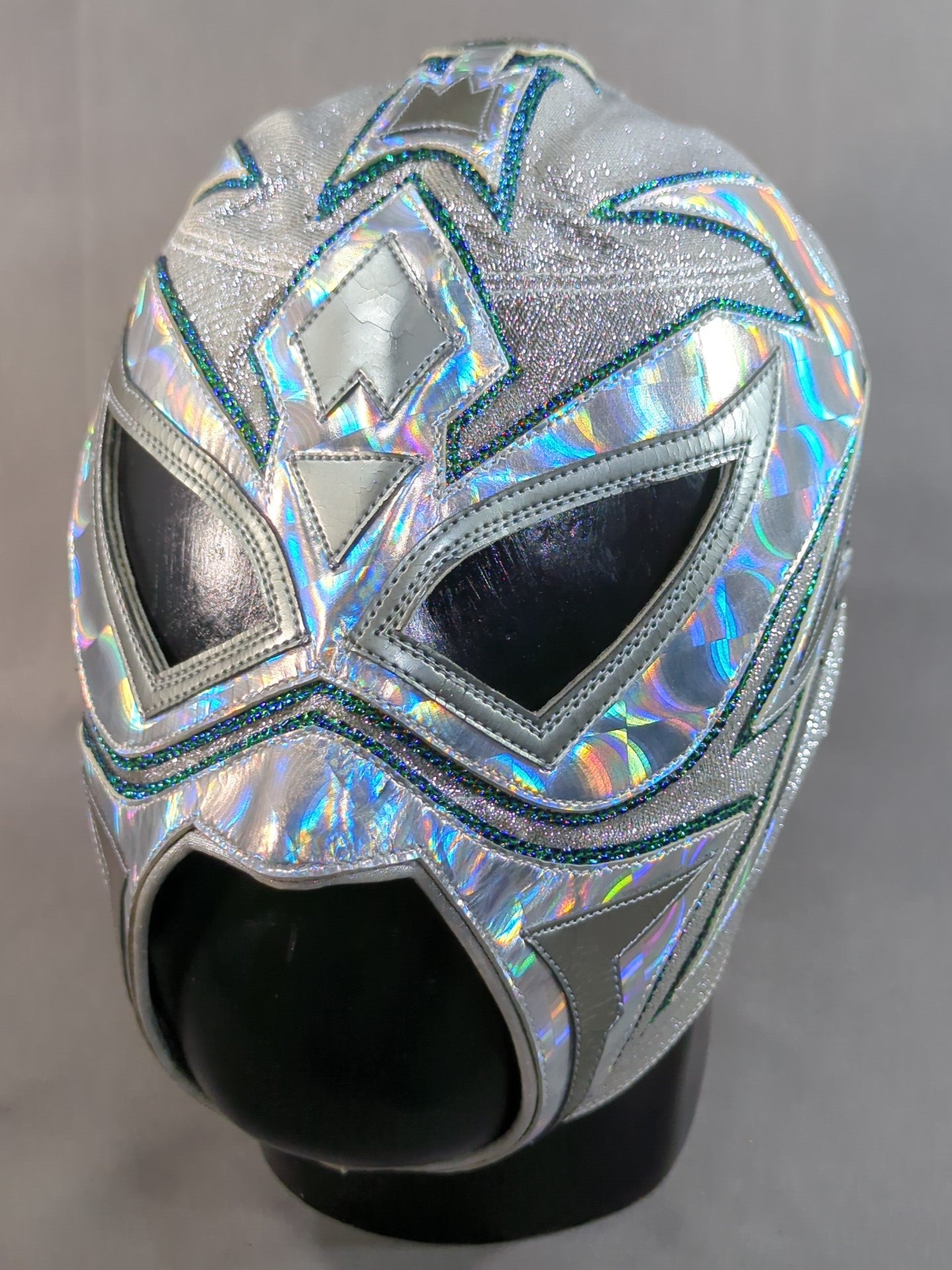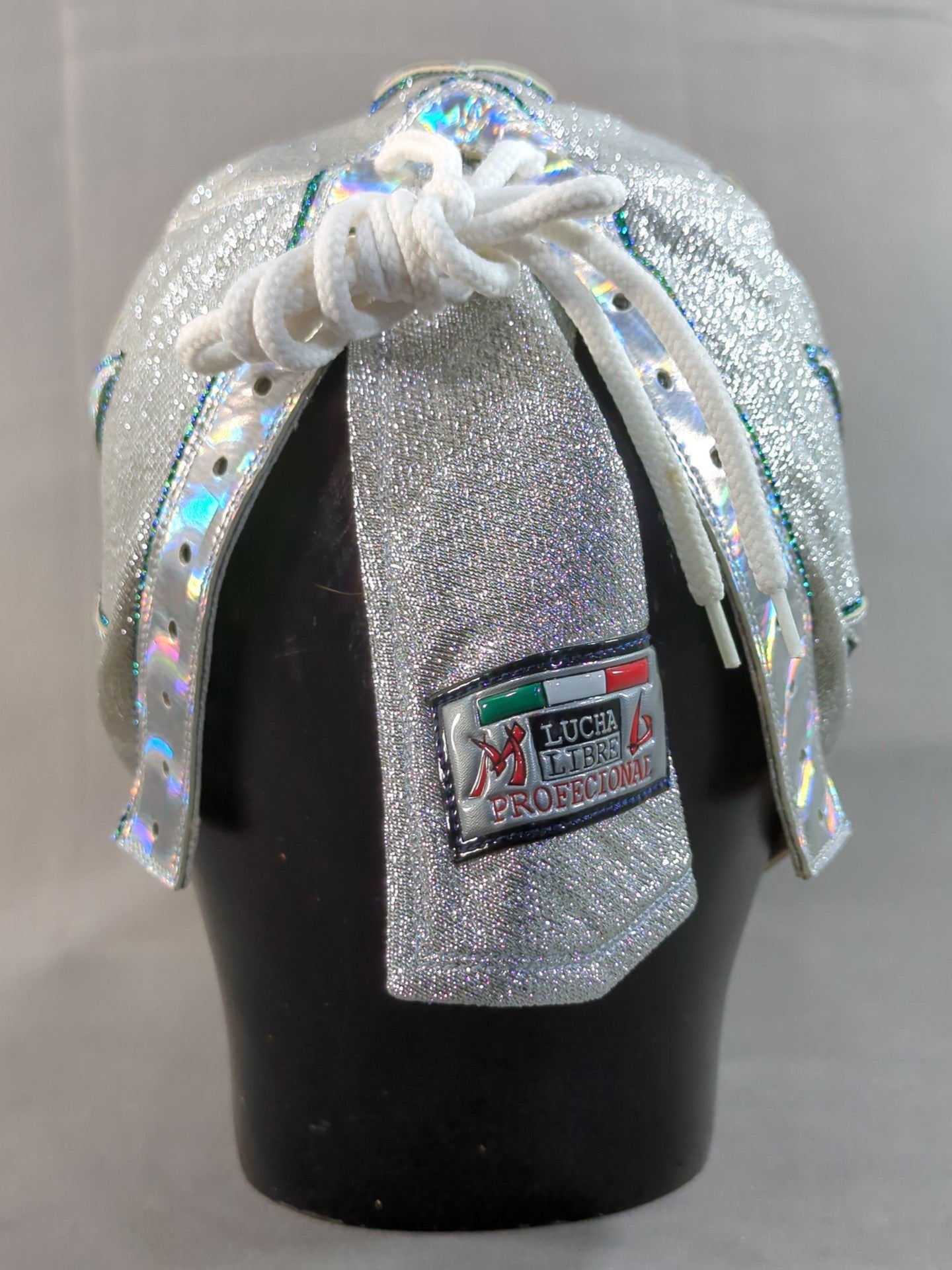 サイン入り(CMLL) 銀ラメ2重生地(メッシュ張り) 青緑特殊地銀特殊革フチ&銀フチ