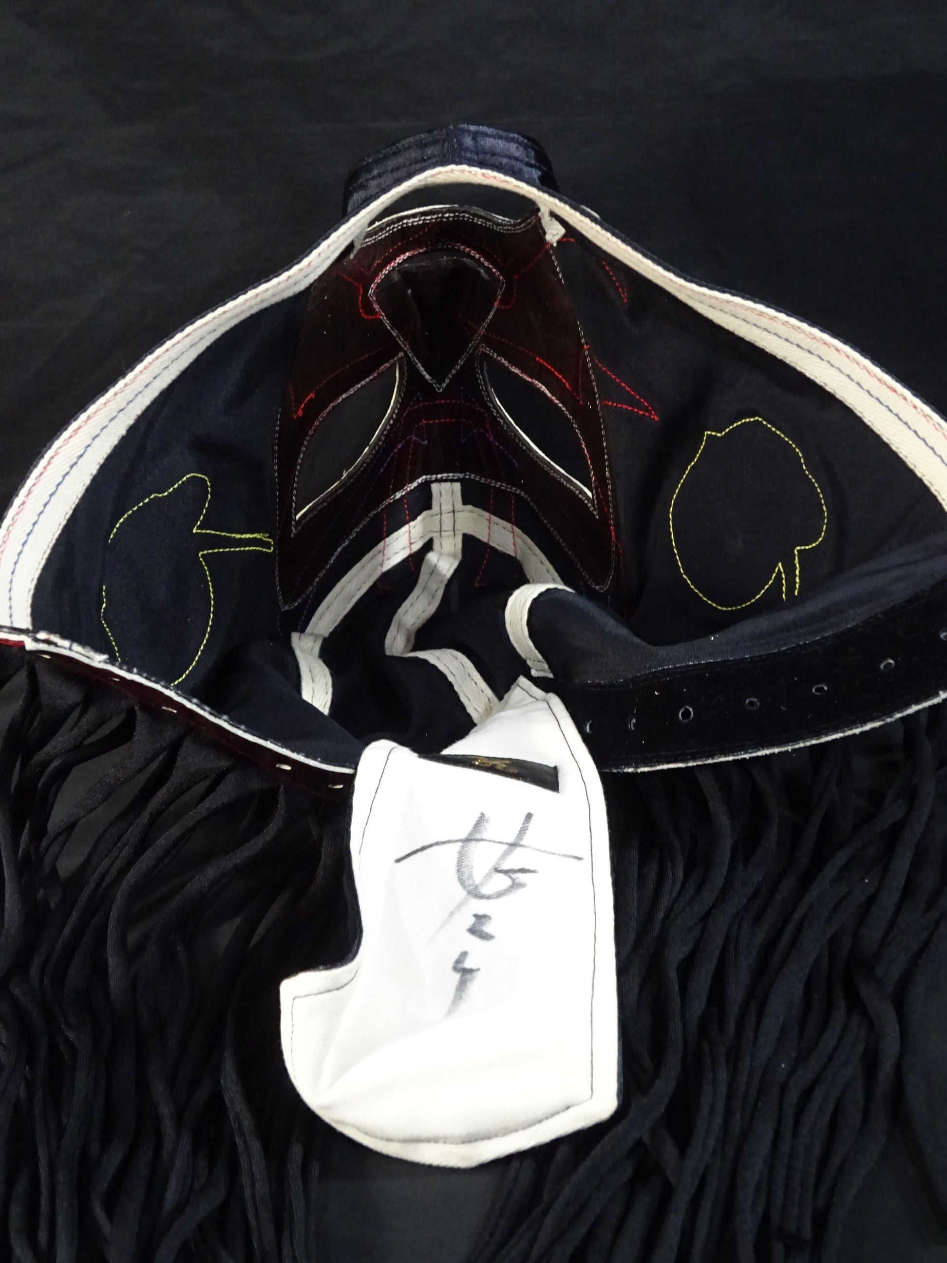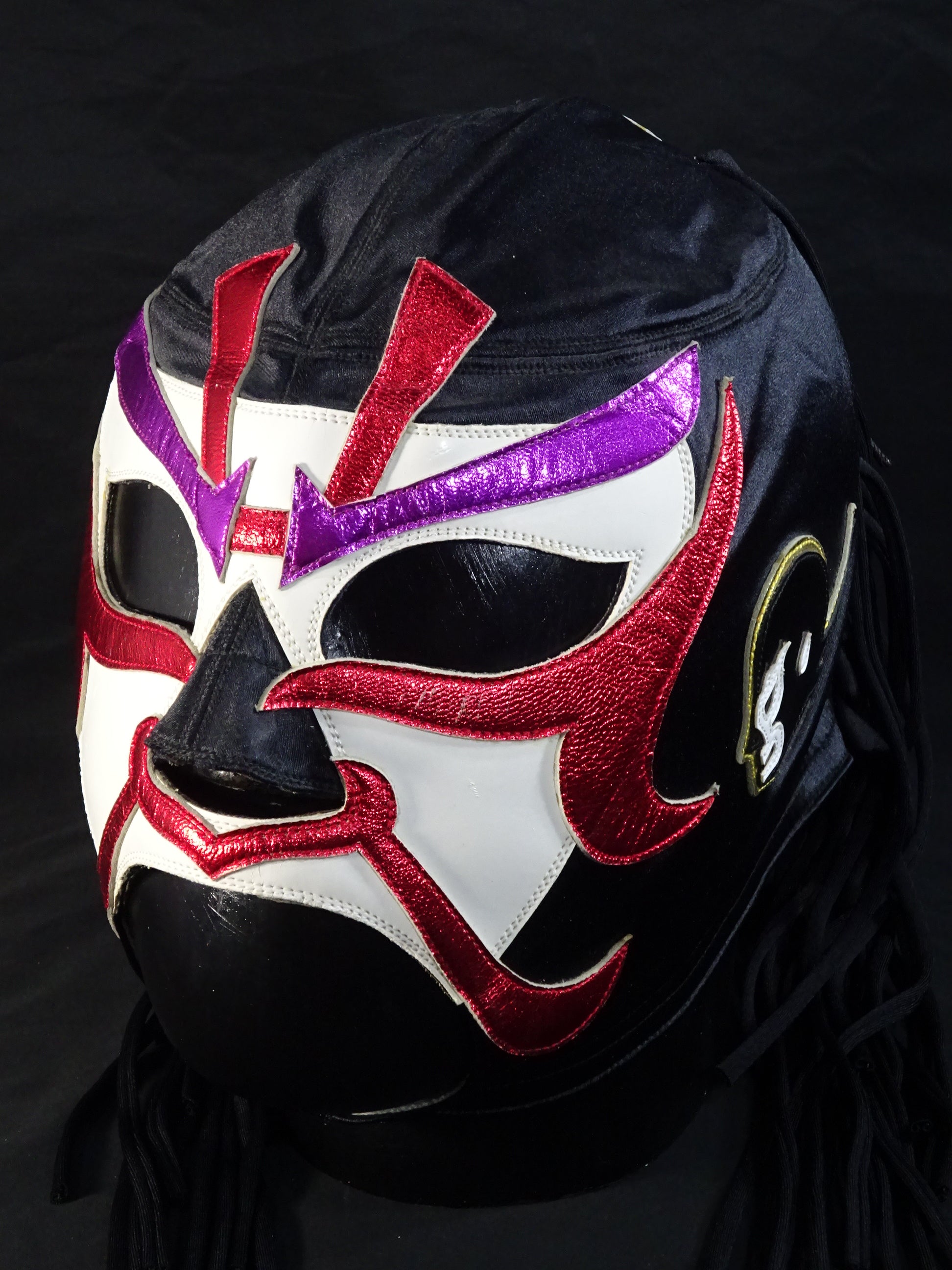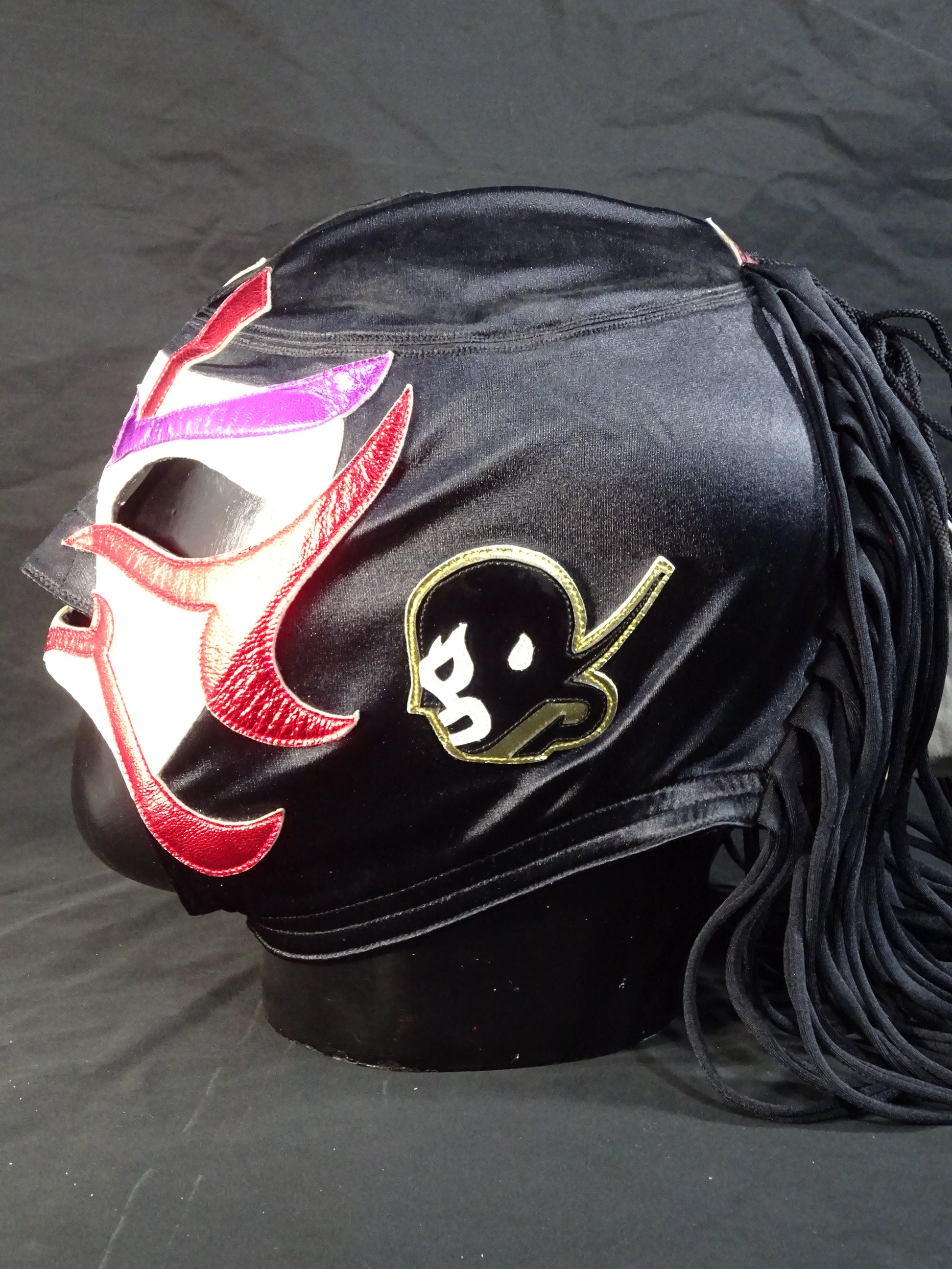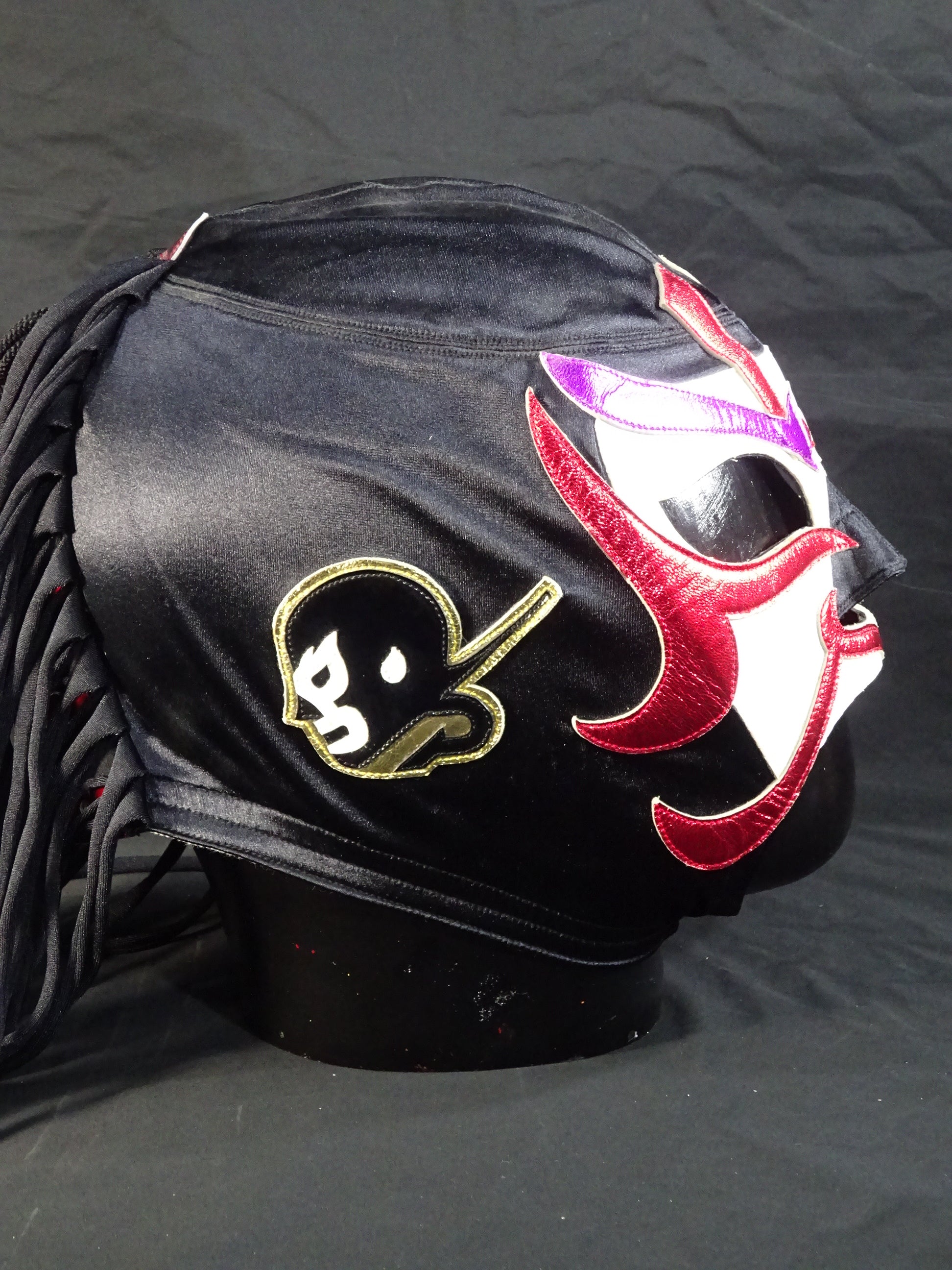 サイン入り 黒サテン生地 白フチ&赤メタリック革フチ&紫メタリック革眉