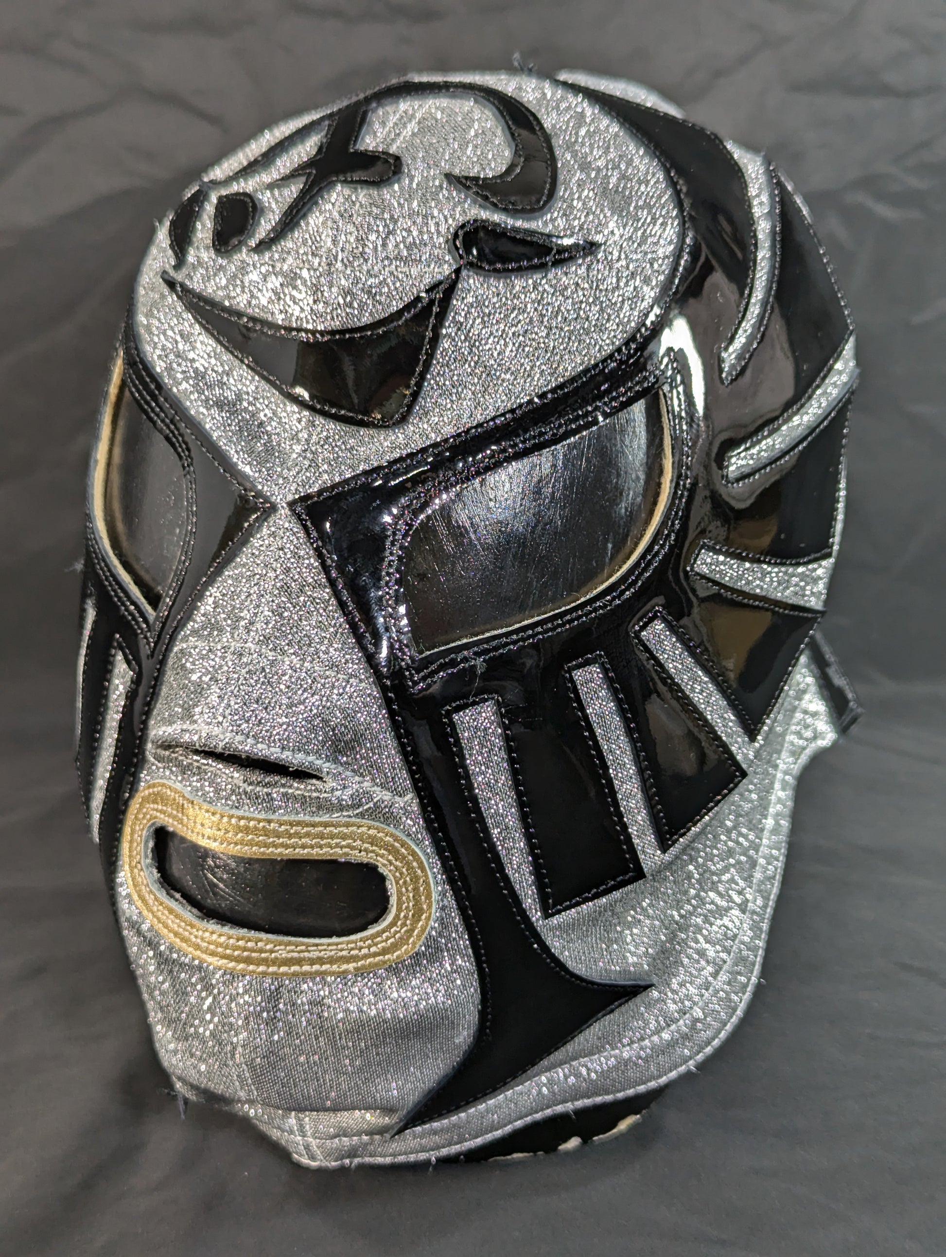★1983.11.3 蔵前デビュー戦「忍」タイプ★ 直筆サイン入り 保証証明書と着用写真付 銀ラメ2重生地 黒革フチ&シャンパンゴールド革フチ 「ザ・コブラHISTORY ザ・コブラこそが、日本マスク市場の生みの親。メキシコから持ちかえったザ・コブラのマスクを解体し、日本のマスク市場が立ち上がった」(byザ・コブラプロデュース事務局)