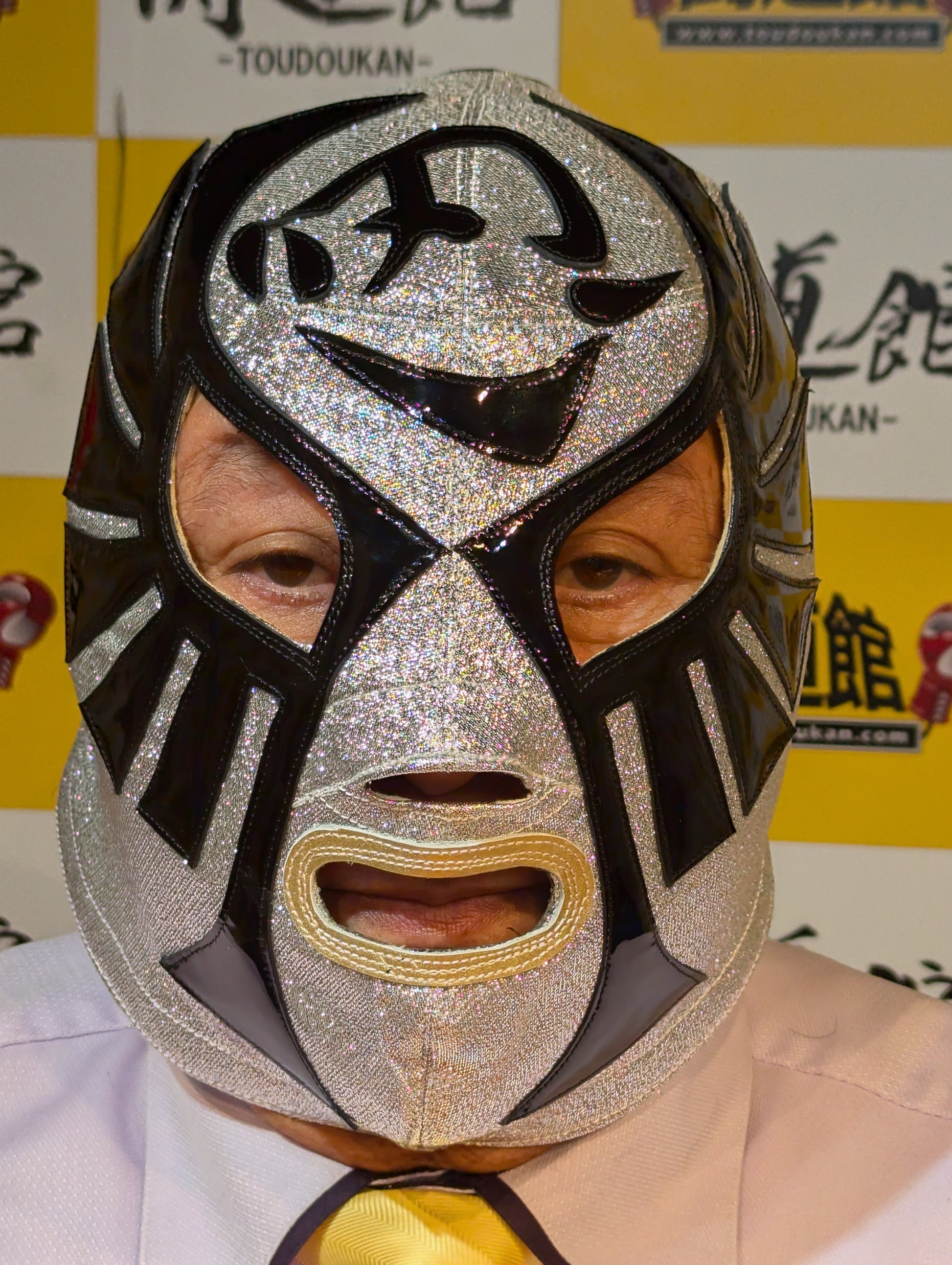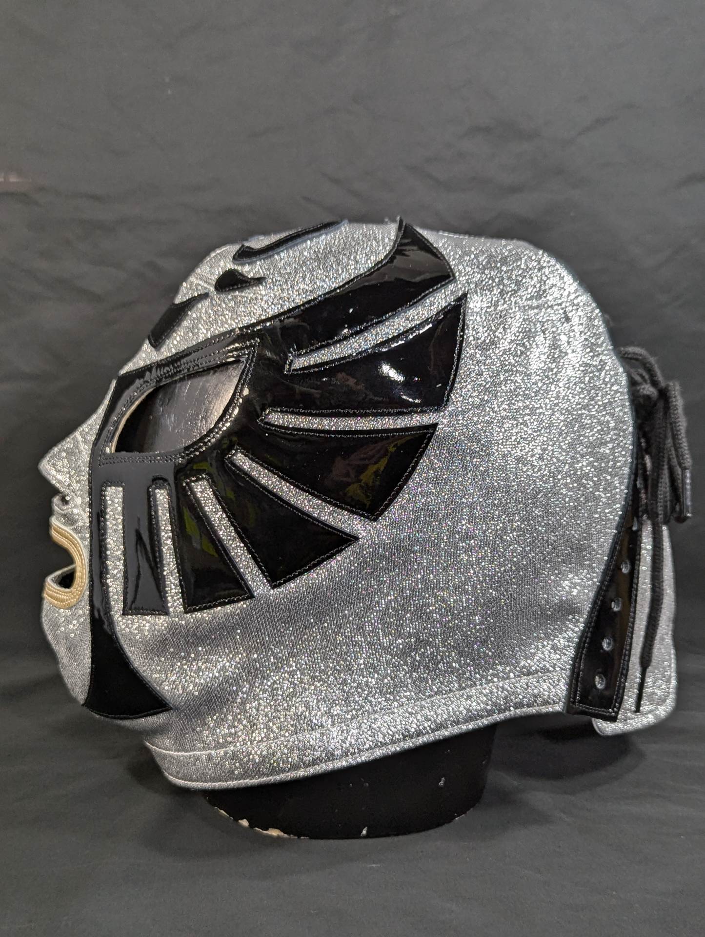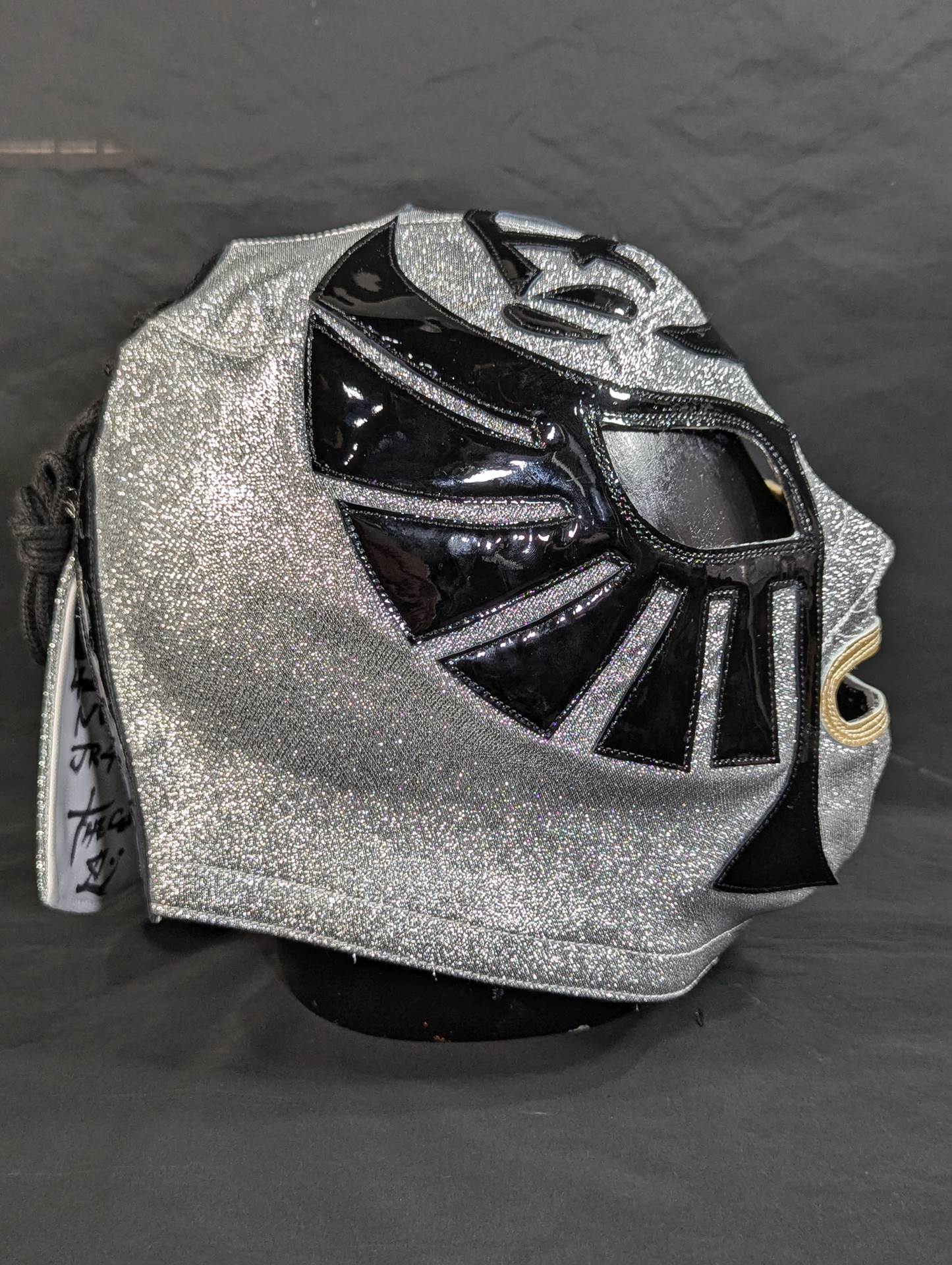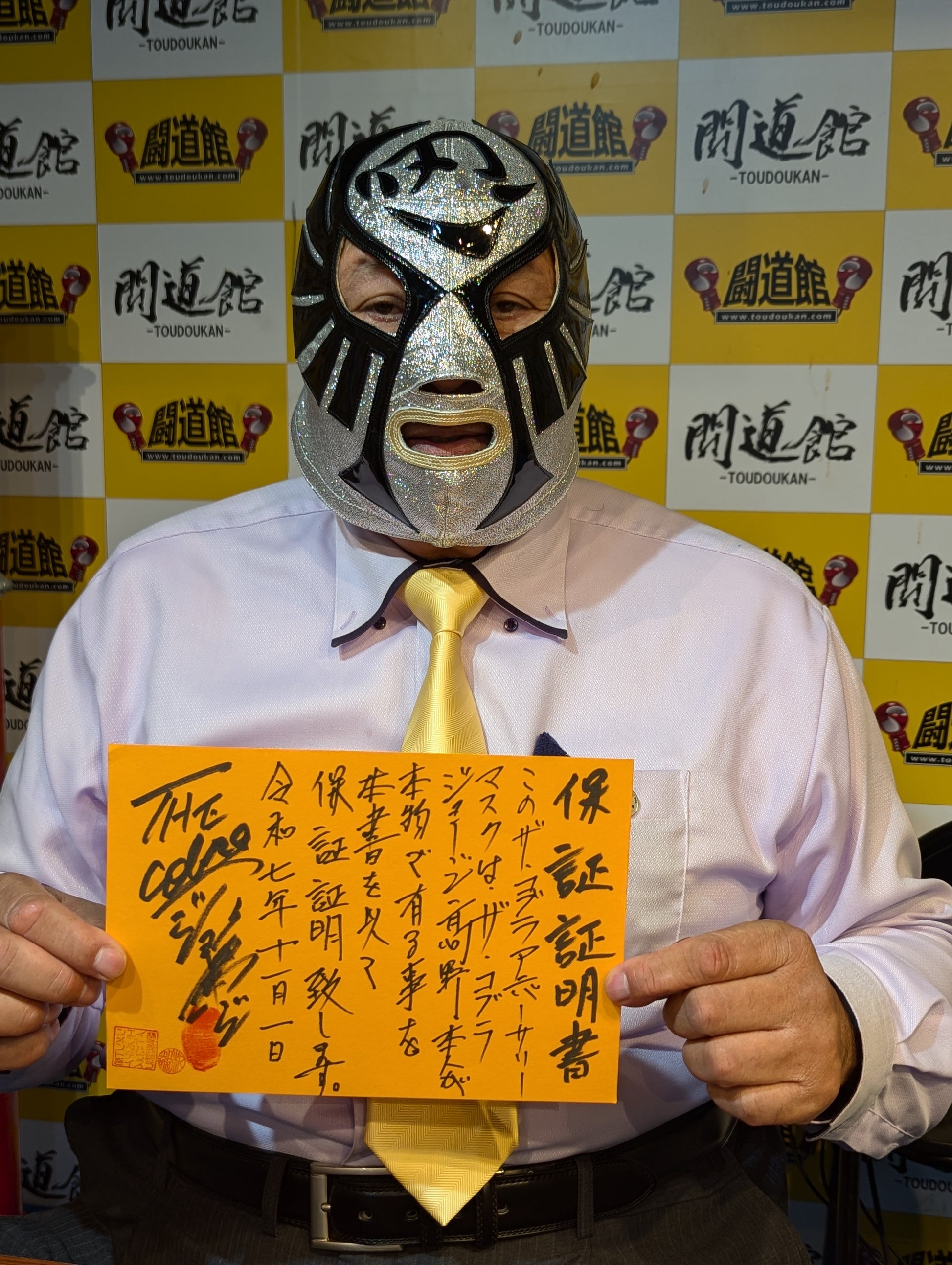 ★1983.11.3 蔵前デビュー戦「忍」タイプ★ 直筆サイン入り 保証証明書と着用写真付 銀ラメ2重生地 黒革フチ&シャンパンゴールド革フチ 「ザ・コブラHISTORY ザ・コブラこそが、日本マスク市場の生みの親。メキシコから持ちかえったザ・コブラのマスクを解体し、日本のマスク市場が立ち上がった」(byザ・コブラプロデュース事務局)