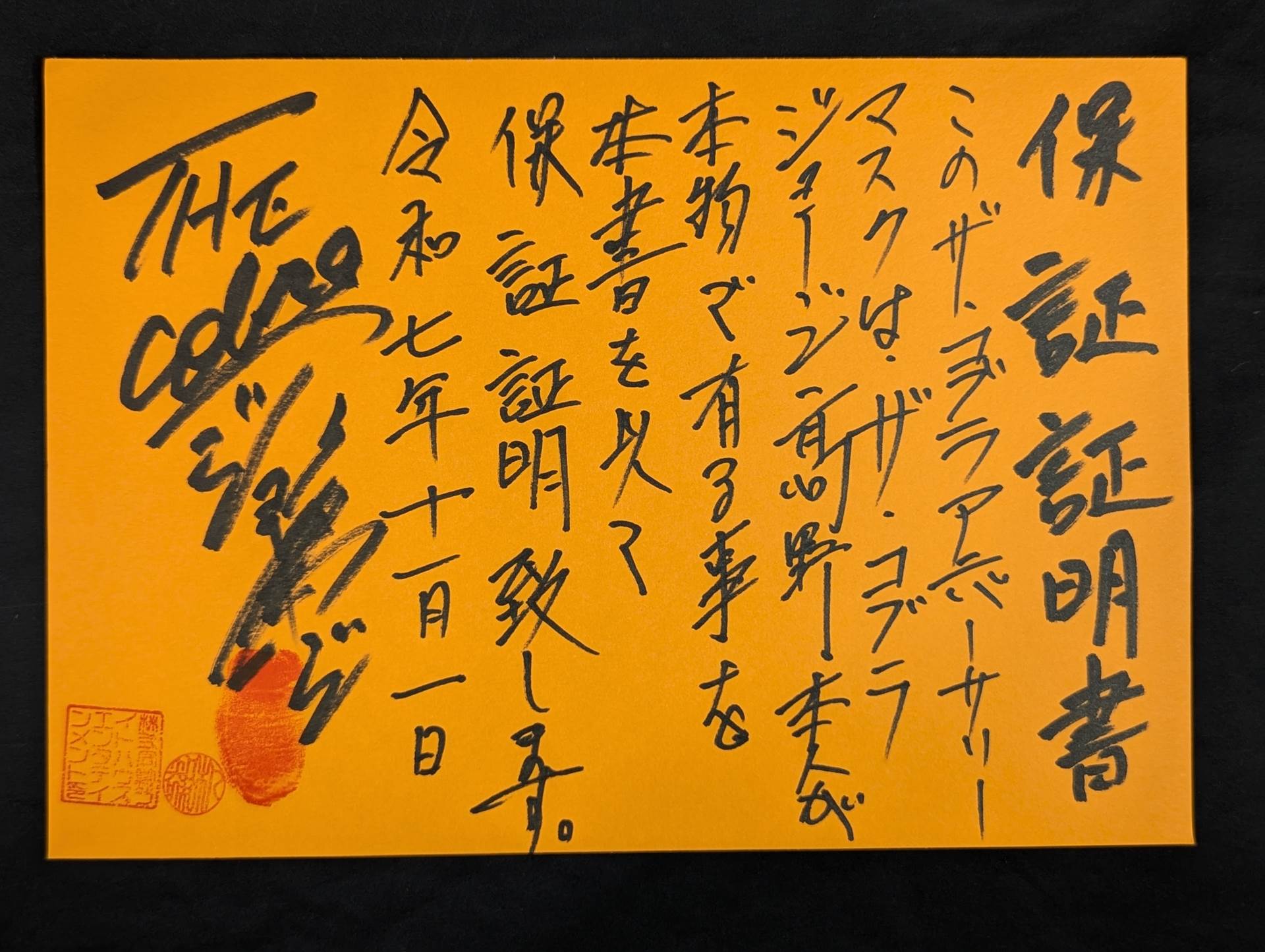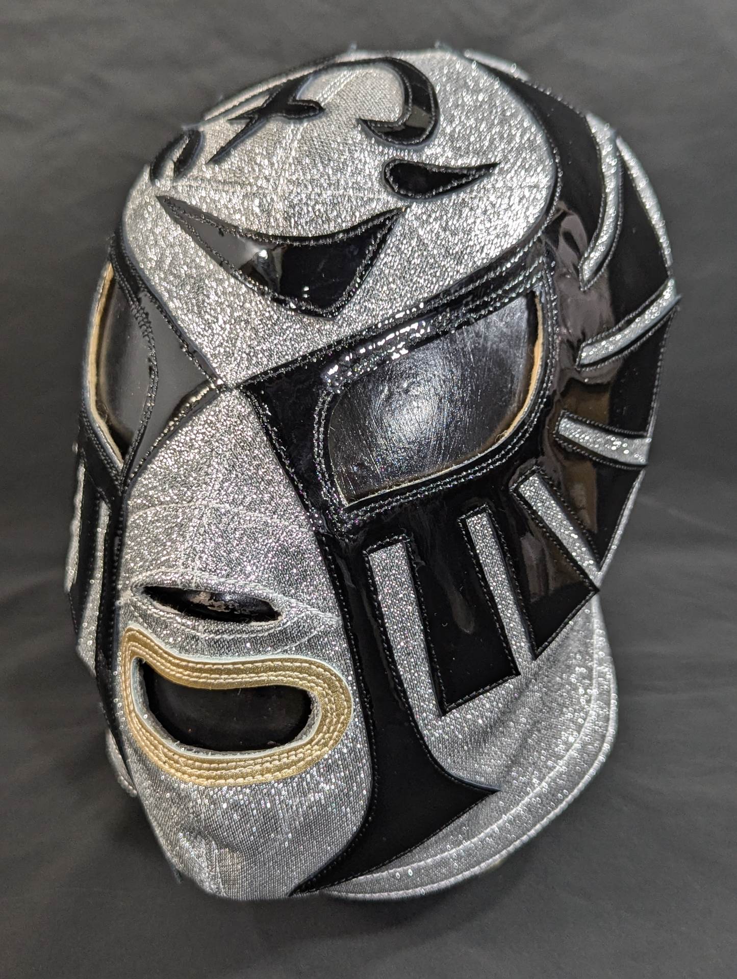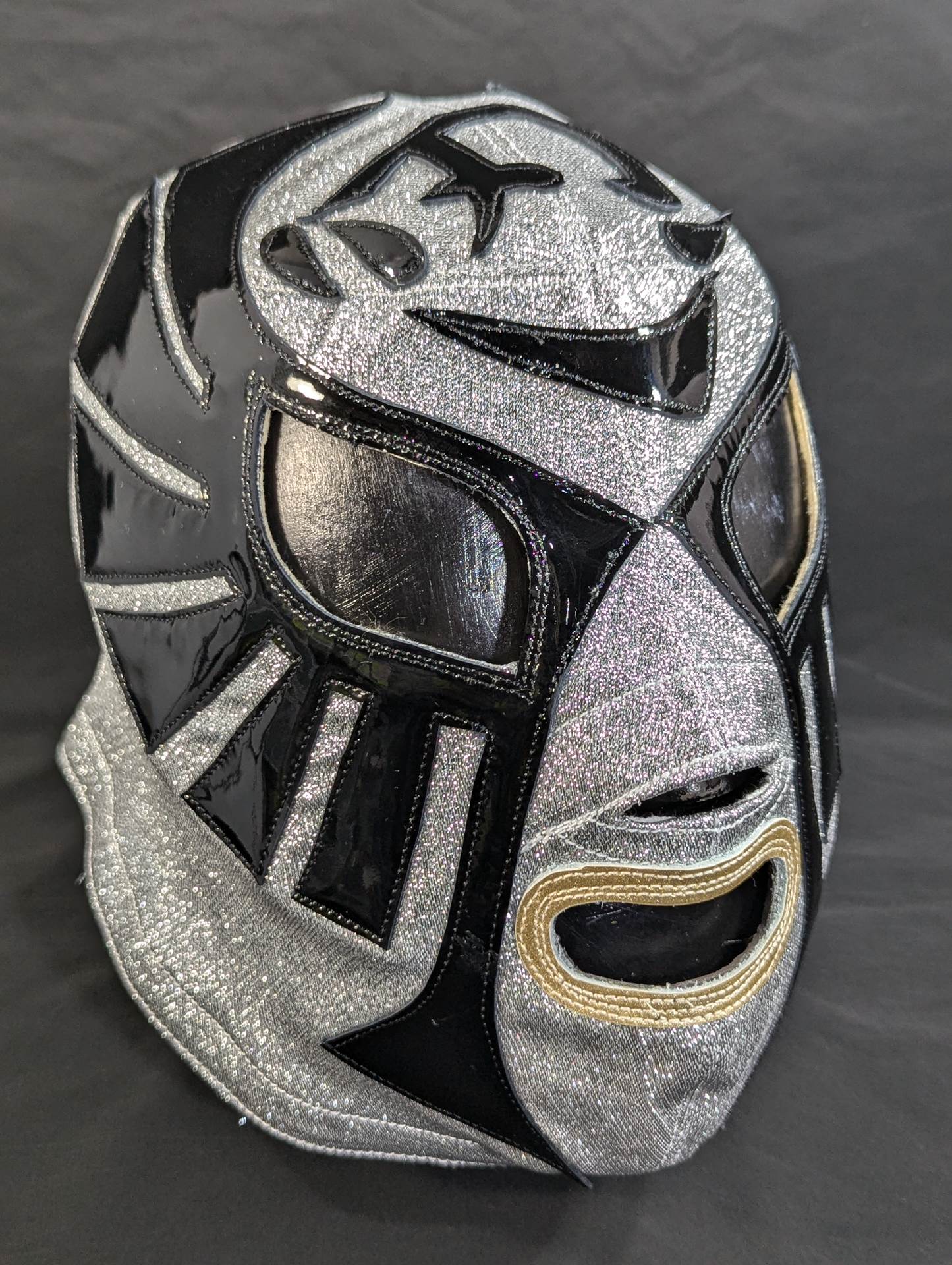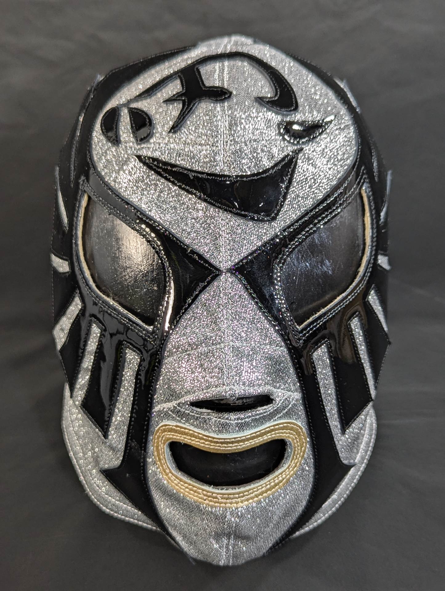 ★1983.11.3 蔵前デビュー戦「忍」タイプ★ 直筆サイン入り 保証証明書と着用写真付 銀ラメ2重生地 黒革フチ&シャンパンゴールド革フチ 「ザ・コブラHISTORY ザ・コブラこそが、日本マスク市場の生みの親。メキシコから持ちかえったザ・コブラのマスクを解体し、日本のマスク市場が立ち上がった」(byザ・コブラプロデュース事務局)