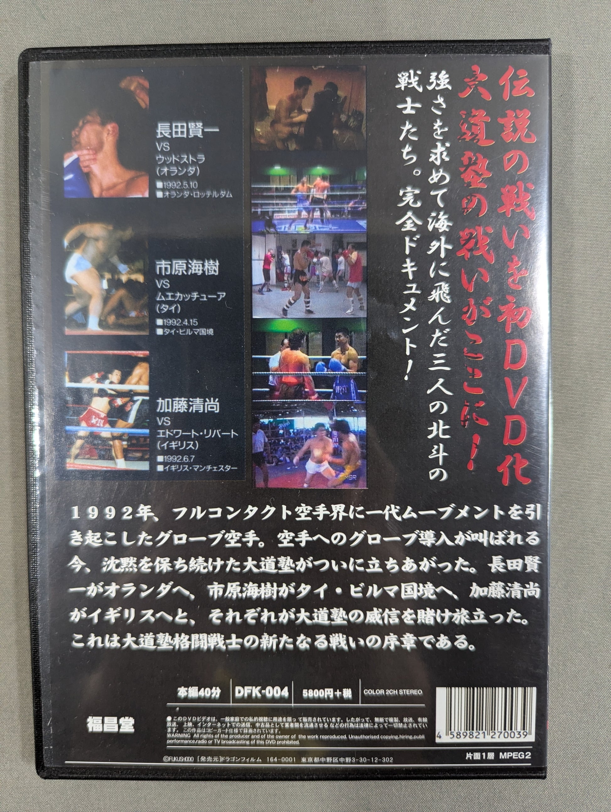 1992年、フルコンタクト空手界に一代ムーブメントを引き起こしたグローブ空手。空手へのグローブ導入が叫ばれる今、沈黙を保ち続けた大道塾がついに立ちあがった。長田賢一がオランダへ、市原海樹がタイ・ビルマ国境へ、加藤清尚がイギリスへと、それぞれが大道塾の威信を賭け旅立った。これは大道塾格闘戦士の新たなる戦いの序章である。 ※こちらの商品を購入いただくと4/14(土)17時からのトークライブ「俺たちの青春大道塾」に無料でご参加いただけます。ご希望の方は、ご購入時にメール又はお電話にてご予約ください。 長田賢一、市原海樹、加藤清尚ら、大道塾に所属する格闘家と、キック、ムエカッチューアの対戦を収めたDVD。長田賢一がオランダへ、市原海樹がタイ・ビルマ国境へ、加藤清尚がイギリスへ飛び、それぞれが大道塾の威信を懸けて戦い抜く。
