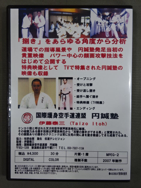 「捌き」をあらゆる角度から分析 道場での指導風景や円誠塾発足当初の貴重映像 パワー中心の顔面攻撃技法をはじめて公開する 特典映像としてTVで特集された円誠塾の映像も収録!! ○収録内容;オープニング/受けと攻撃/受け返し捌き/組手へ繋ぐ捌き/映像特典/エンディング