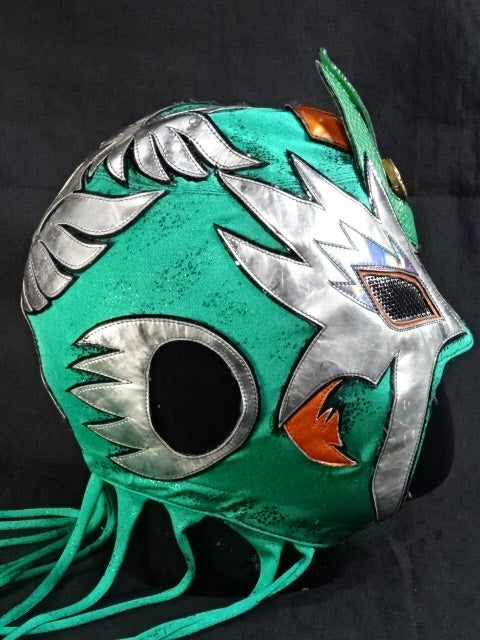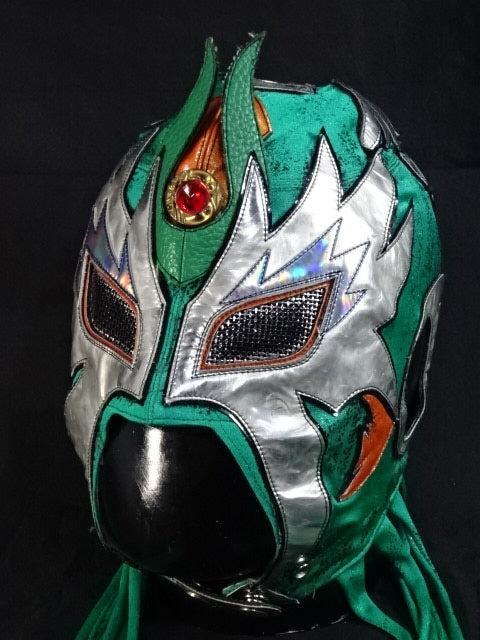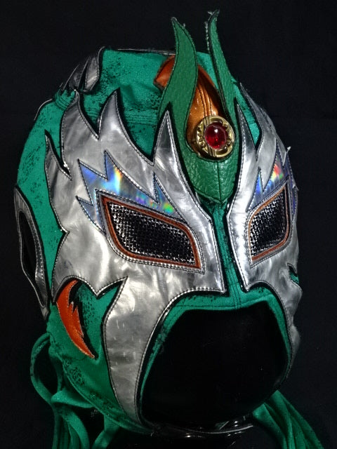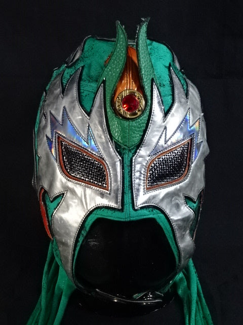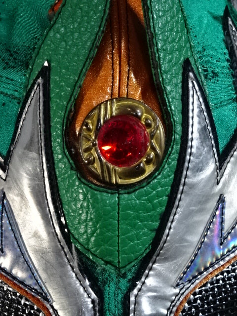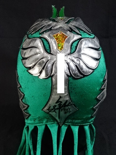 本人使用サイン入り(ドラゴンゲート ※宛名入り) 緑特殊レオタード生地 黒地銀フチ&銀特殊フチ&オレンジフチ ラインストーン装飾あり