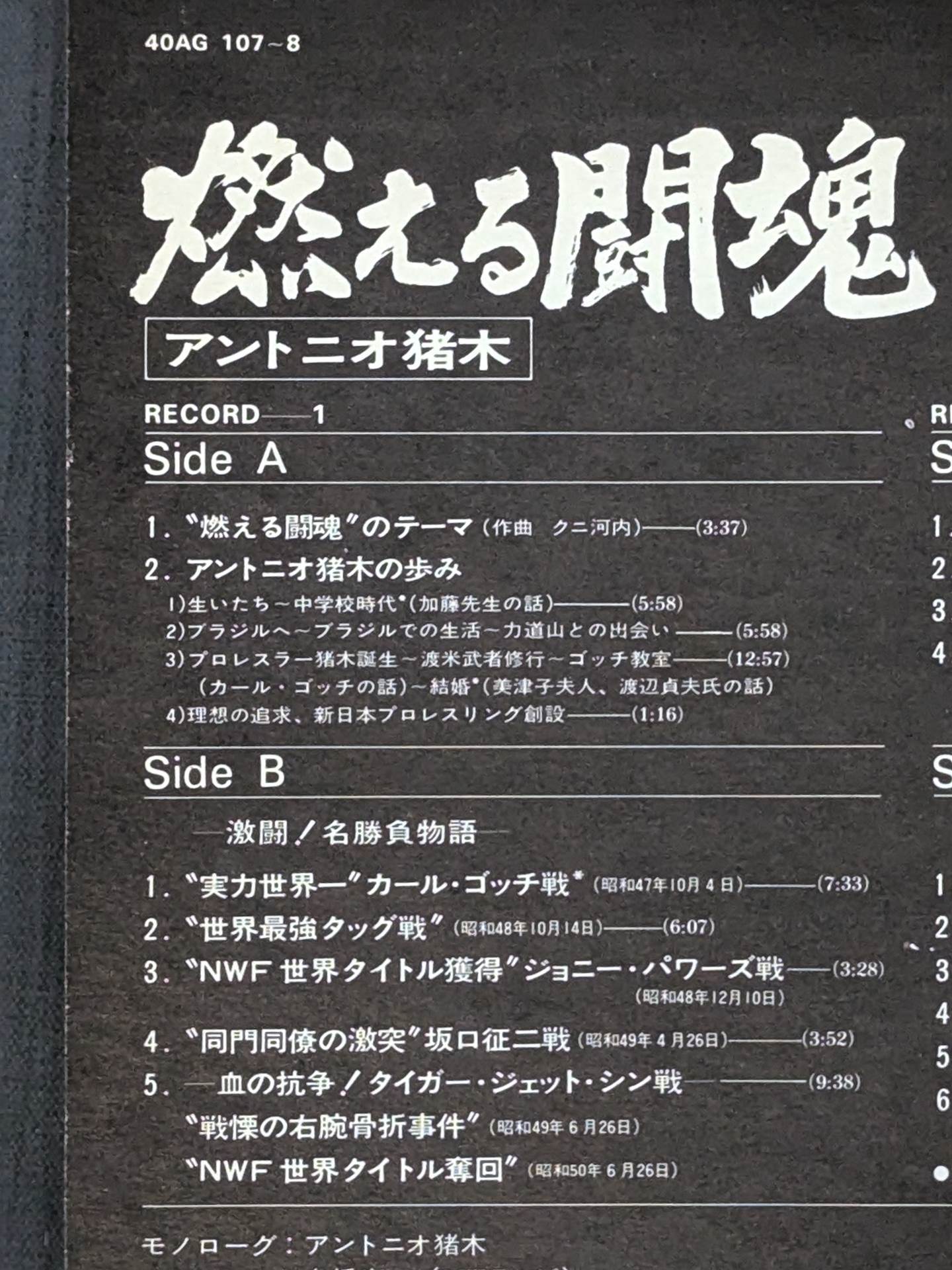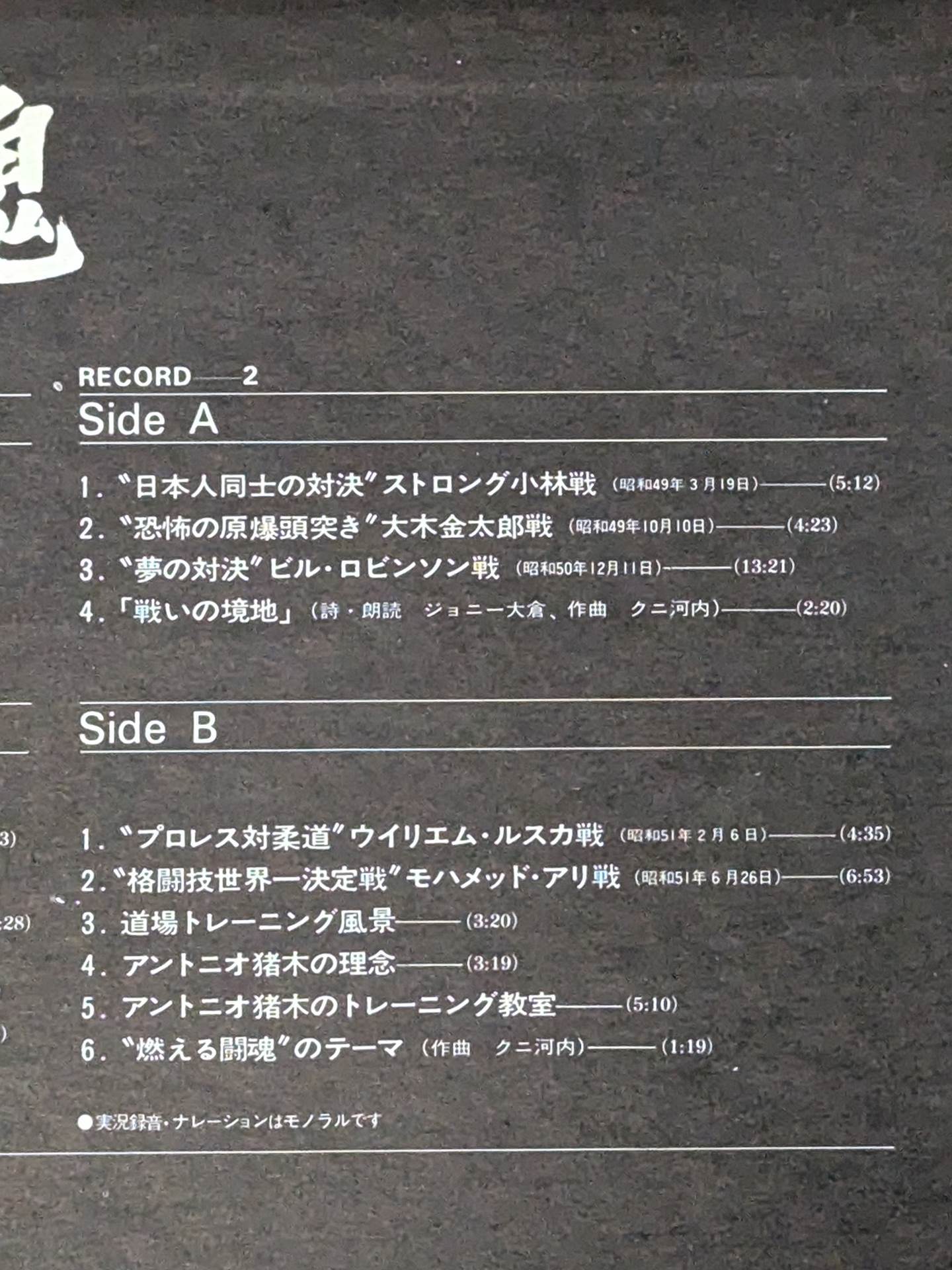 激闘!名勝負11試合(アリ、シン、ゴッチ、ロビンソン戦 他 実況録音)、アントニオ猪木の歩み(生い立ち~ゴッチ教室)、道場トレーニング風景、理念、トレーニング教室 特典:①別冊豪華12ページ解説書②6大必殺技カラーピンナップ(6枚セット)