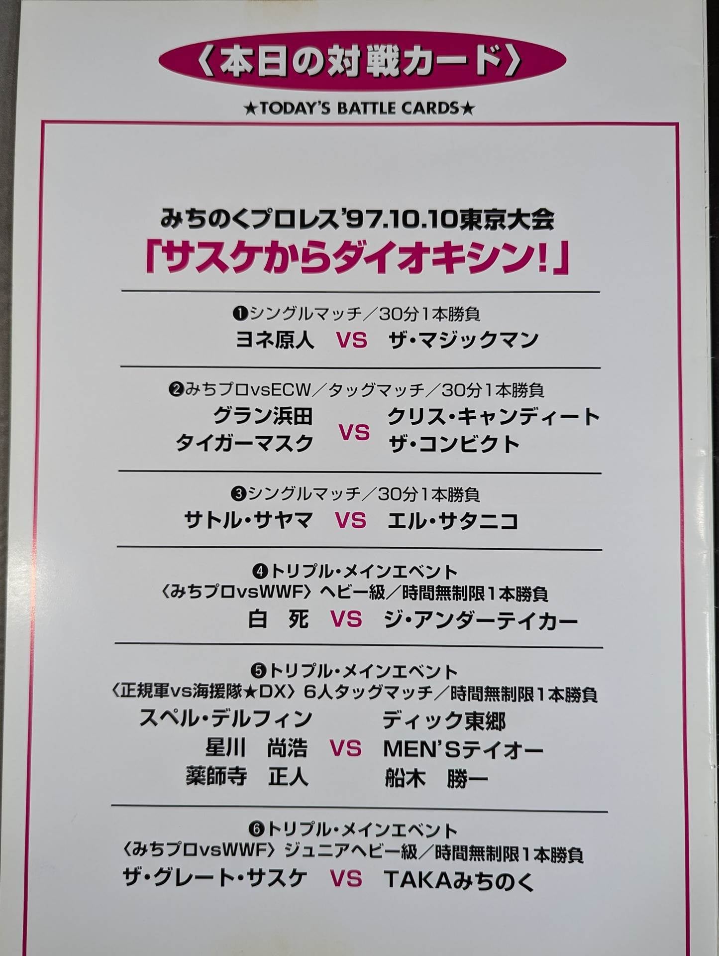 会場:両国国技館 / 印刷対戦カード:ザ・グレート・サスケvsTAKAみちのく /【デルフィン股くぐりからの復帰】スペル・デルフィン&星川尚浩&薬師寺正人vsディック東郷&MEN’Sテイオー&船木勝一 / 白死(白使/ハクシー)vsジ・アンダーテイカー