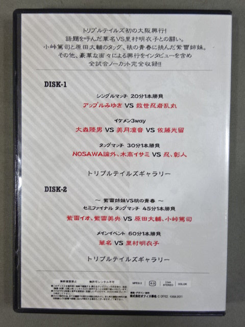 トリプルテイルズ初の大阪興行! 話題を呼んだ華名vs里村明衣子との闘い。 小峠篤司と原田大輔nタッグ、桃の青春に挑んだ紫雷姉妹。 その他、豪華な面々による興行をインタビューを含め全試合ノーカット完全収録!!