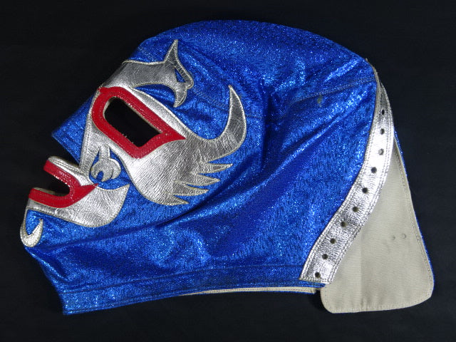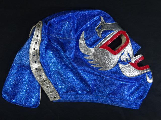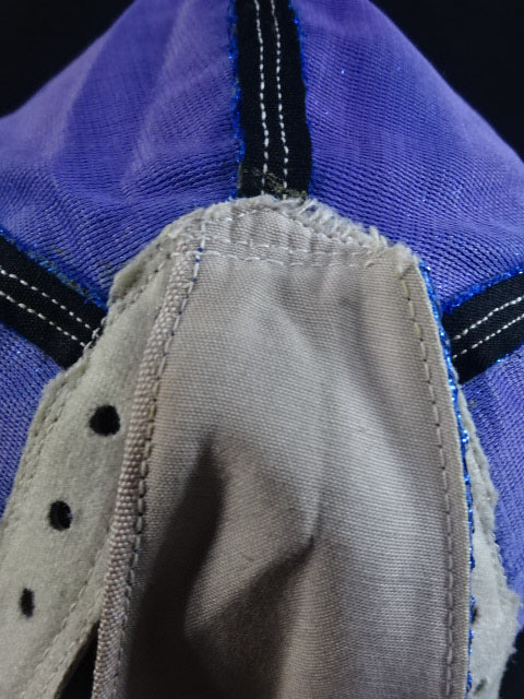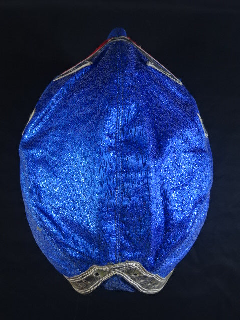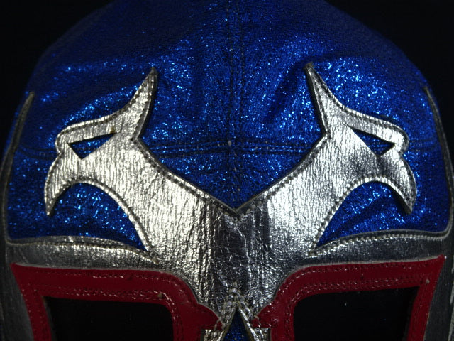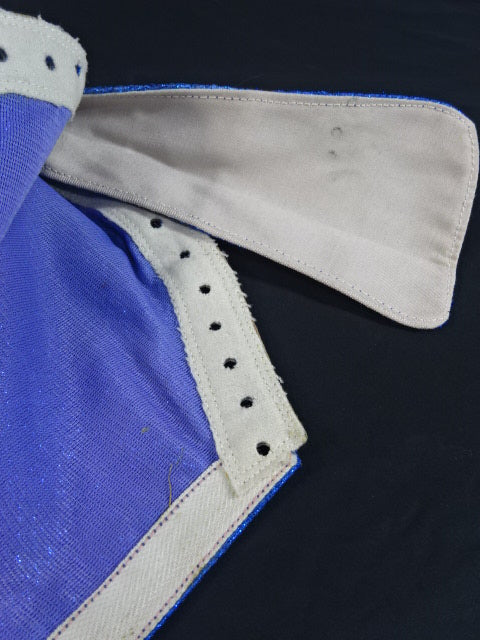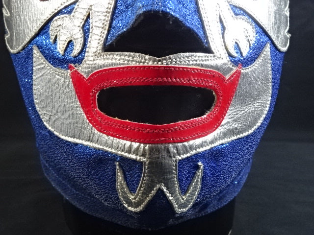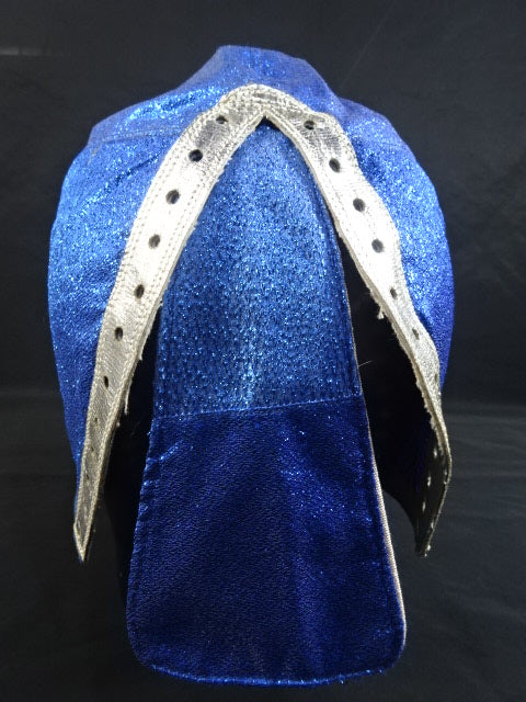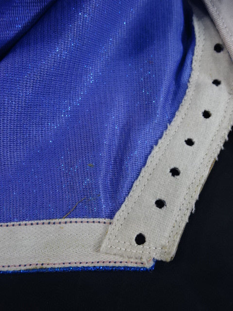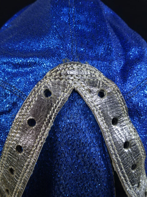 ★80年代当時モノ★ 青ノンストレッチラメ(古い旧ラメマスクのベロ部分に使われるザラザラしたラメ生地) 銀革フチ&赤革フチ ベロは同ラメ生地とグレーの綿生地 裏当ては定番の羊毛素材 喉テープは無地で上下に青糸のWステッチ 紐穴12個 週刊プロレスNo.6「新しいルチャ・リブレ」ドス・カラスのお宅訪問企画44ページに写っている現物マスク 1980年代初期ににアレハンドロ・ロドリゲス氏によって製作されたもの