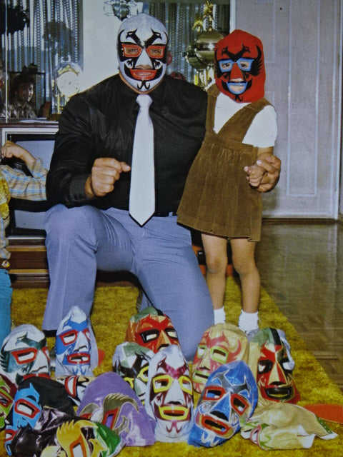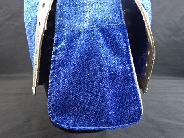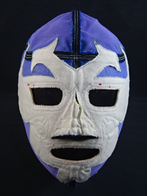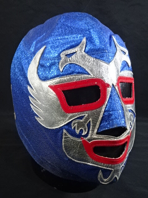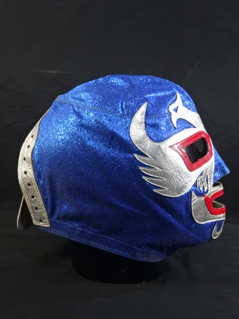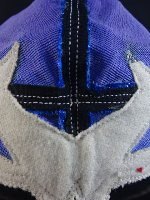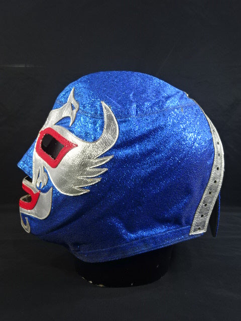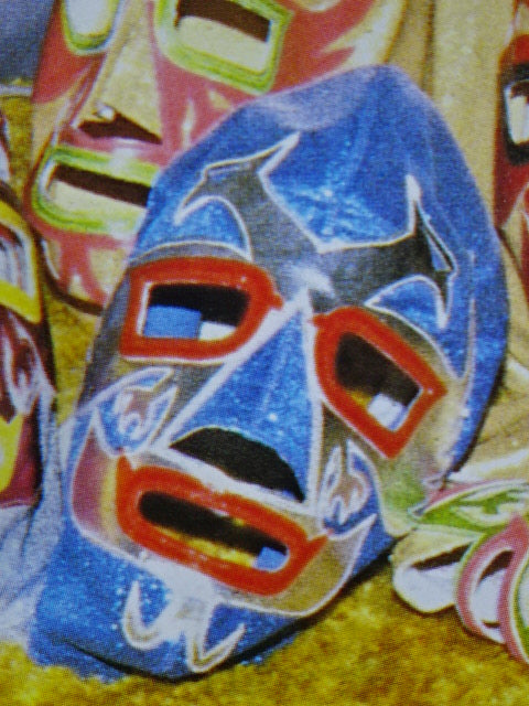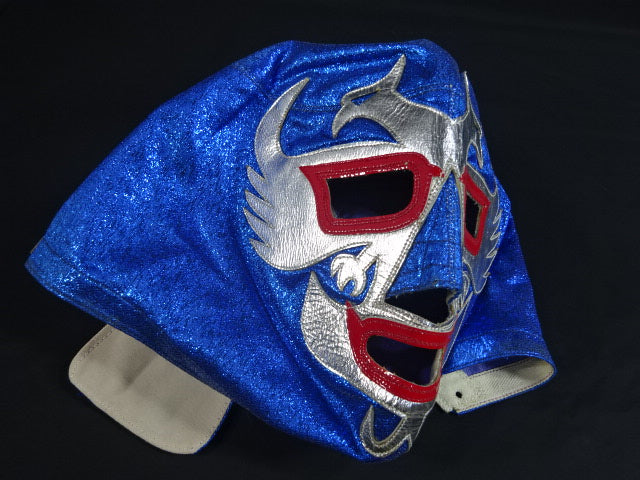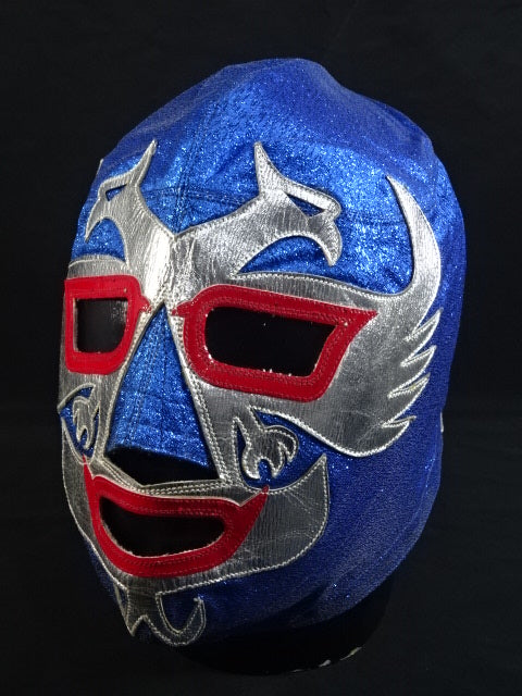 ★80年代当時モノ★ 青ノンストレッチラメ(古い旧ラメマスクのベロ部分に使われるザラザラしたラメ生地) 銀革フチ&赤革フチ ベロは同ラメ生地とグレーの綿生地 裏当ては定番の羊毛素材 喉テープは無地で上下に青糸のWステッチ 紐穴12個 週刊プロレスNo.6「新しいルチャ・リブレ」ドス・カラスのお宅訪問企画44ページに写っている現物マスク 1980年代初期ににアレハンドロ・ロドリゲス氏によって製作されたもの