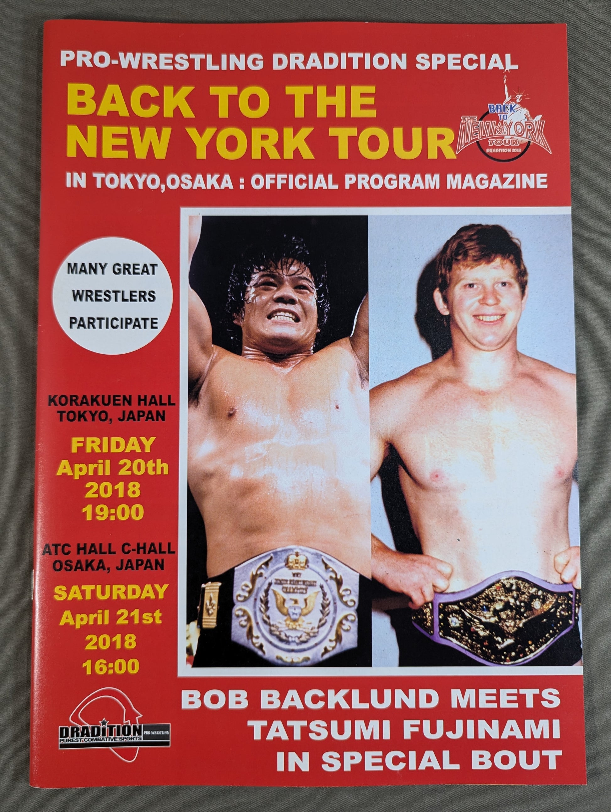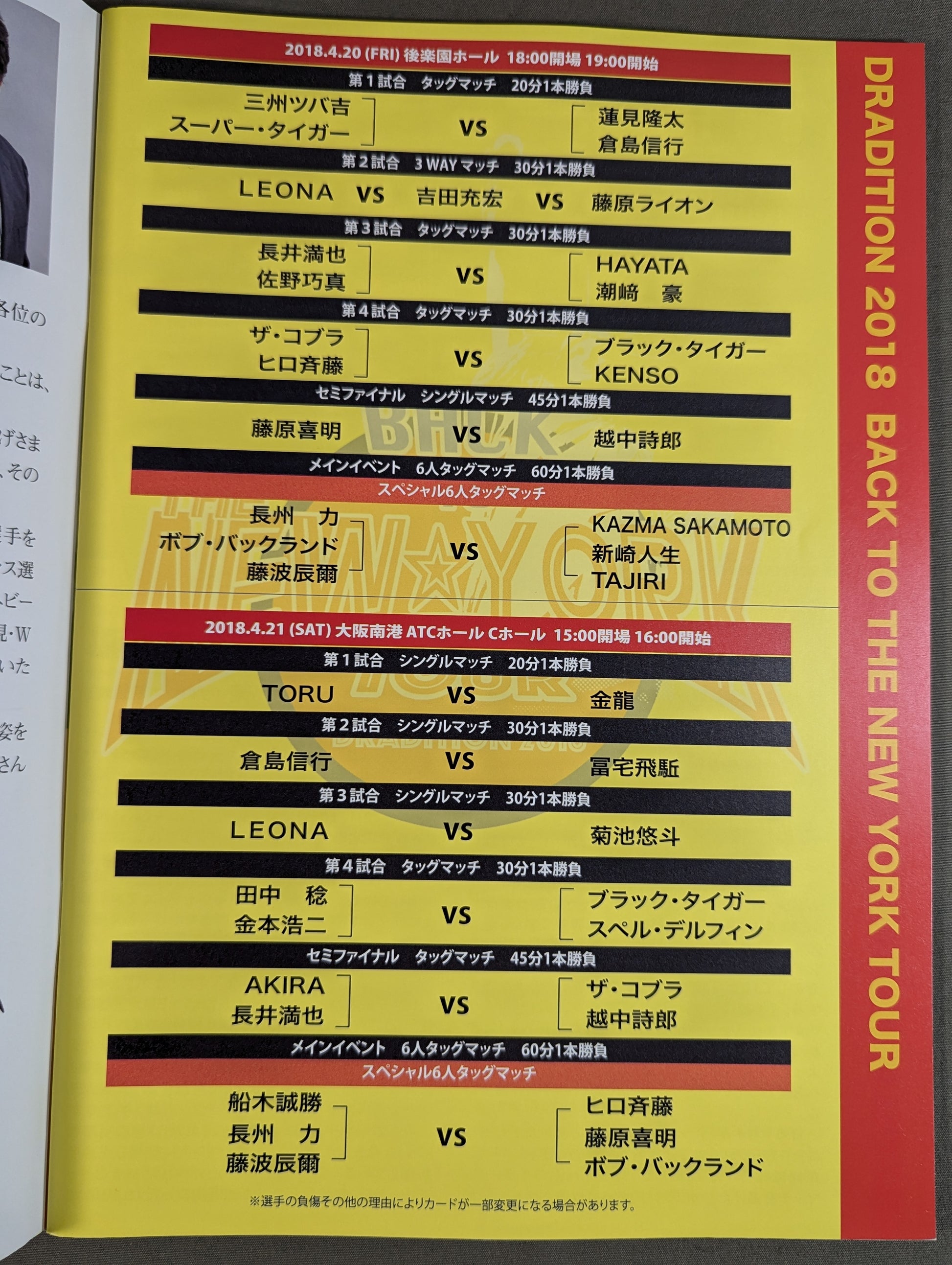 印刷対戦カード2大会分記載:(4.20 後楽園)藤波辰爾&ボブ・バックランド&長州力vsTAJIRI&新崎人生&KAZMA SAKAMOTO / (4.21 大阪)藤波辰爾&長州力&船木誠勝vsボブ・バックランド&藤原喜明&ヒロ斎藤 / DRADITION / バック・トゥー・ザ・ニューヨーク・ツアー
