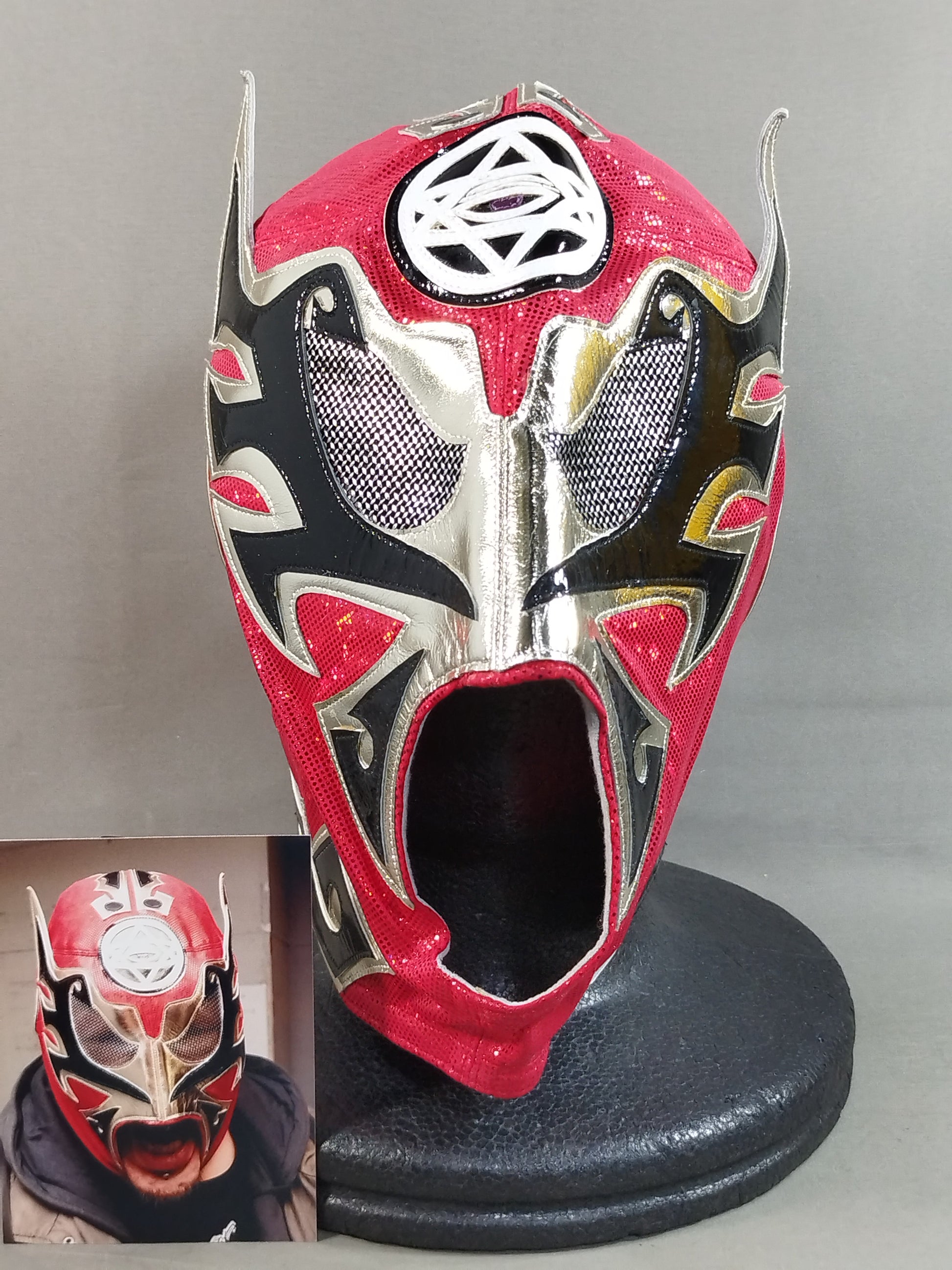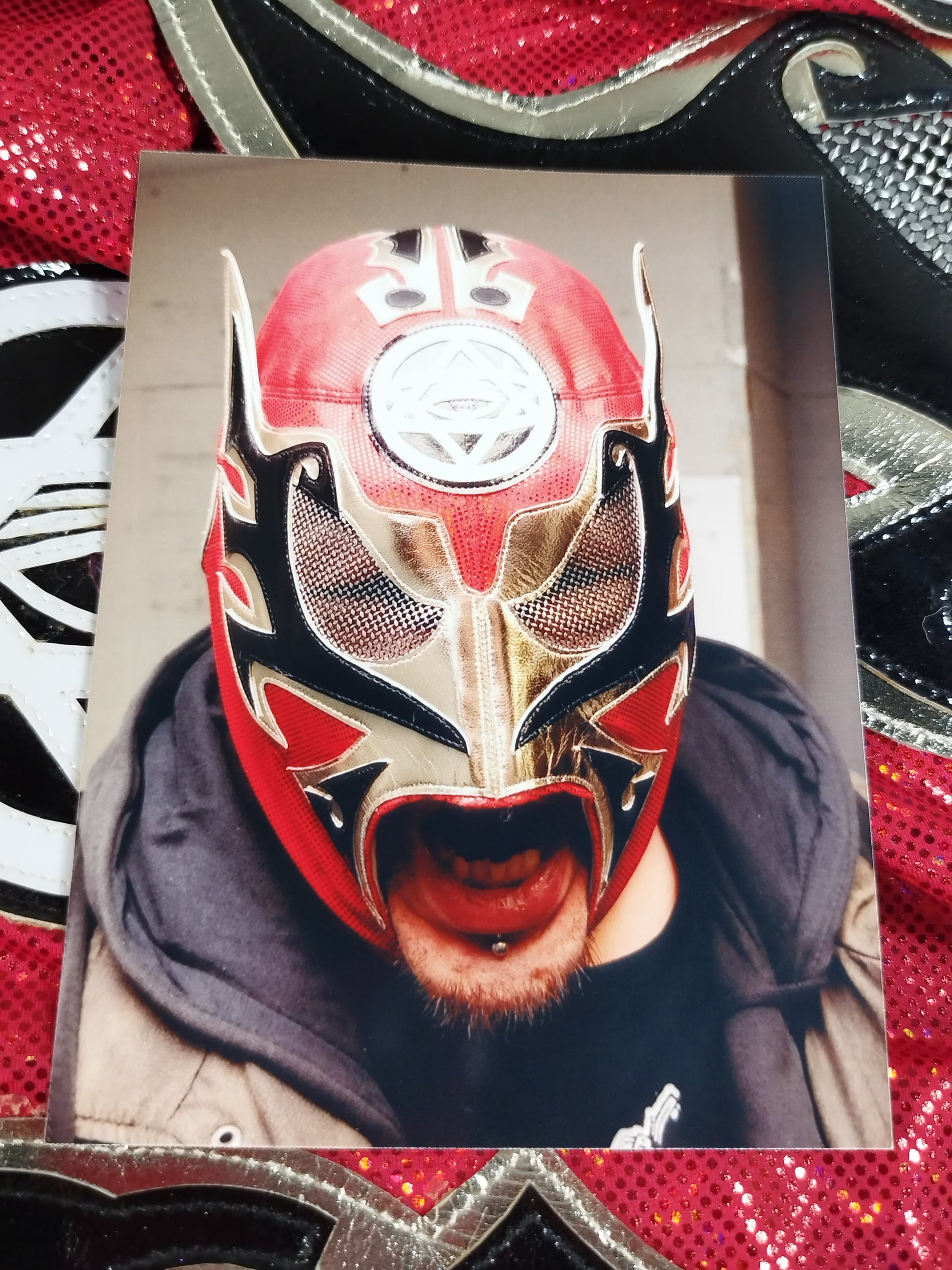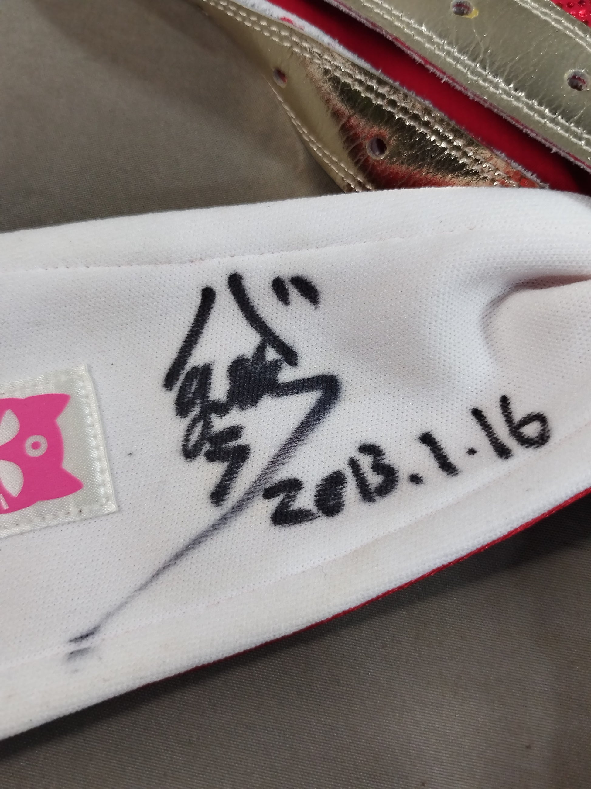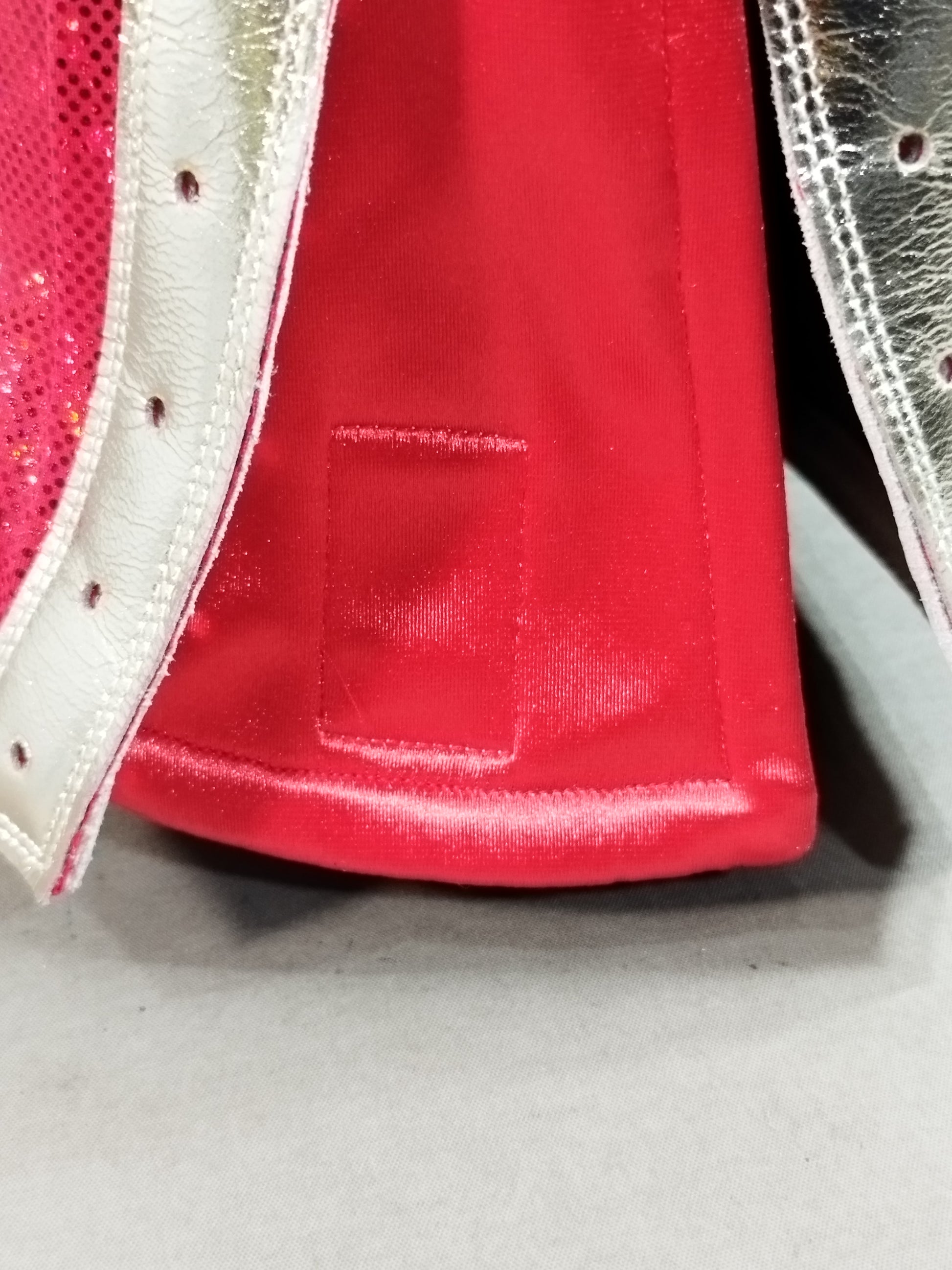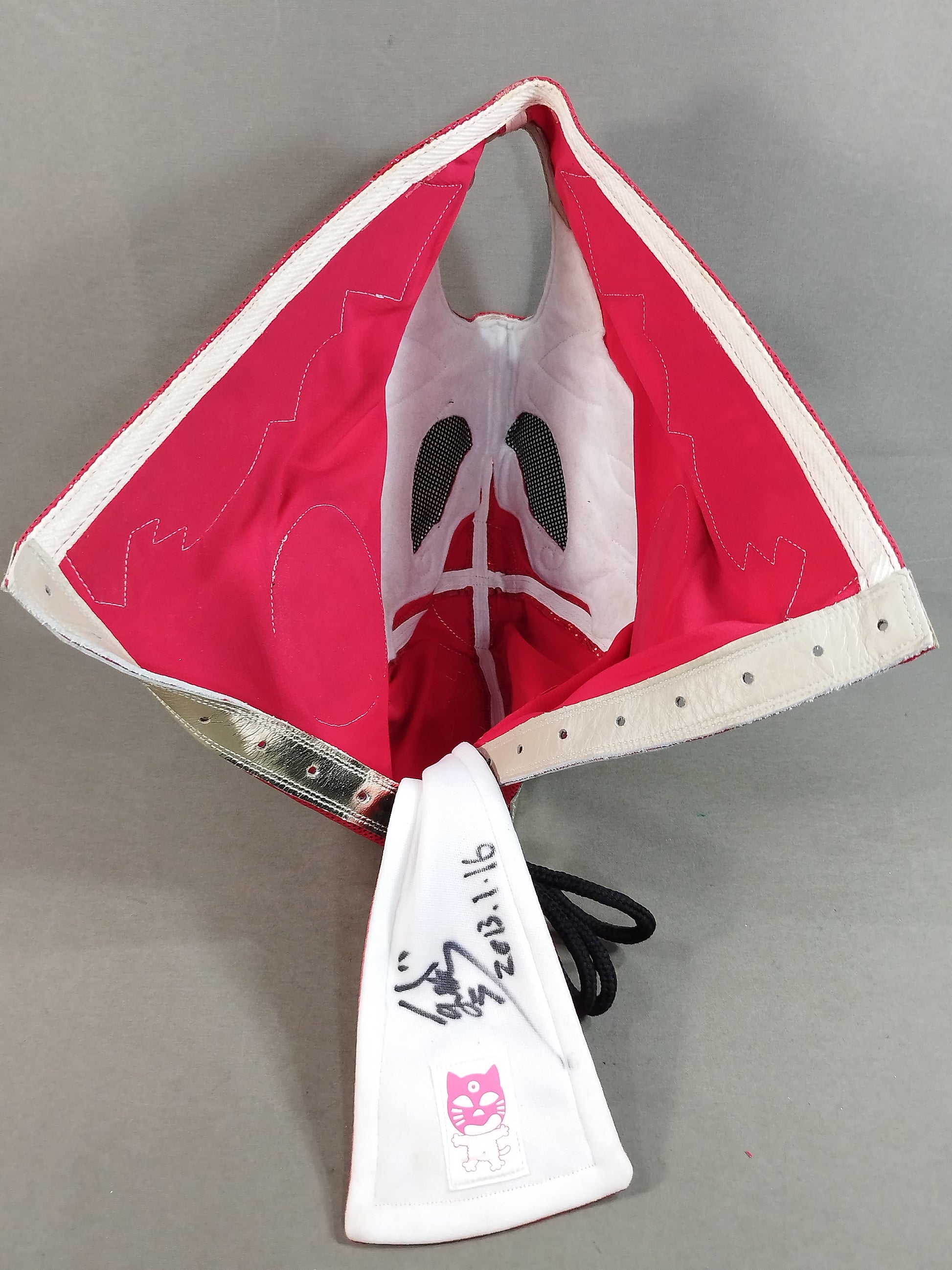 本人使用サイン入り(2013.1.16) 着用写真付 赤特殊レオタード 銀地黒フチ