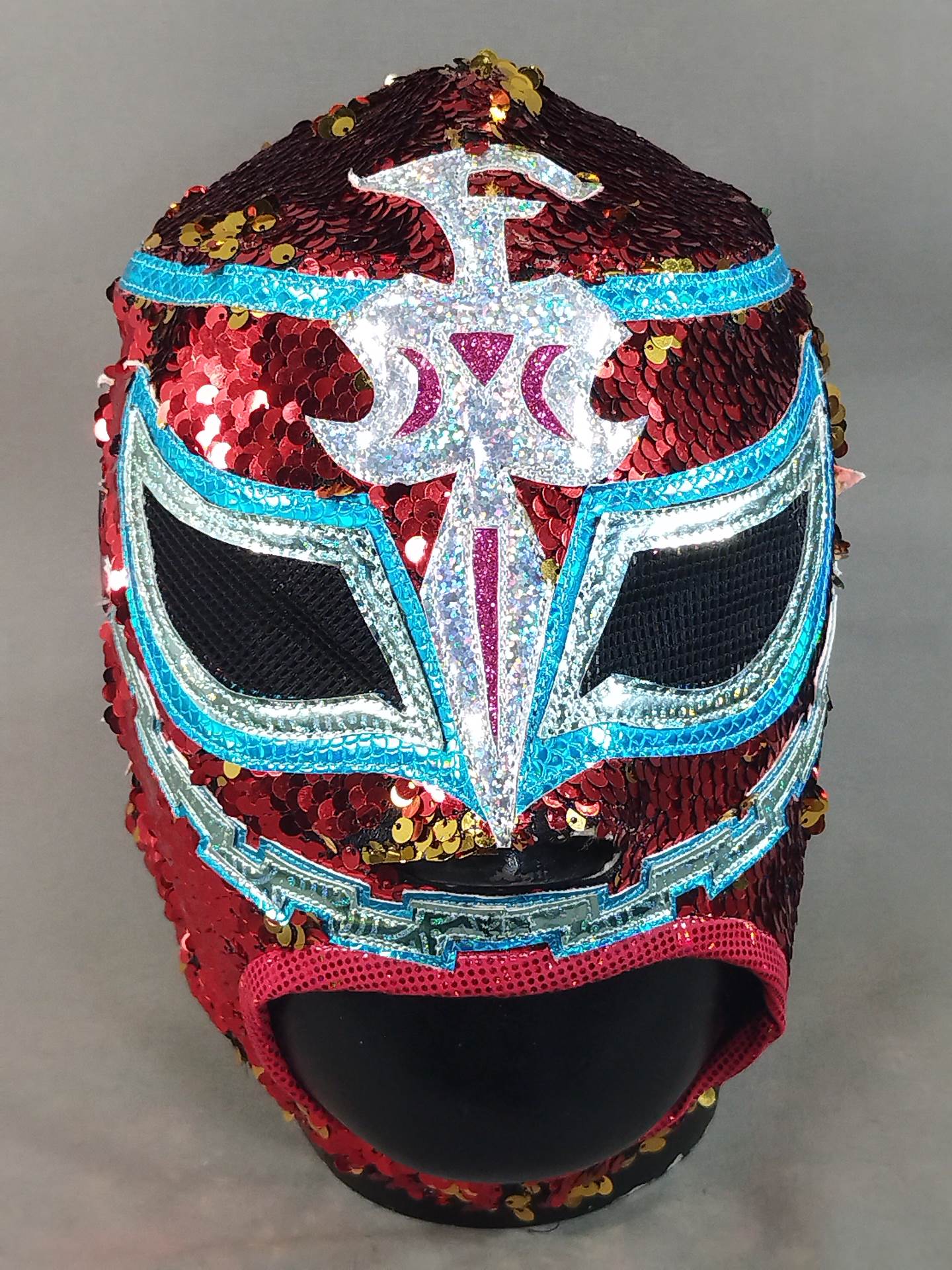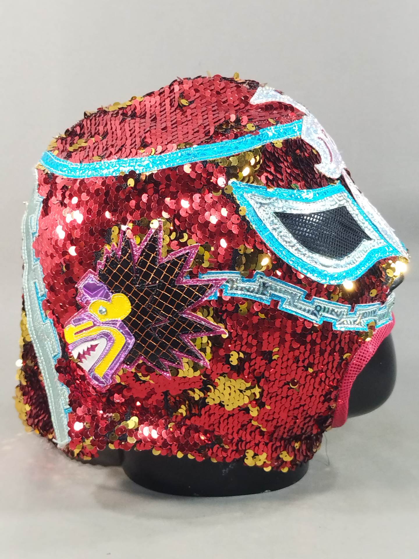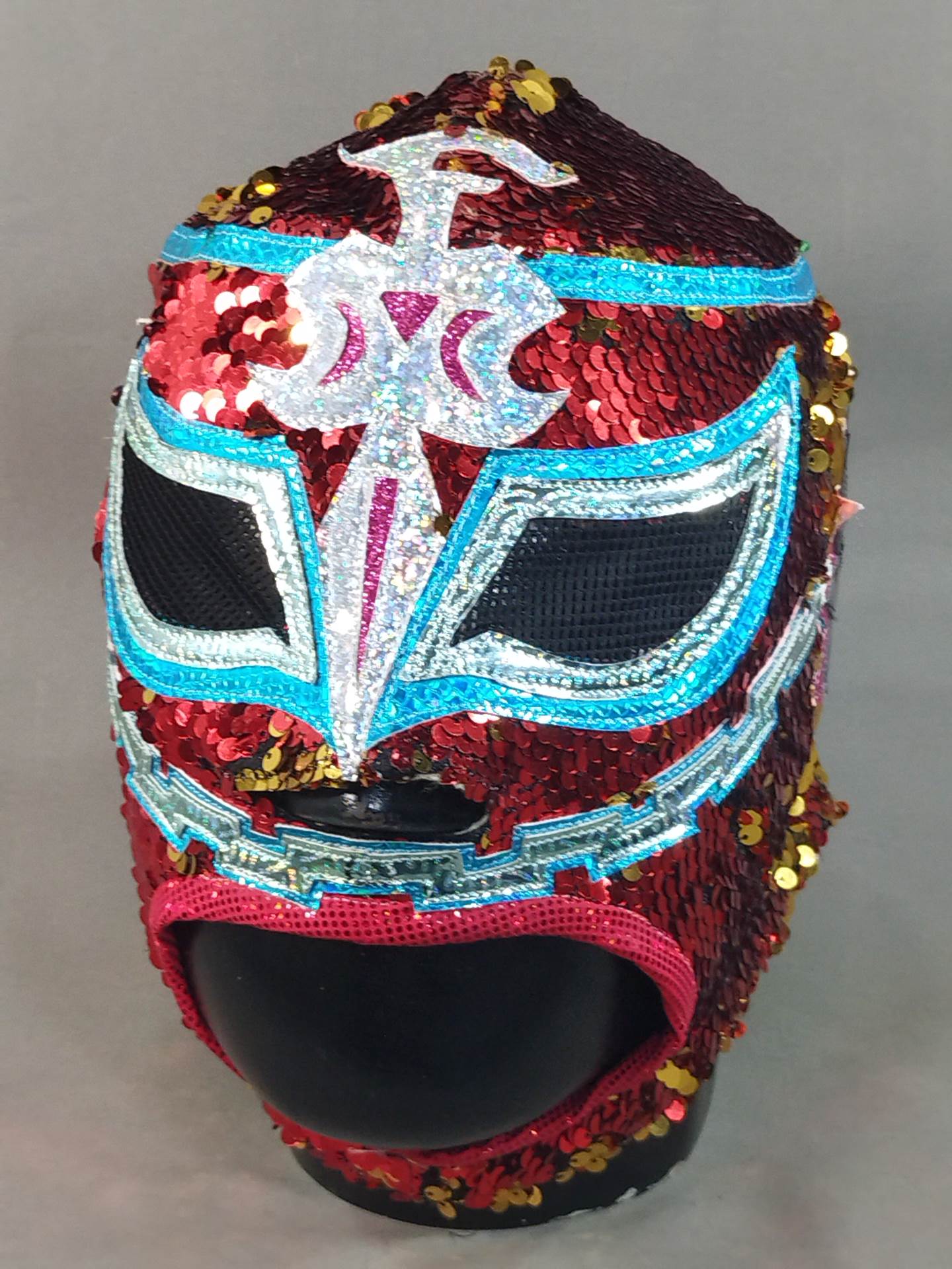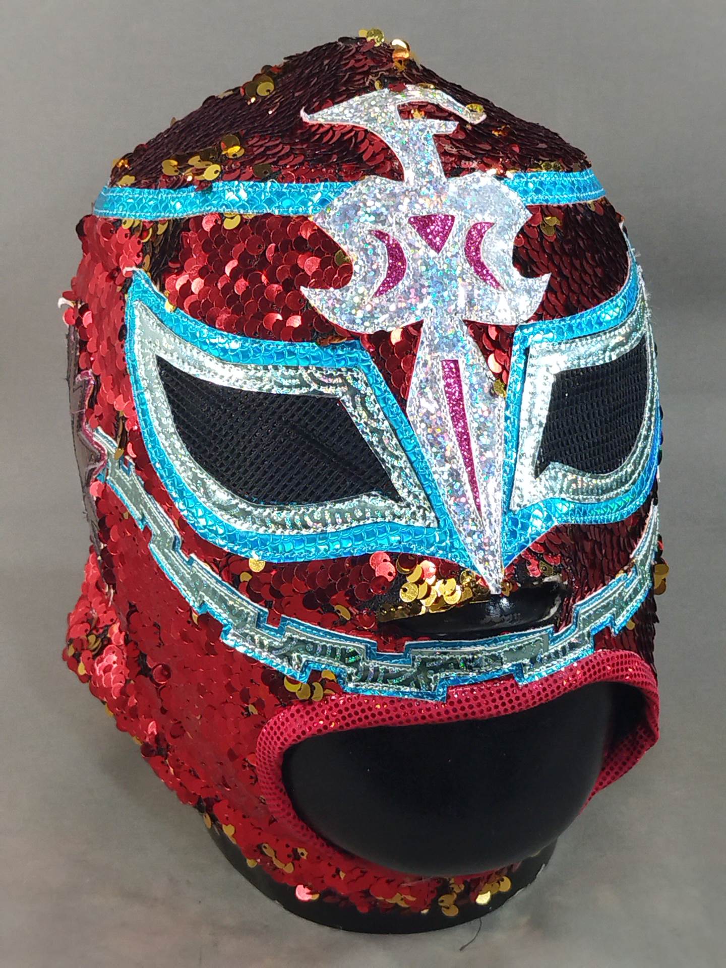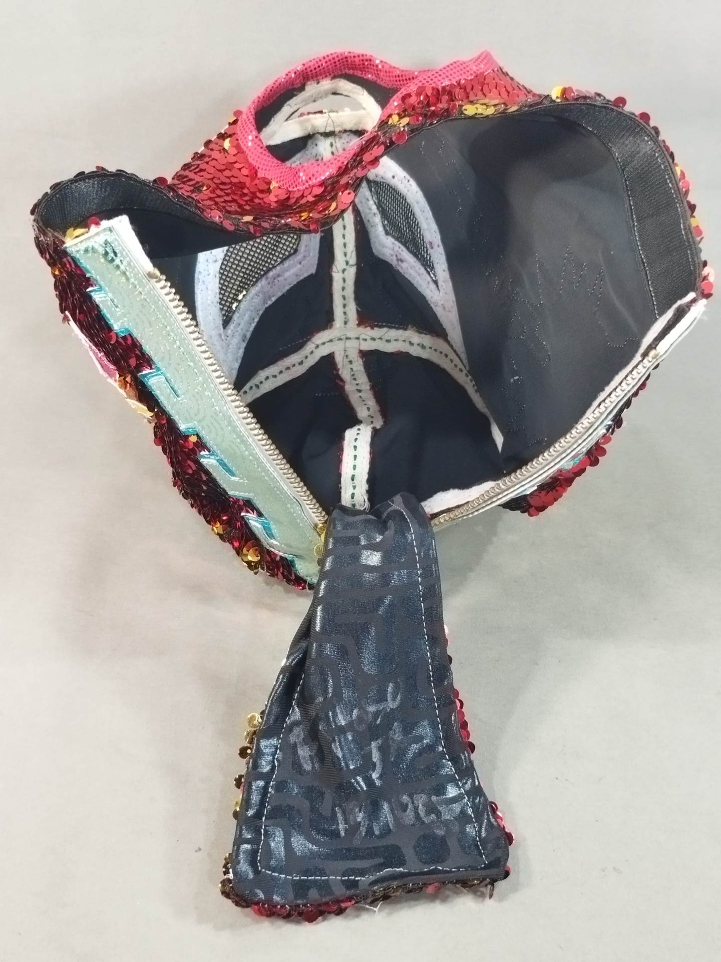 本人使用サイン入り(13.10.25) 着用写真付 赤スパンコール装飾2重生地 水色特殊地銀特殊フチ&ピンク特殊フチ&紫メタリックフチ&黄色特殊フチ 日本大会で使用したもの
