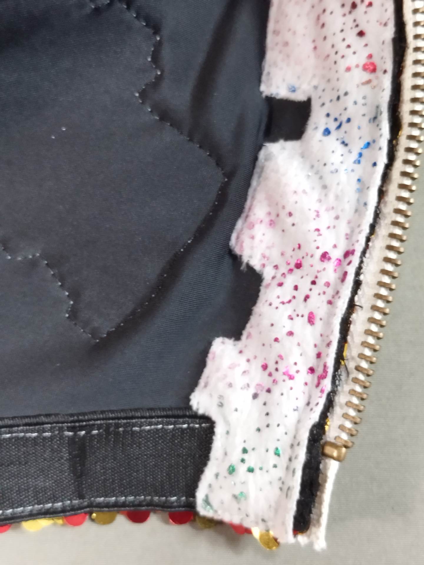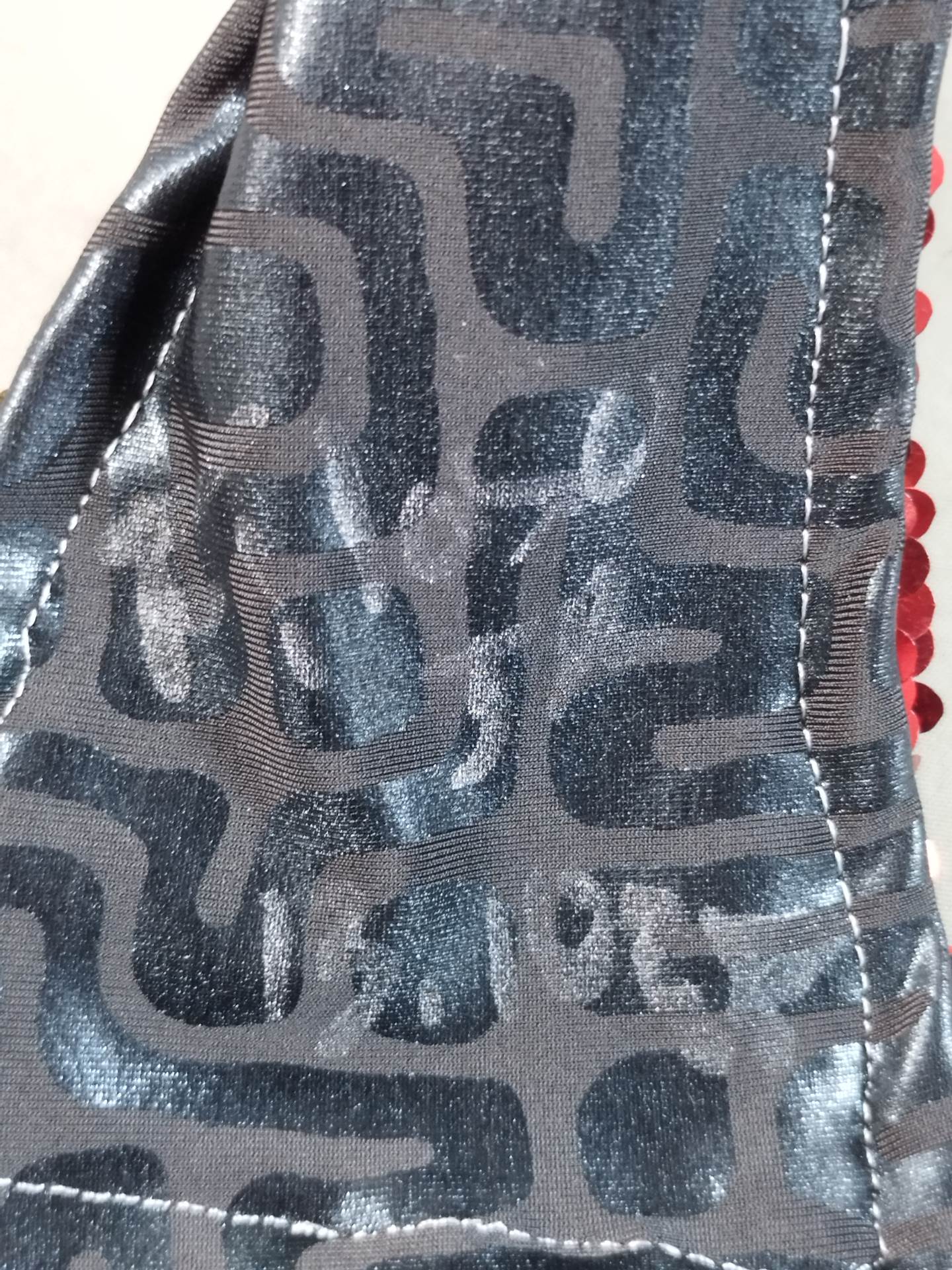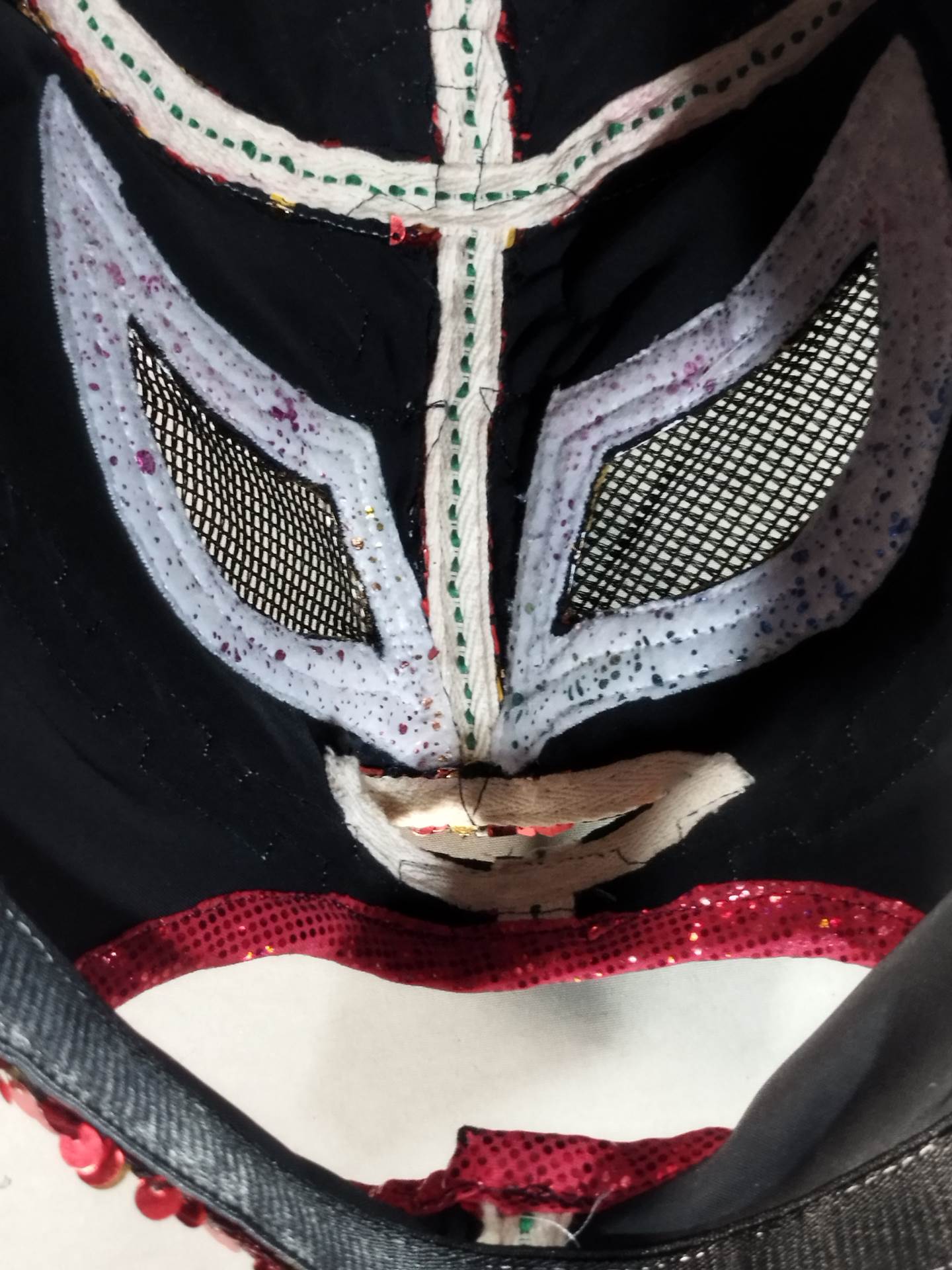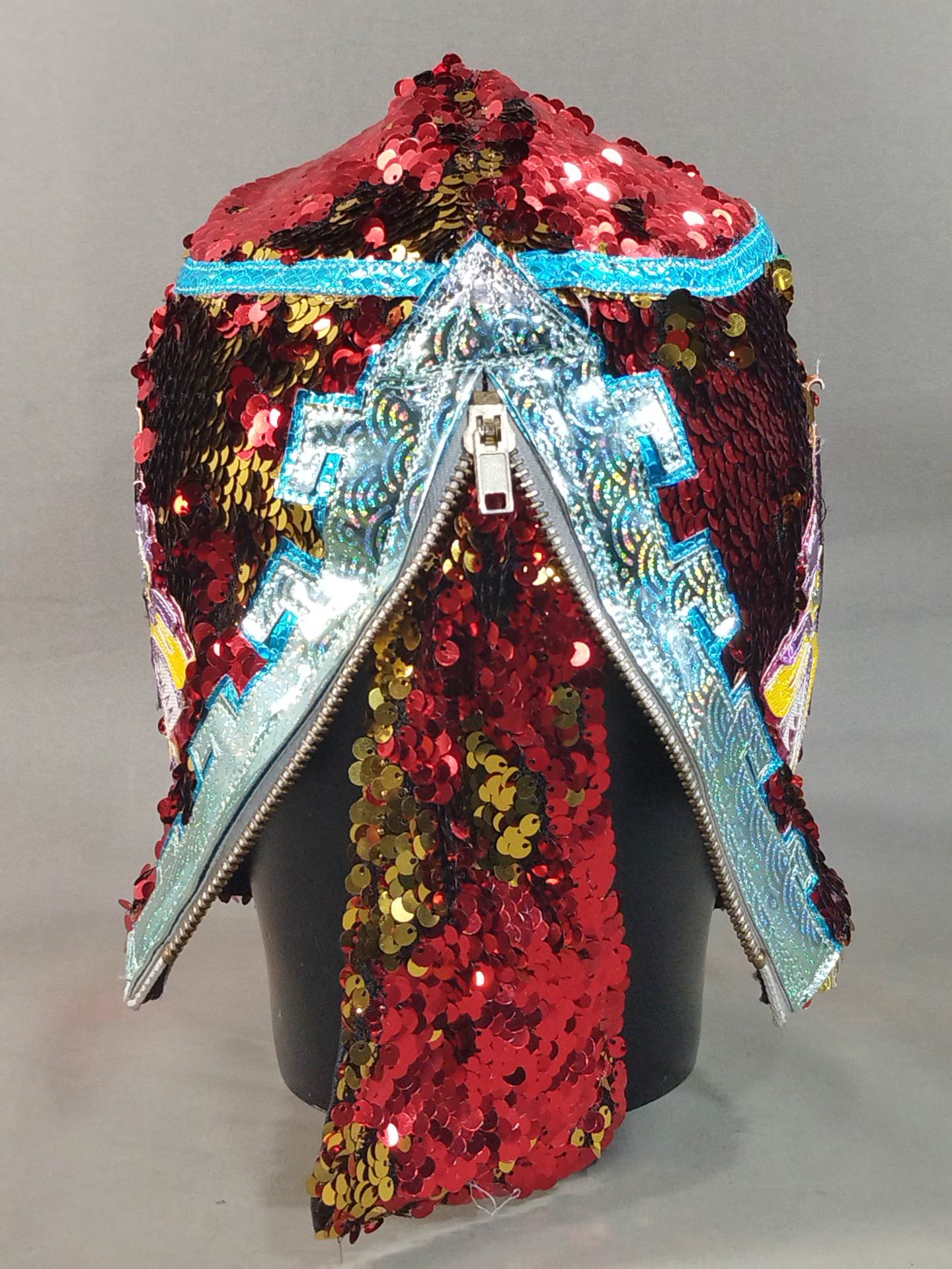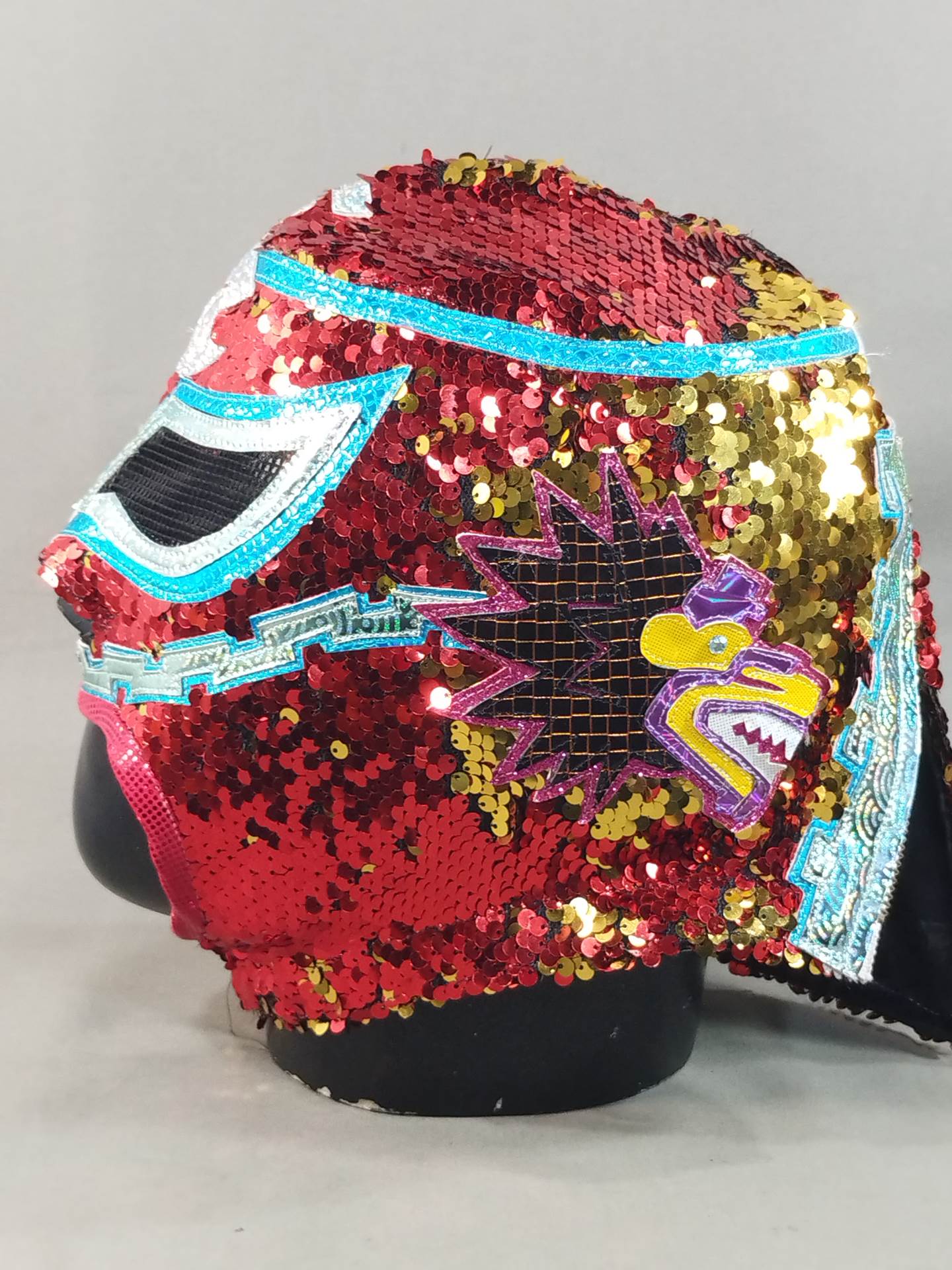 本人使用サイン入り(13.10.25) 着用写真付 赤スパンコール装飾2重生地 水色特殊地銀特殊フチ&ピンク特殊フチ&紫メタリックフチ&黄色特殊フチ 日本大会で使用したもの