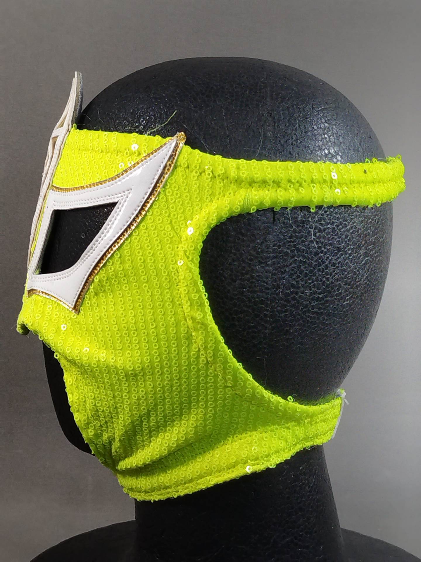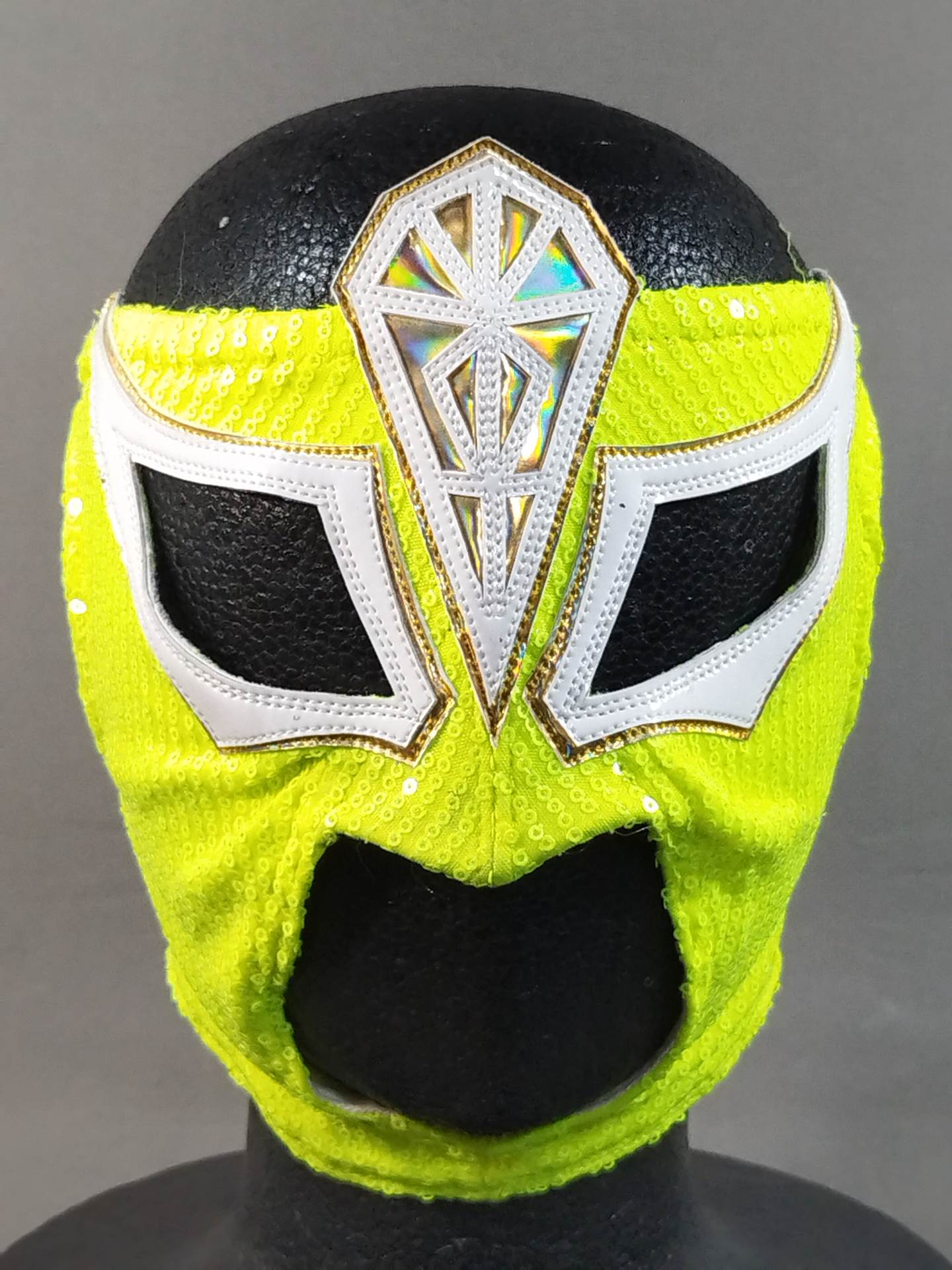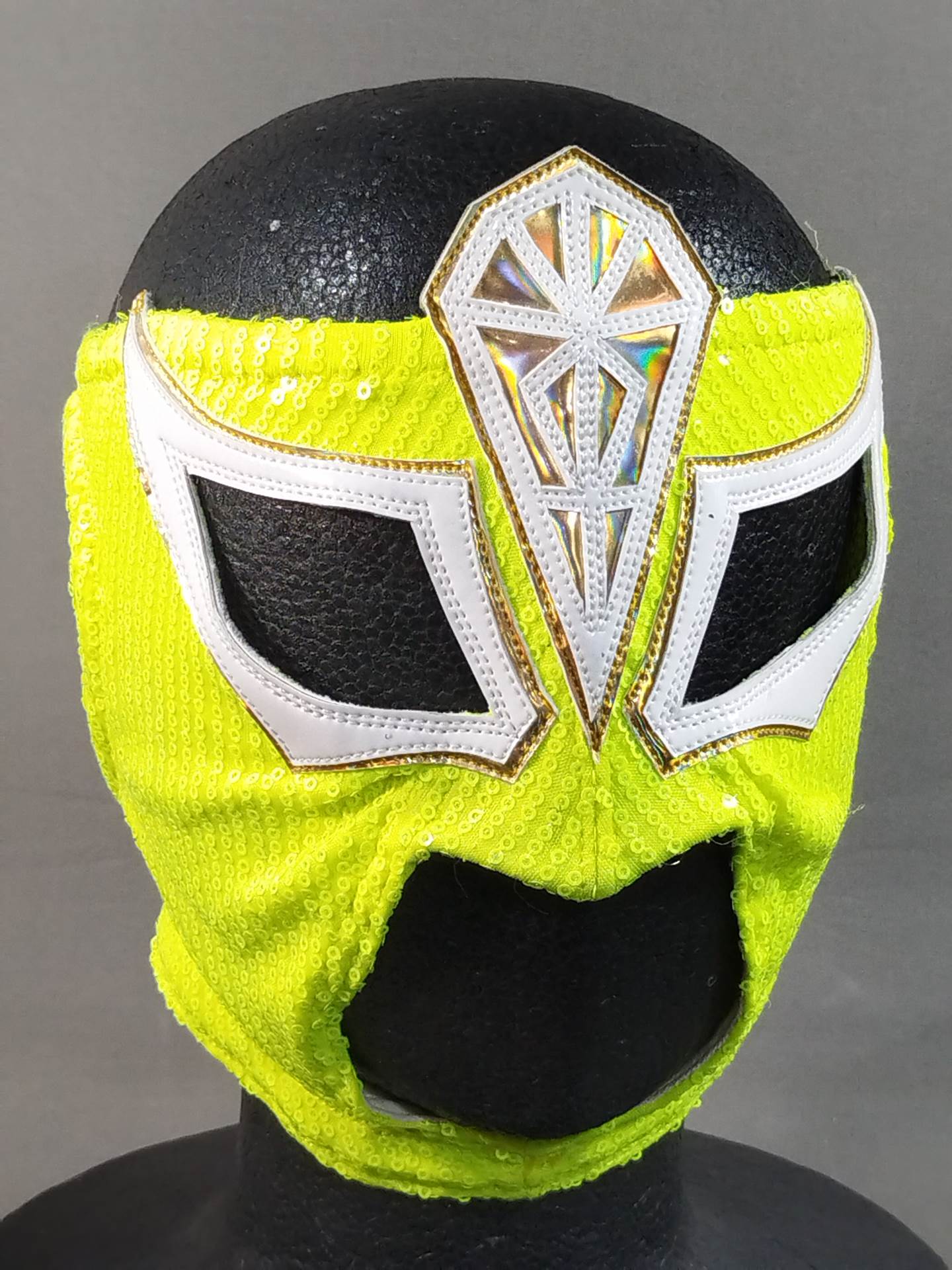 本人使用サイン入り(CMLL 2013) 蛍光黄色スパンコール装飾2重生地 金メタリック地白フチ