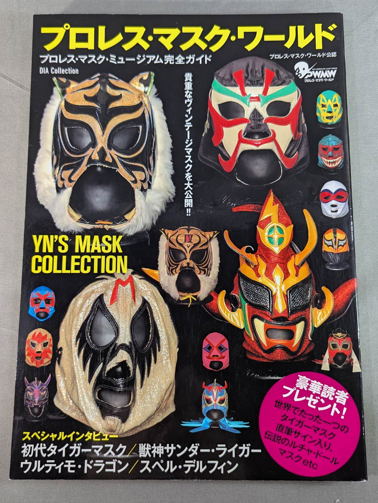 ムック(DIA COLLECTION) ダイアプレス / 初代タイガーマスクをはじめ獣神サンダー・ライガー、ザ・グレート・サスケなど人気レスラーの試合用マスクを製作する世界にファンを持つ「YN」こと中村之洋氏のもう一つの顔、マスクコレクターとしてのコレクションを完全ガイドする一冊。氏が主宰する『プロレス・マスク・ミュージアム』には収まりきれないヴィンテージマスクも一挙公開! マスクメーカーとして各マスク作りへのコメントも貴重! 世界でたったひとつのタイガーマスク、ストロングタイガー上牙モデルシックシルバースペシャルやミル・マスカラス、ドス・カラスといった伝説のルチャドールのサイン入りマスクや人気覆面レスラーの直筆サイン入り色紙などなど読者プレゼントが付いた豪華な一冊!(※応募期間は既に終了しております)