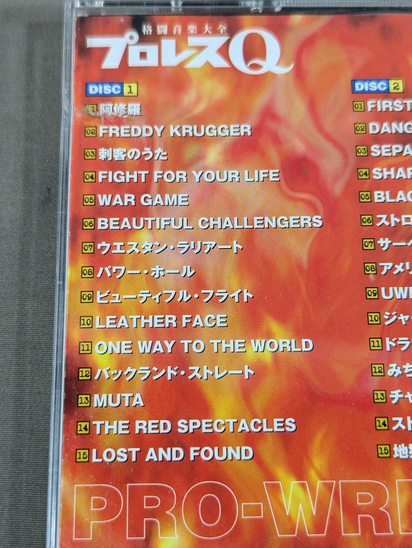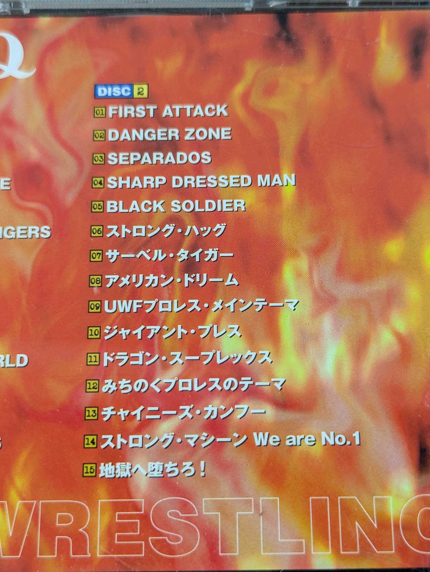 あの名テーマ曲が、ついにCDで甦った!キミは何曲知っているか? 【DISC1】1. 阿修羅2. FREDDY KRUGGER3. 刺客のうた4. FIGHT FOR YOUR LIFE5. WAR GAME6. BEAUTIFUL CHALLENGERS7. ウェスタン・ラリアート8. パワー・ホール9. ビューティフル・フライト10. LEATHER FACE11. ONE WAY TO THE WORLD12. バックランド・ストレート13. MUTA14. THE RED SPECTACLES15. LOST AND FOUND 【DISC2】1. FIRST ATTACK2. DANGER ZONE3. SEPARADOS4. SHARP DRESSED MAN5. BLACK SOLDIER6. ストロング・ハッグ7. サーベル・タイガー8. アメリカン・ドリーム9. UWFプロレス・メインテーマ10. ジャイアント・プレス11. ドラゴン・スープレックス12. みちのくプロレスのテーマ13. チャイニーズ・カンフー14. ストロング・マシーン We are No.115. 地獄へ堕ちろ!