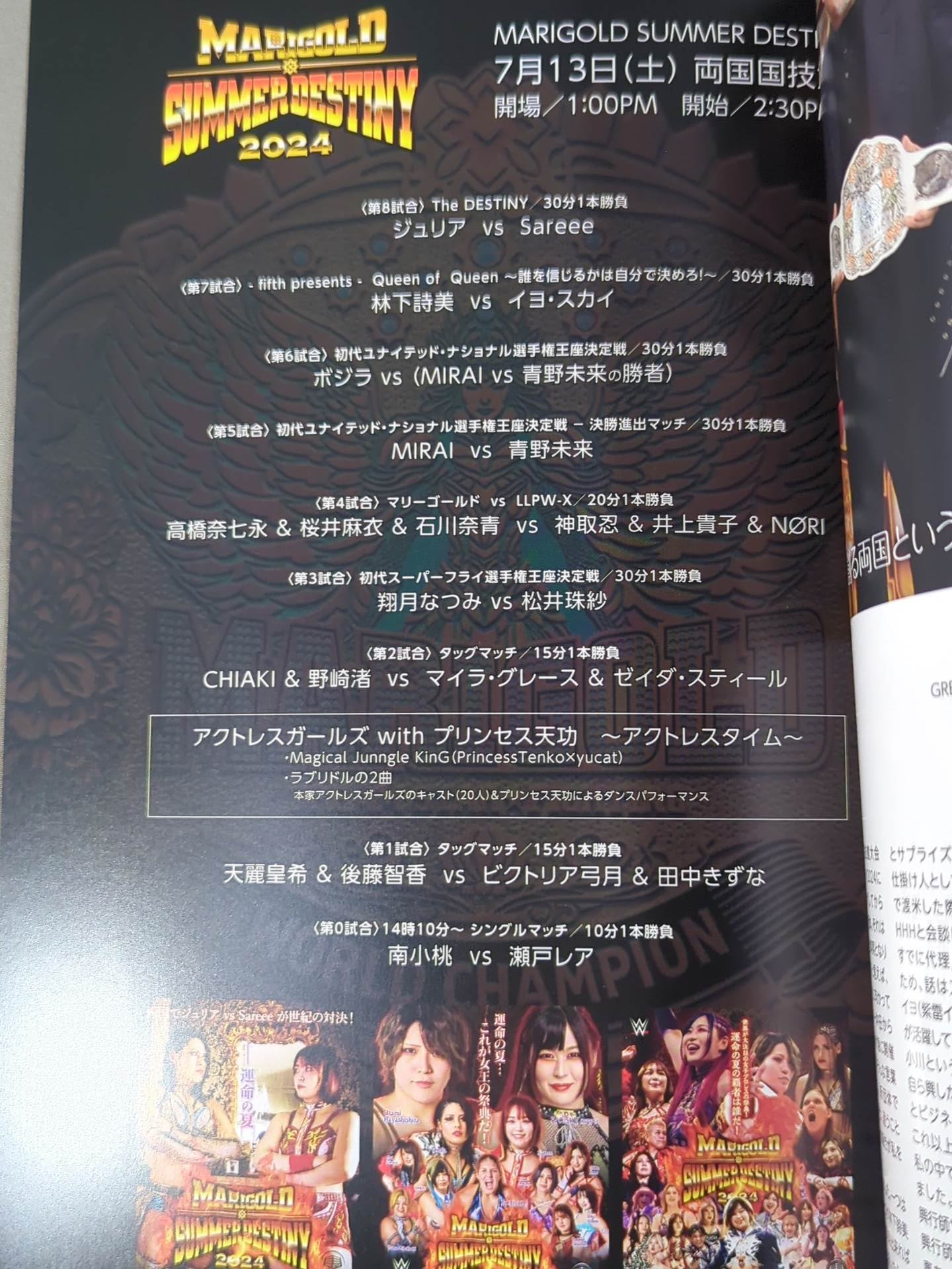 会場:両国国技館 / 印刷対戦カード:【初代マリーゴールド・ワールド王者決定戦】ジュリアvsSareee / 林下詩美vsイヨ・スカイ /【初代ユナイテッドナショナル選手権王者決定戦】ボジラvs(MIRAIvs青野未来の勝者 ※青野未来) Marigold ガイドブックVol.2 / Summer Destiny / ”Ryogoku Commemorative Issue”