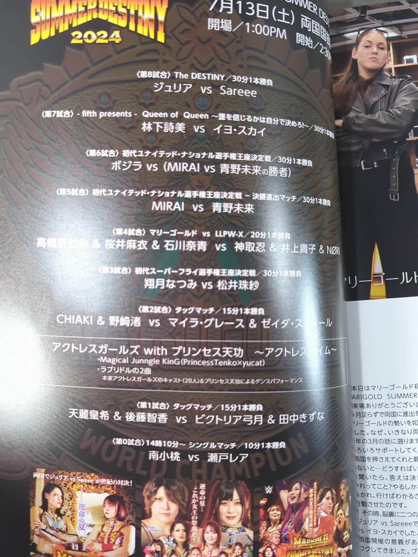 会場:両国国技館 / 印刷対戦カード:【初代マリーゴールド・ワールド王者決定戦】ジュリアvsSareee ※Sareee戴冠 / 林下詩美vsイヨ・スカイ /【初代ユナイテッドナショナル選手権王者決定戦】ボジラvs(MIRAIvs青野未来の勝者 ※青野未来) ※青野戴冠 Marigold ガイドブックVol.2 / Summer Destiny / ”Ryogoku Commemorative Issue”