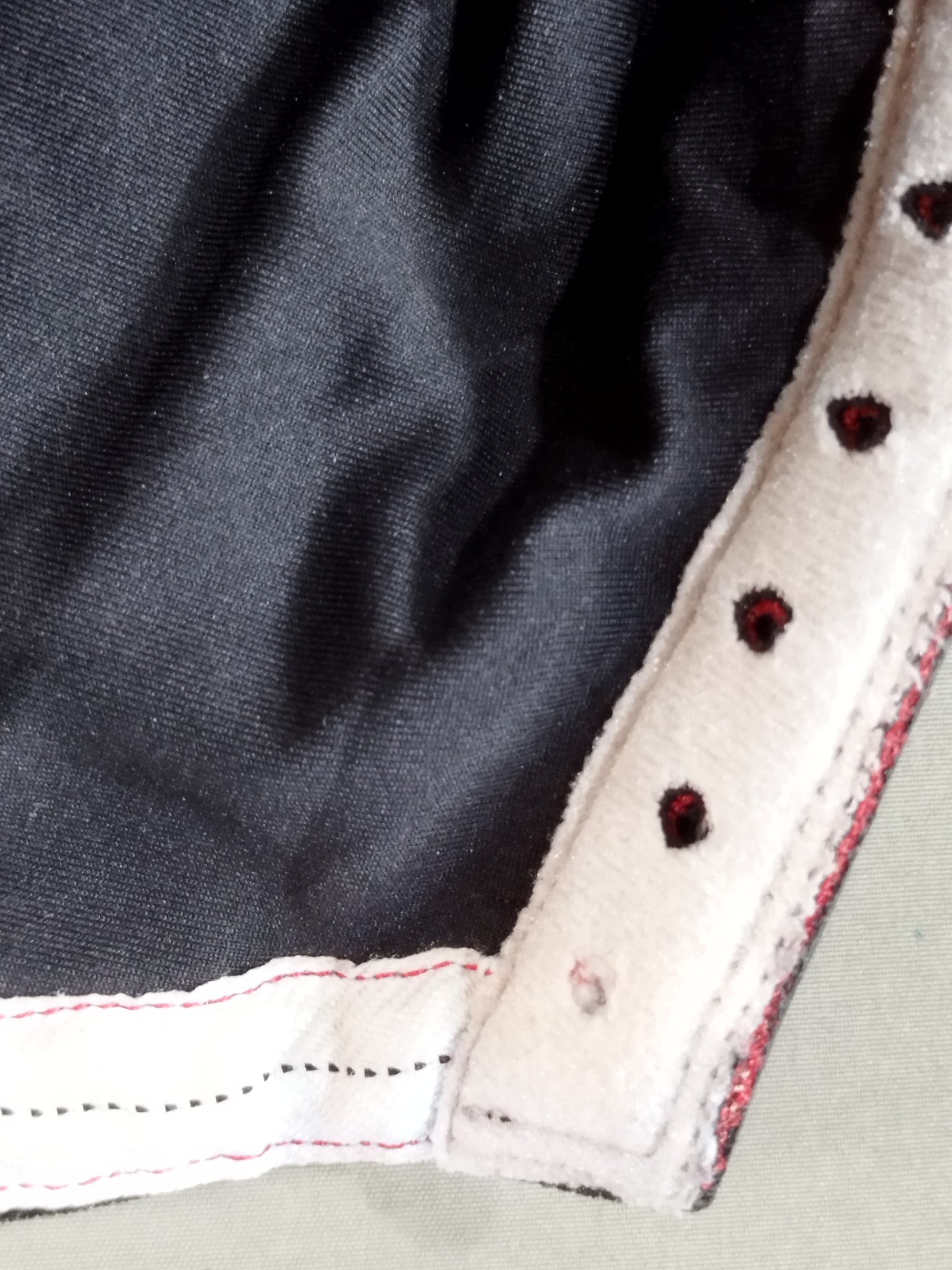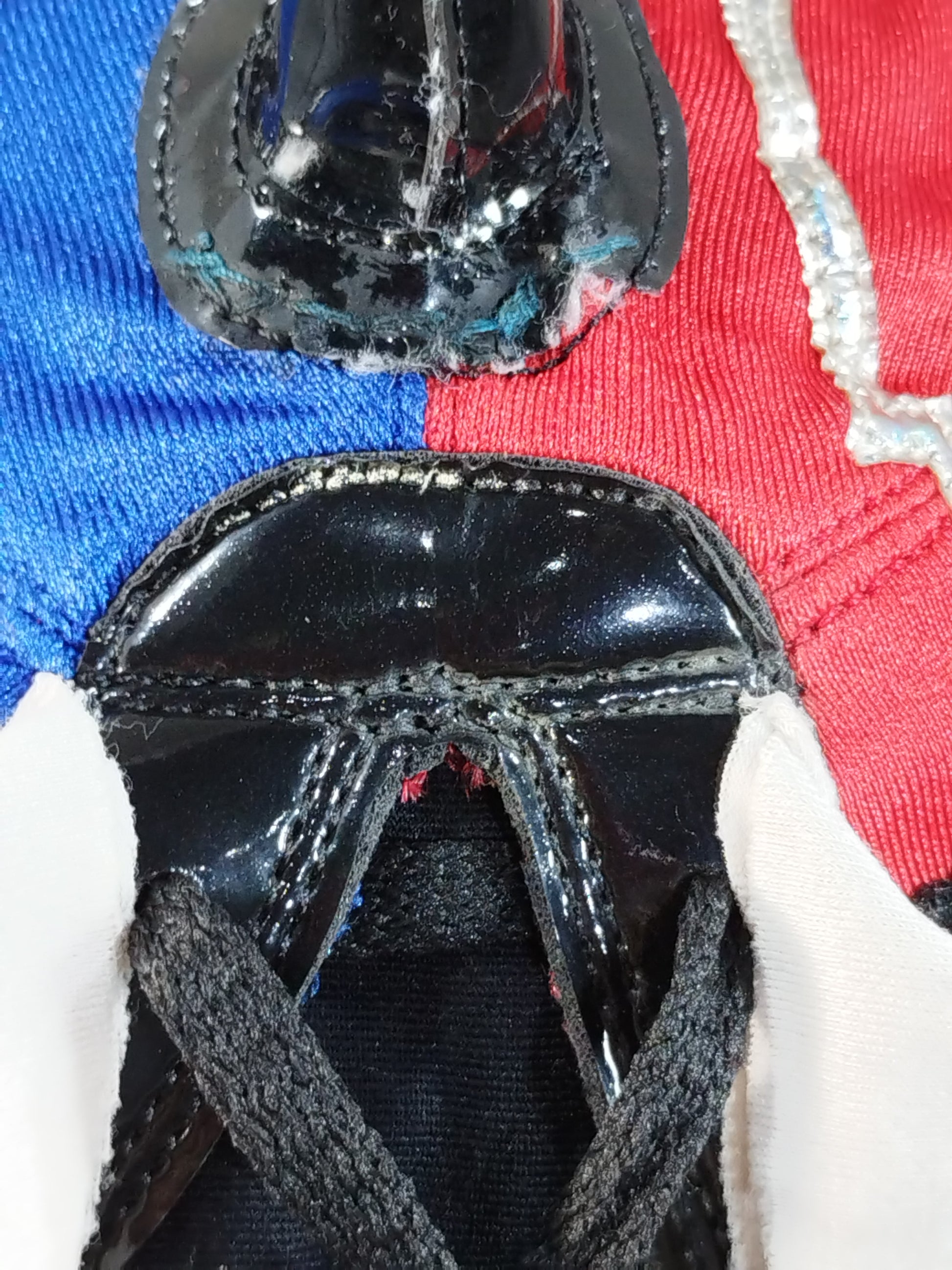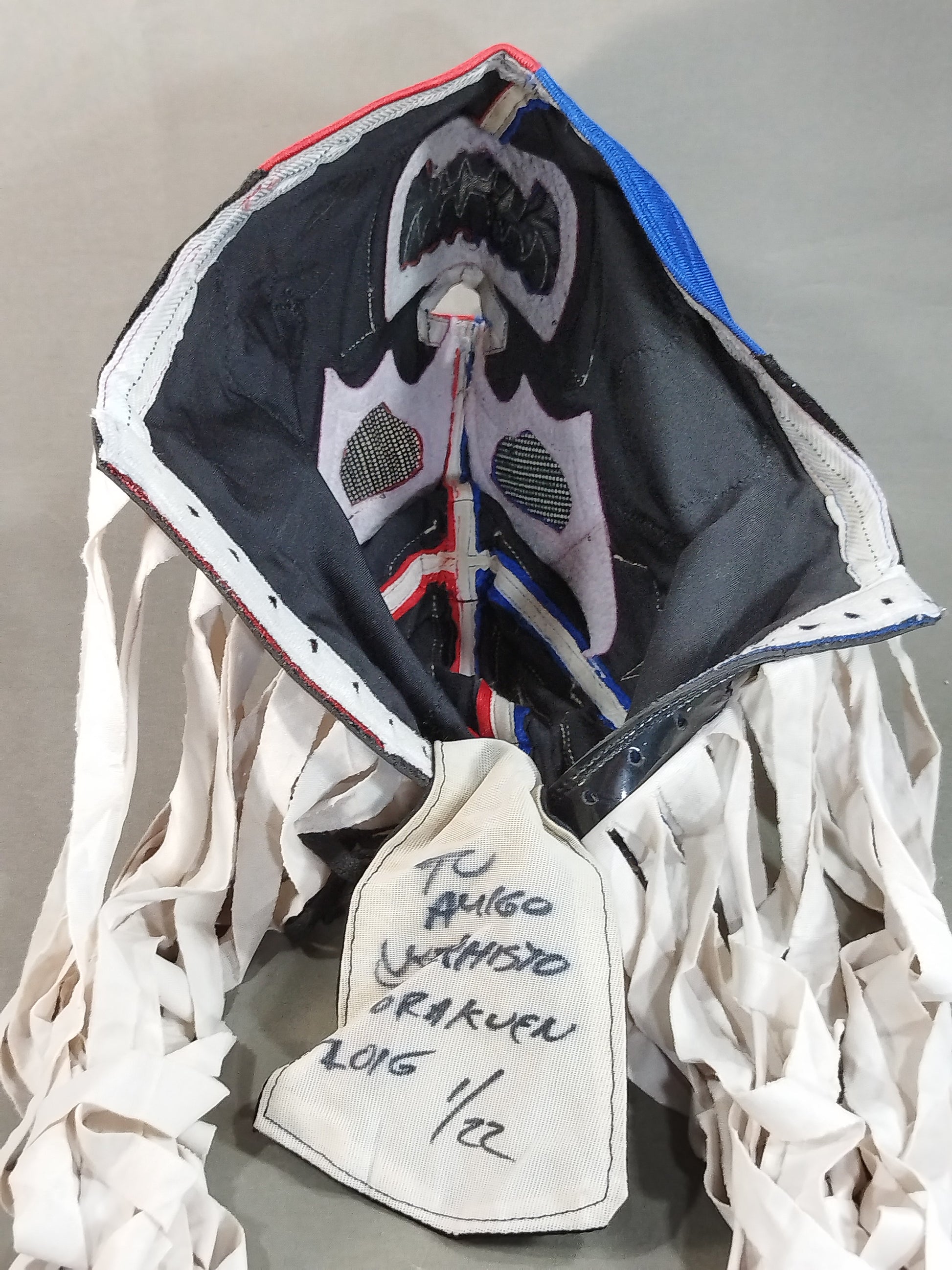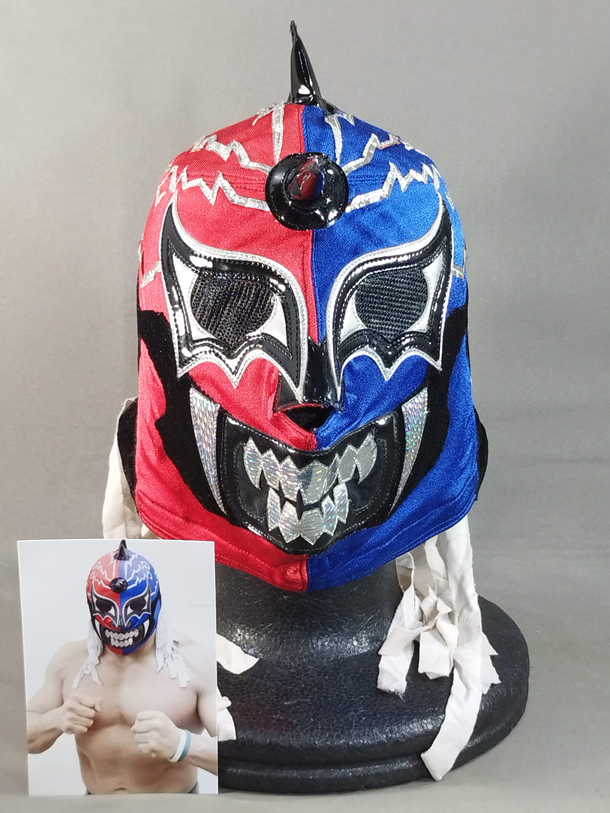 本人使用サイン入り(2016 1/22) 着用写真付 赤&青ハーフ厚手レオタード2重生地(一部黒ベロア生地) 銀地黒フチ&銀特殊フチ
