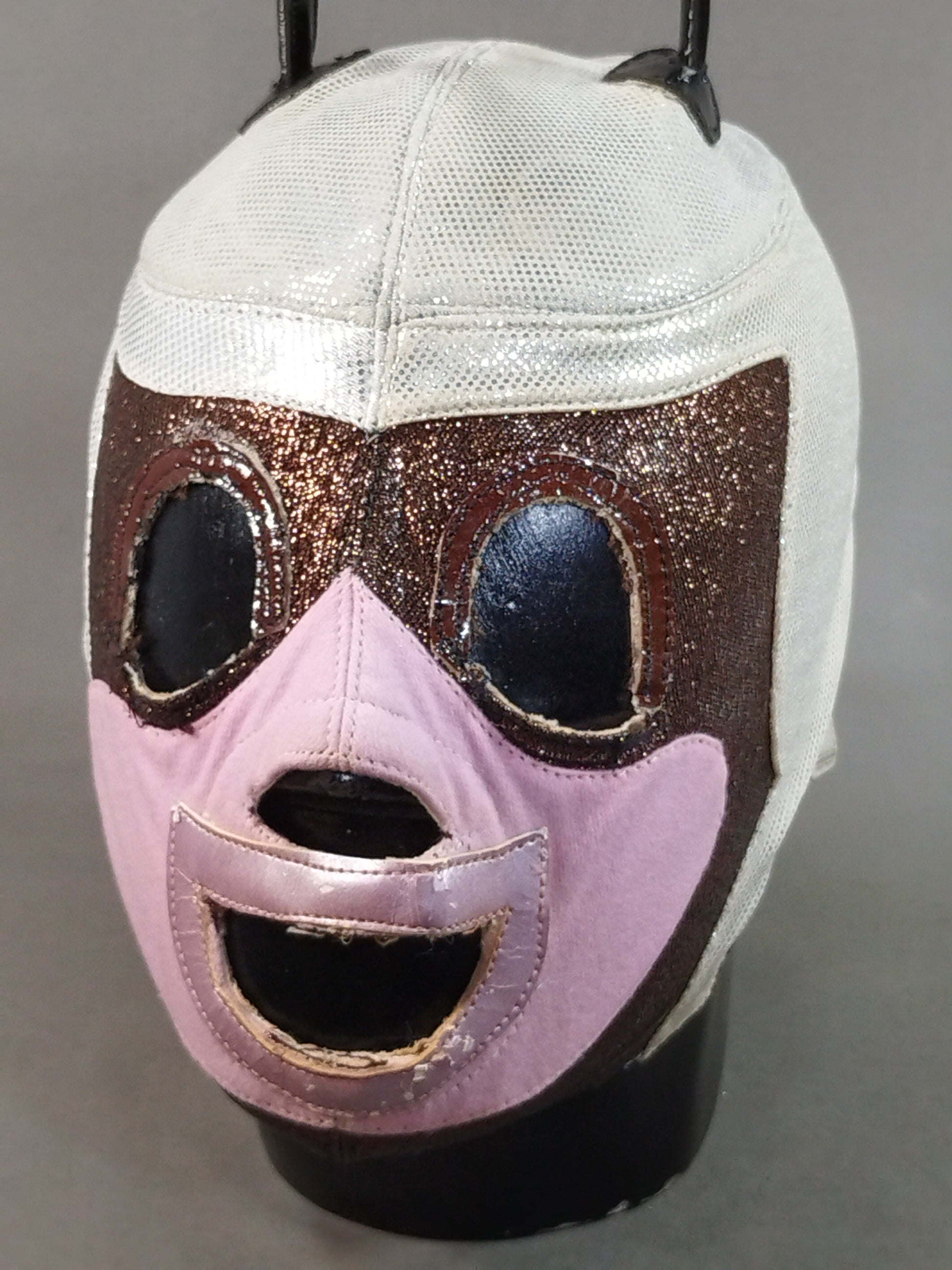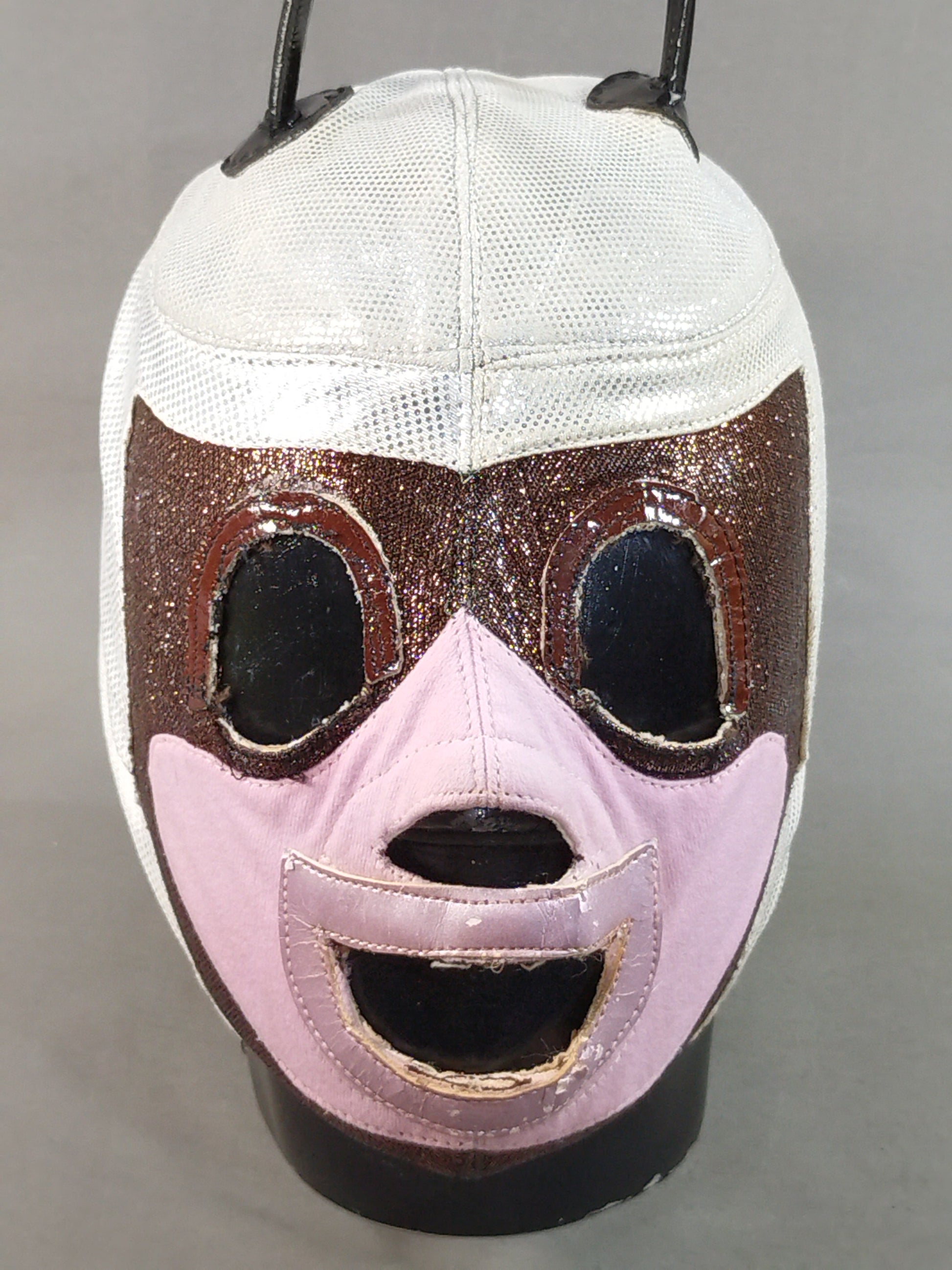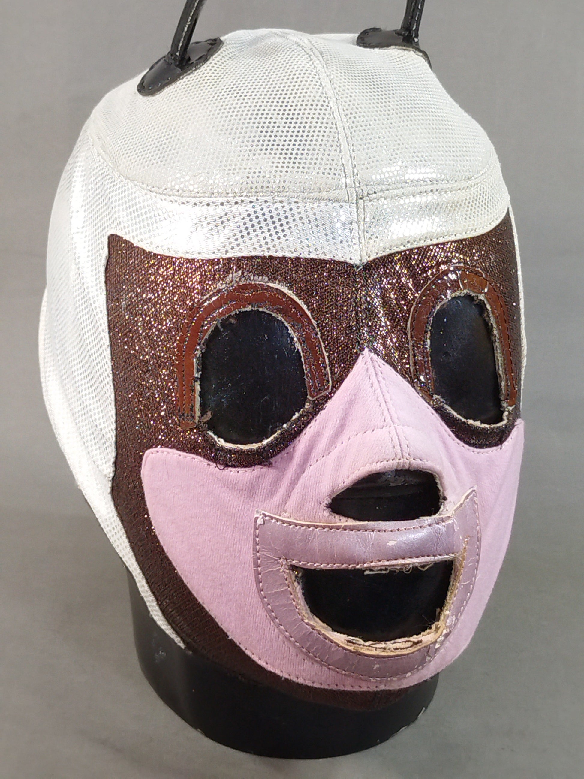 本人使用サイン入り 銀特殊レオタード2重生地(一部茶色ラメ&ピンク2重生地) 茶色革フチ&薄紫フチ