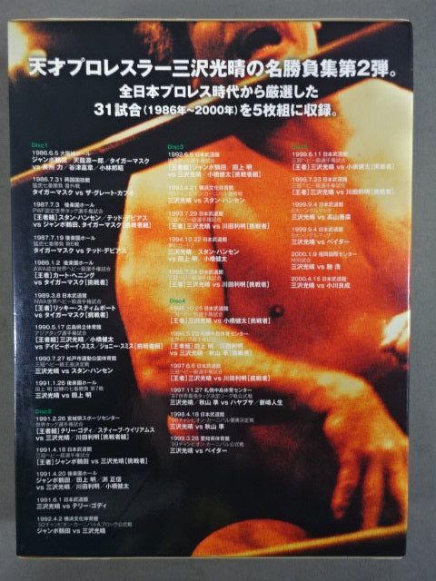 2009年6月に急逝した不世出の名レスラー・三沢光晴の名勝負の数々を収録したDVD-BOX第2弾!!日本プロレス史に燦然と輝くきら星の様な名勝負を多数残してきた三沢光晴の、全日本プロレス時代からプロレスリングNOAH旗揚げ後の試合まで、三沢選手がこれまで歩んできた壮絶なプロレス人生を総括したファンならずとも、プロレスを愛するすべての人必携の作品。