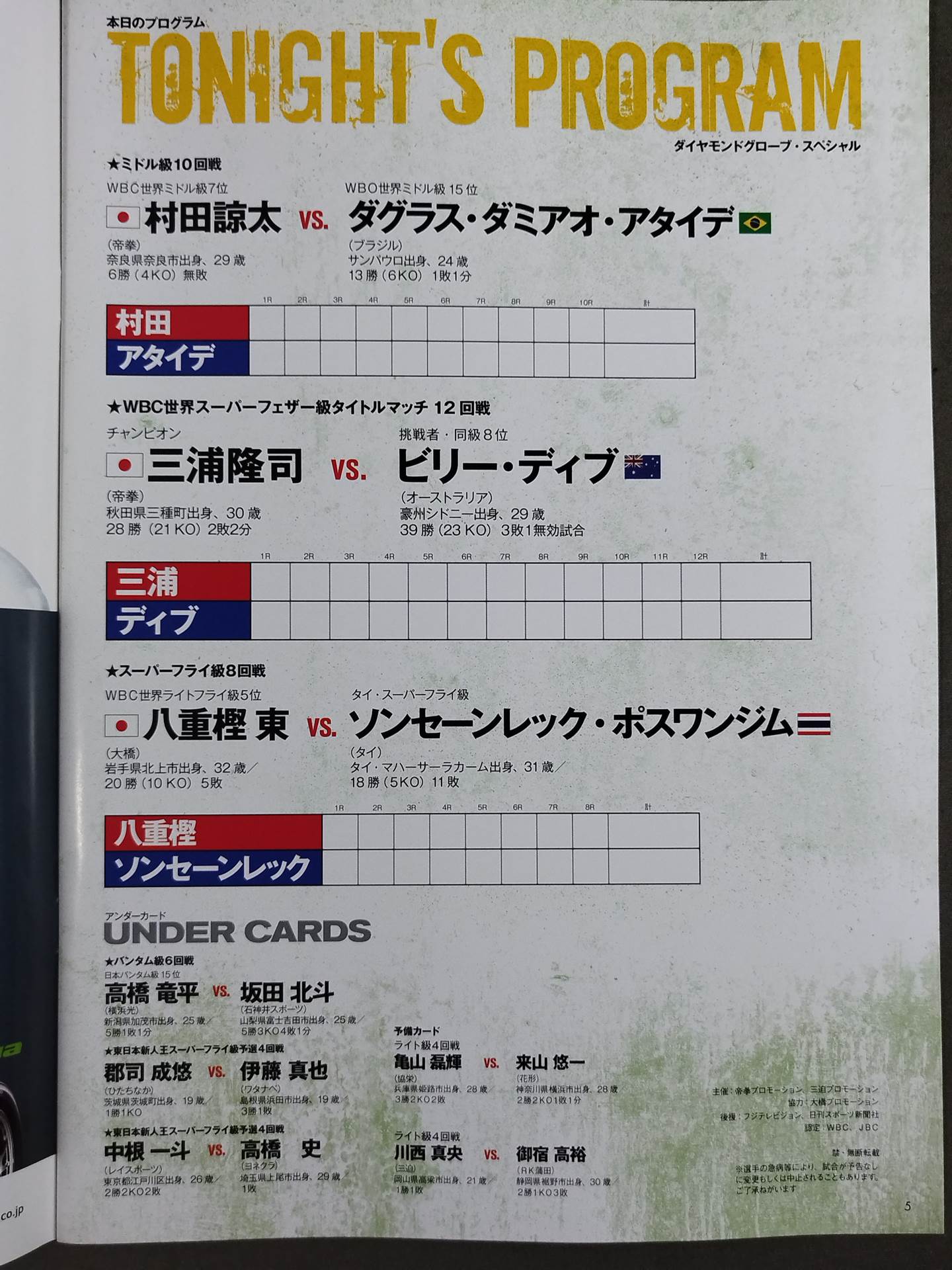 会場:大田区総合体育館 / 田村諒太vsダグラス・ダミアオ・アタイデ /【WBC世界スーパーフェザー級選手権試合】三浦隆司vsビリー・ディブ