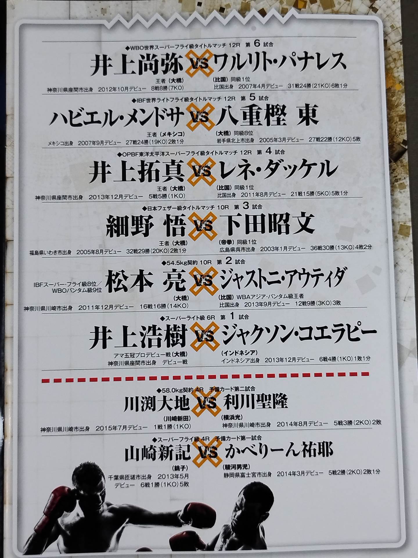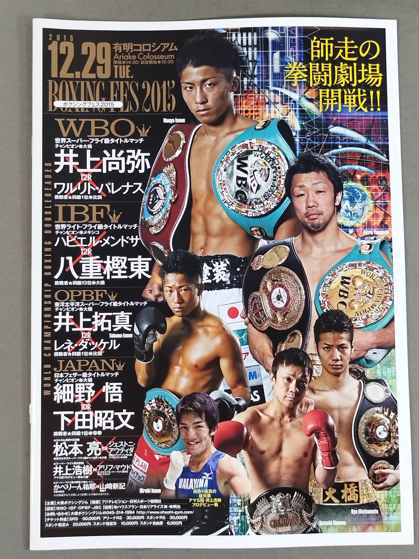 会場:有明コロシアム / 印刷対戦カード:【WBO世界スーパーフライ級タイトルマッチ】井上尚弥vsワルリト・パレナス /【IBF世界ライトフライ級タイトルマッチ】ハビエル・メンドサvs八重樫東 / BOXING FES 2015