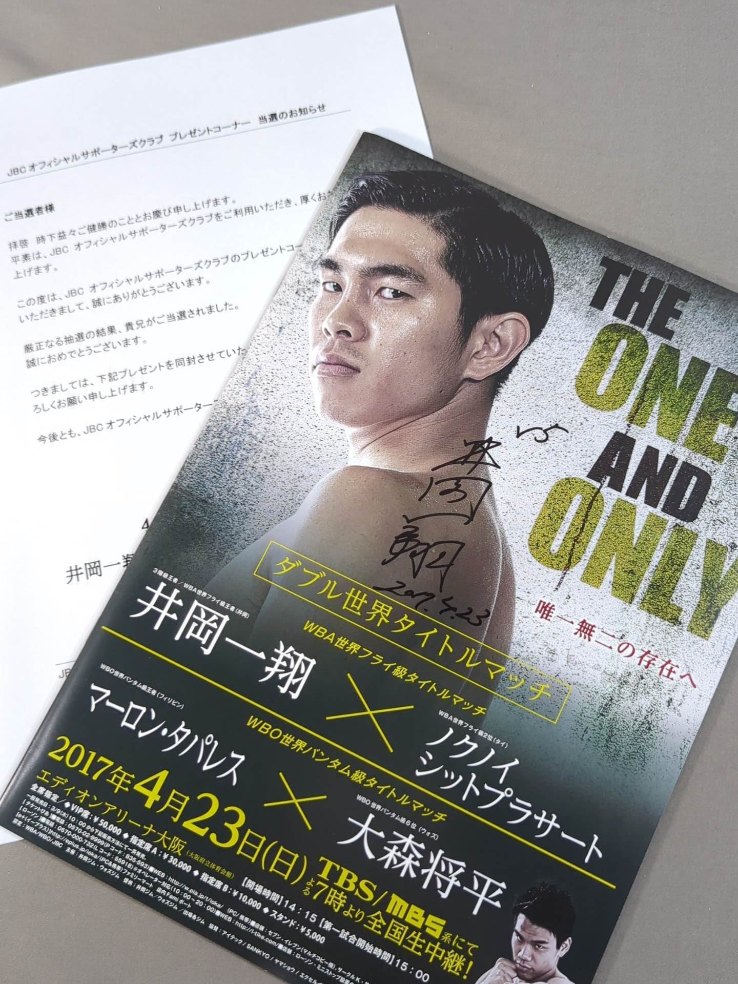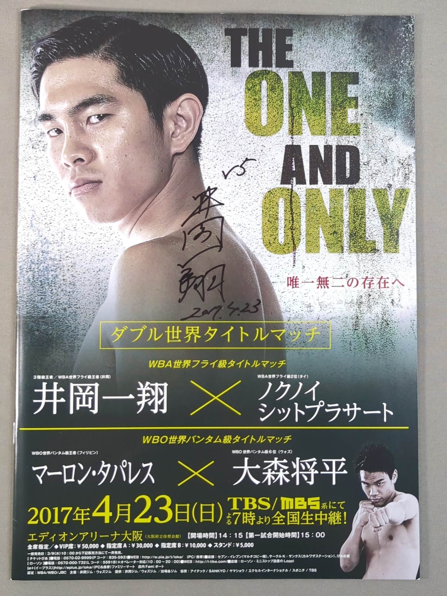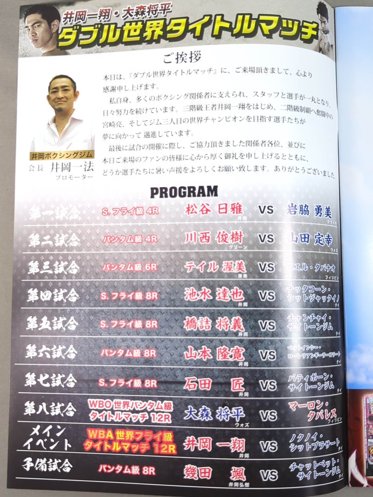 会場:エディオンアリーナ大阪 / 印刷対戦カード:【WBA世界フライ級タイトルマッチ】井岡一翔vsノクノイ・シットプラサート /【WBO世界バンタム級タイトルマッチ】マーロン・タパレスvs大森将平