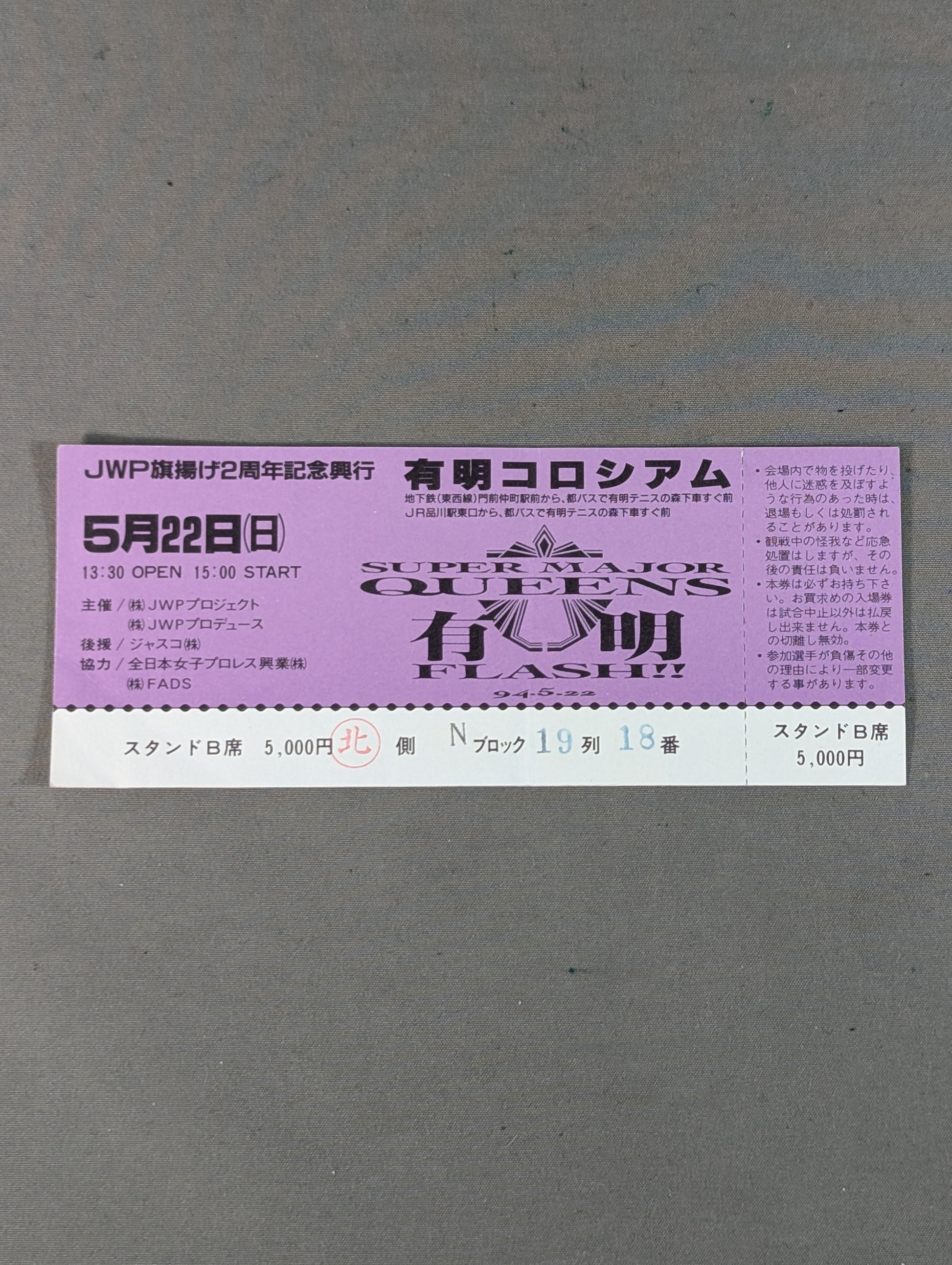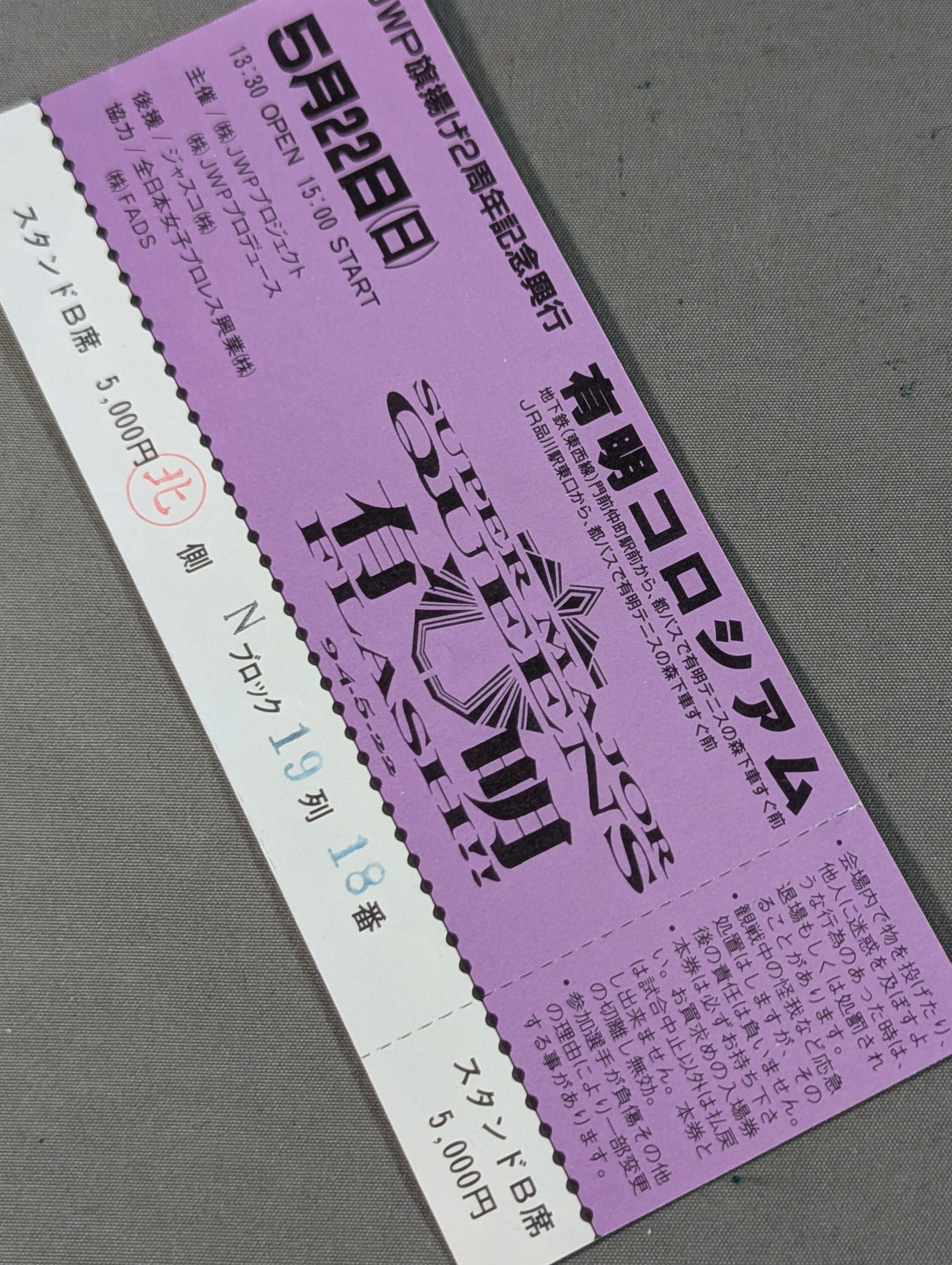 スタンドB席 北側Nブロック19列18番 /【WWWA世界シングル選手権】アジャ・コングvsダイナマイト関西 / 【オーバー・ザ・ジェネレーション・グラッジマッチ】長与千種vs尾崎魔弓 / 【スーパースクランブル”THE世代闘争”】ブル中野&デビル雅美vs福岡晶&長谷川咲江 / 【キューティー・スペシャル・ヴァーサス・タカコ・パニック】キューティー鈴木vs井上貴子