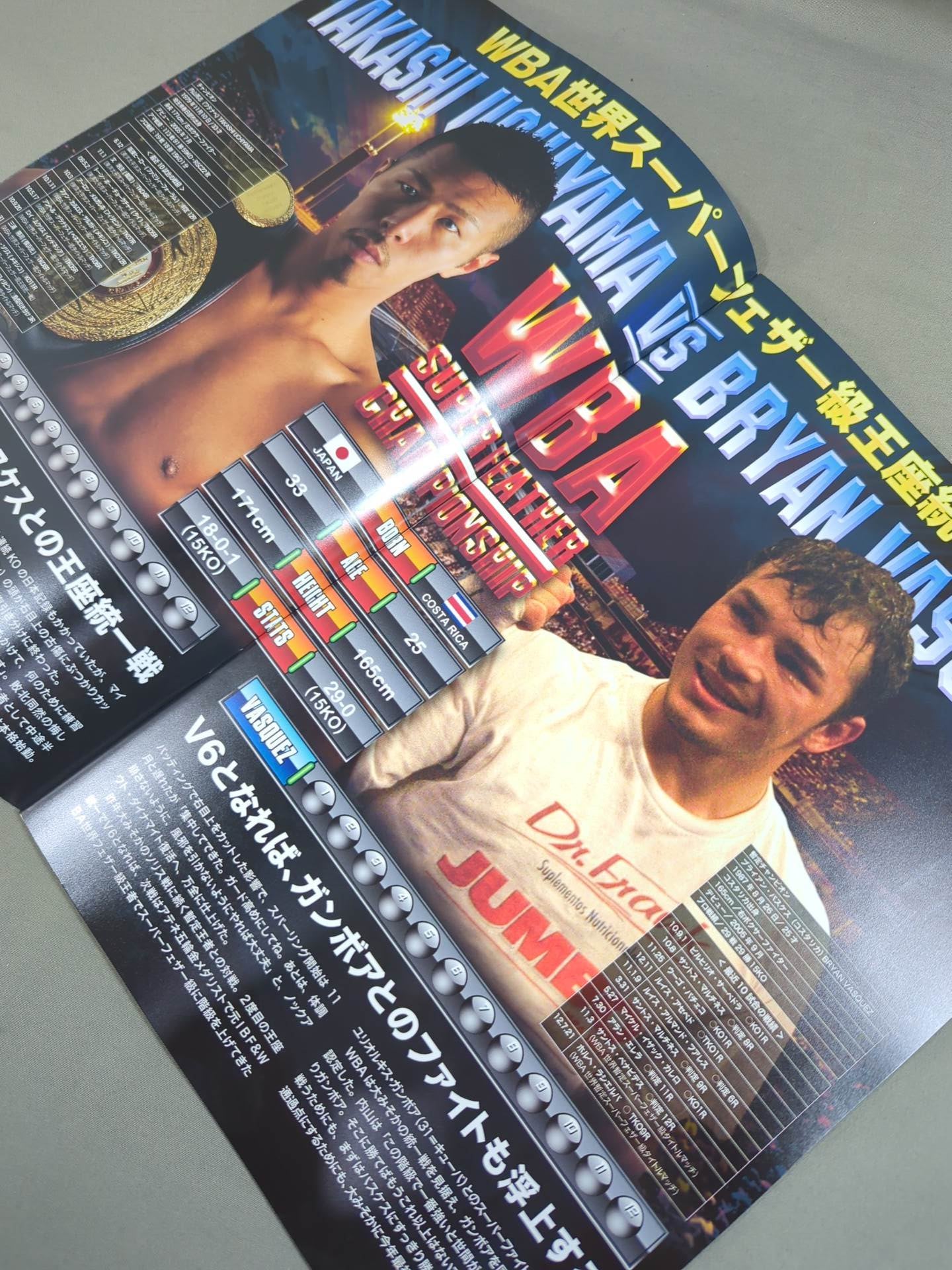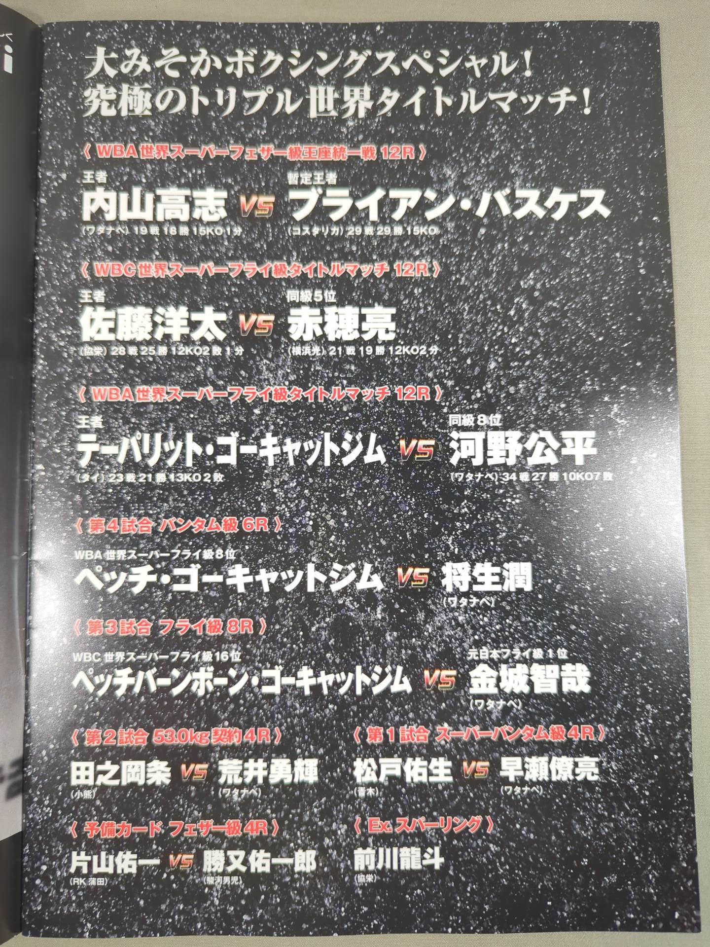 会場:大田区総合体育館 / 印刷対戦カード:【WBA世界スーパーフェザー級王座統一戦】内山高志vsブライアン・バスケス / 【WBA世界スーパーフライ級タイトルマッチ】テーパリット・ゴーキャットジムvs河野公平 / 【WBC世界スーパーフライ級タイトルマッチ】佐藤洋太vs赤穂亮 / THE BEST OF BEST 究極の3大世界戦