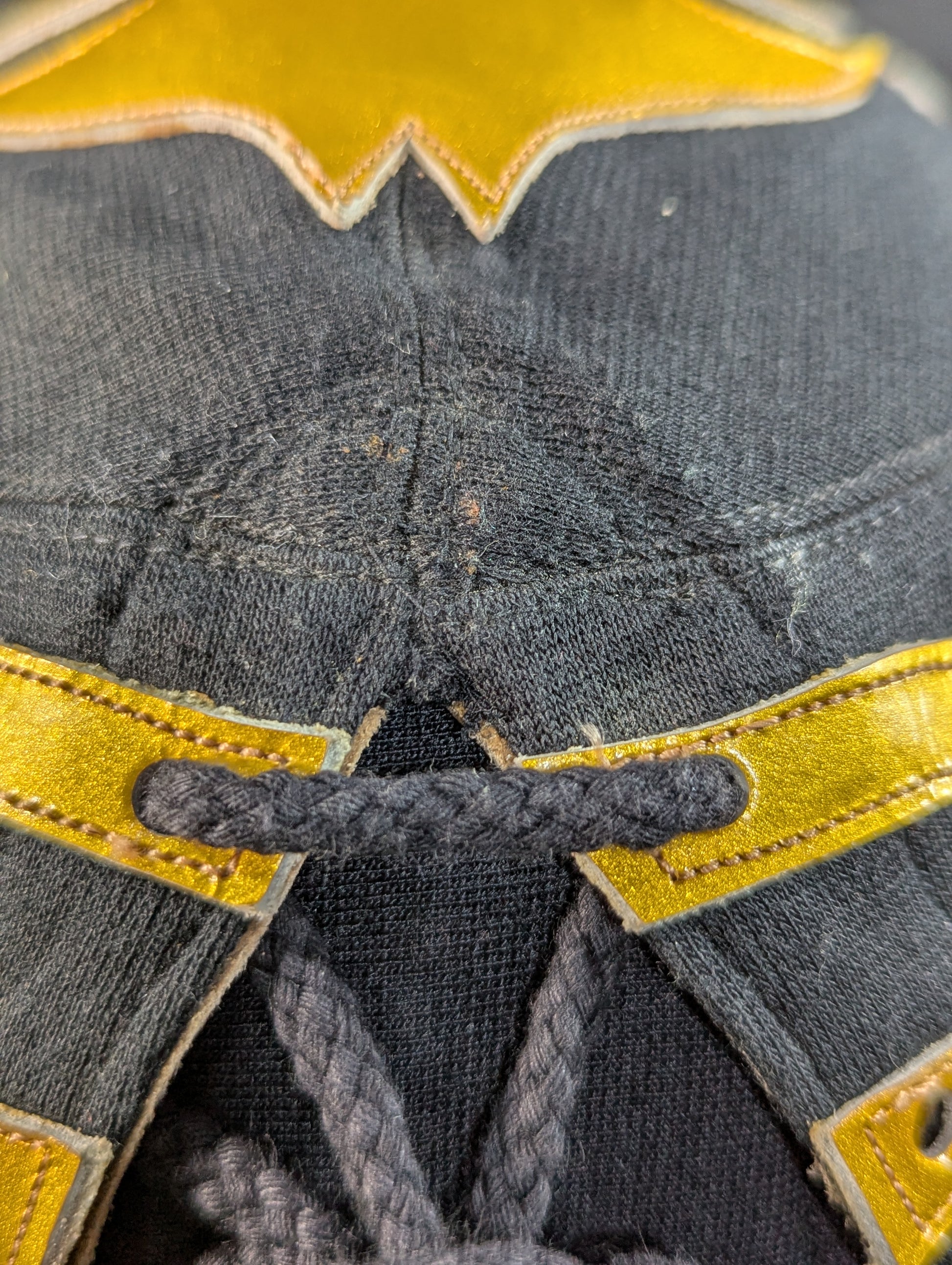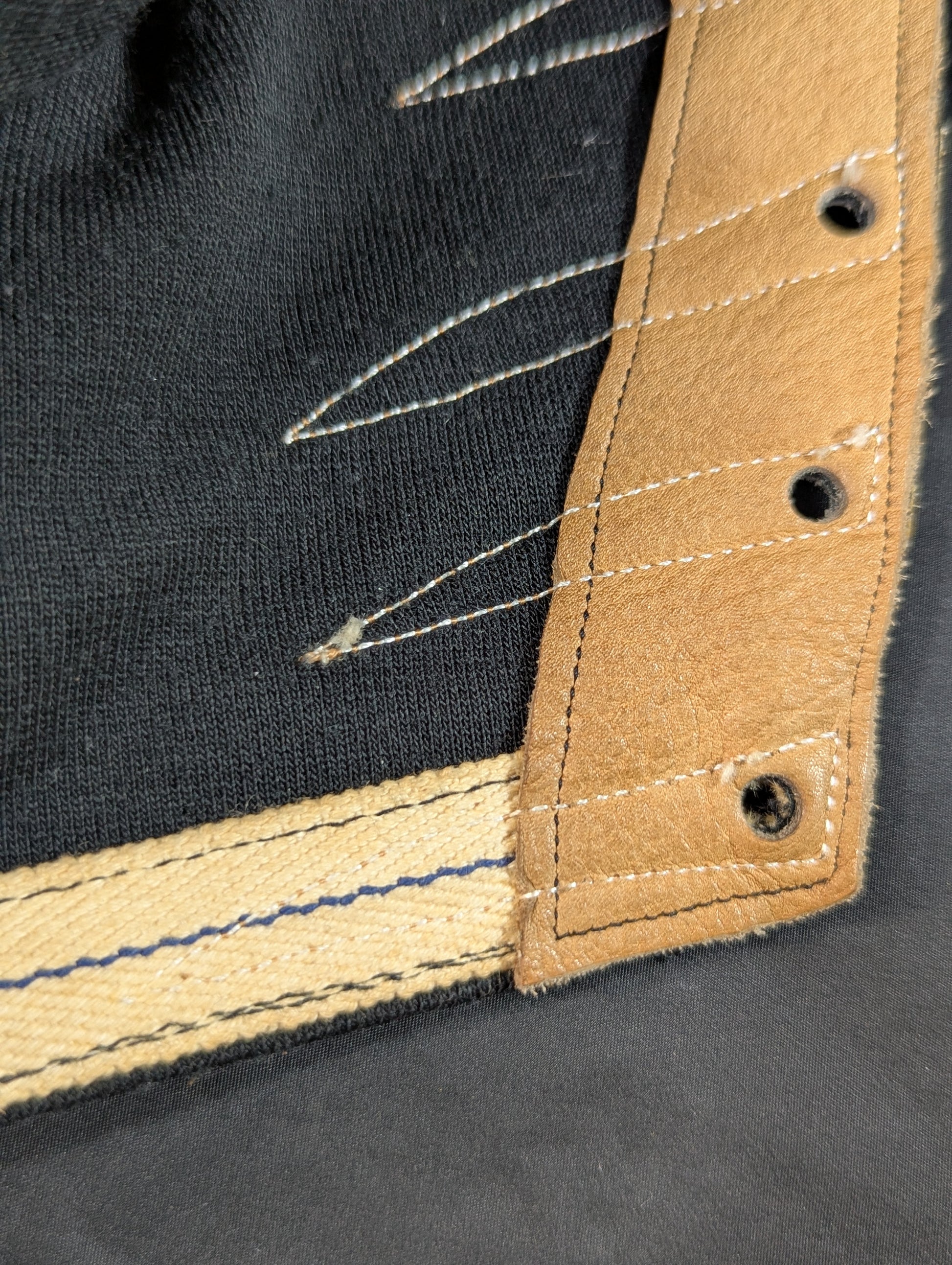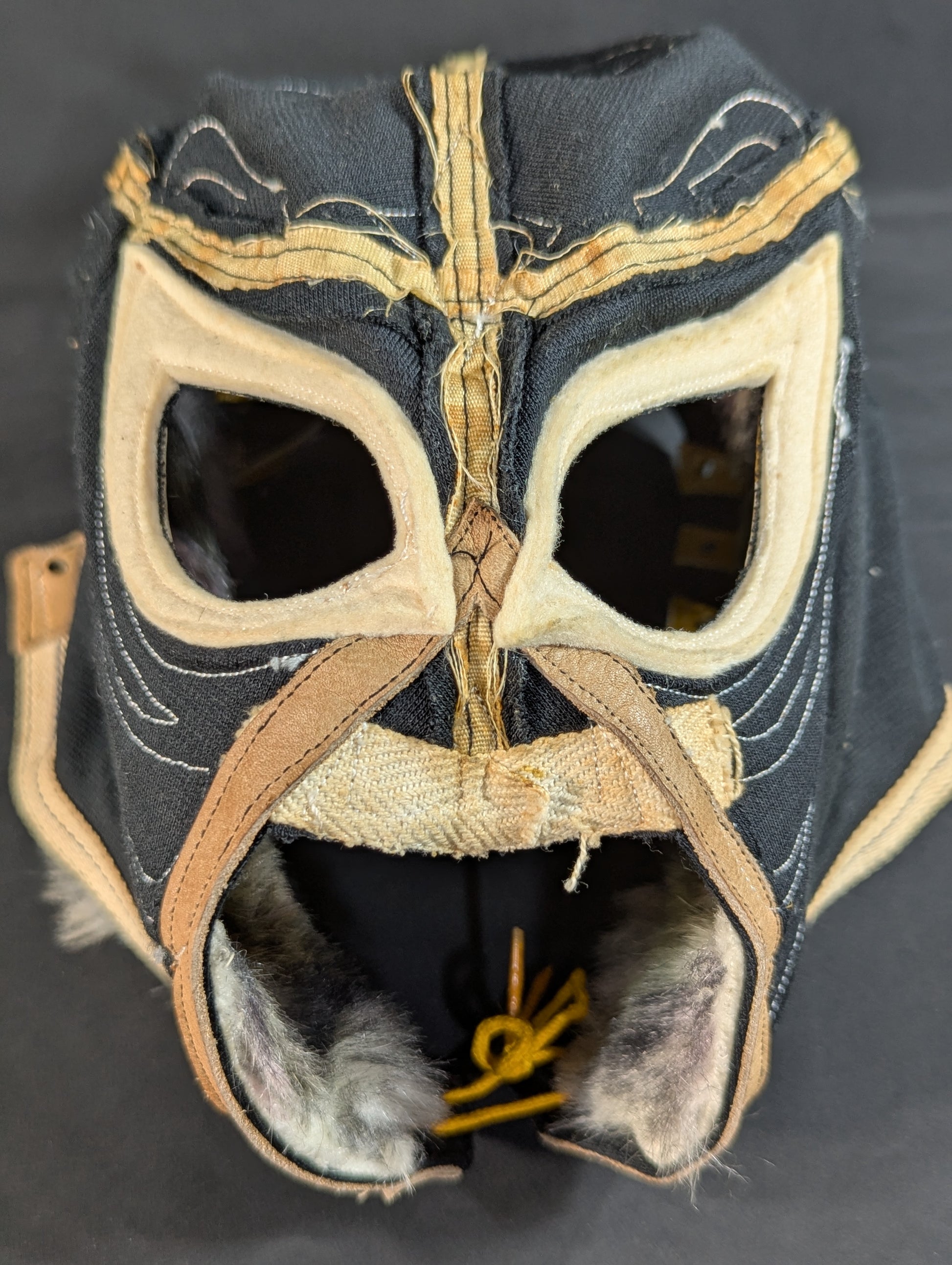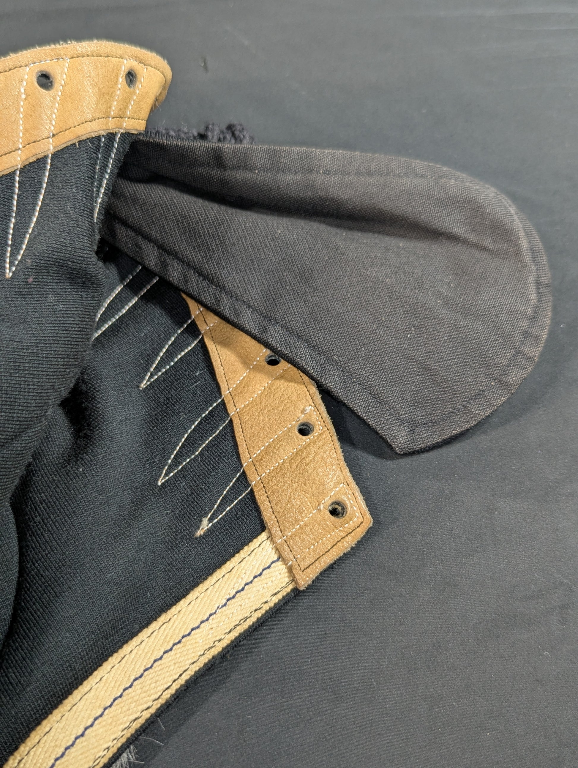 ★80年代当時モノ★ 黒ジャージ生地(ウール) 辛子金革フチ ベロは同色のウール素材と綿素材 喉テープは縦幅1.7cmで青糸のセンターステッチ入り(黒糸ステッチ上1本、下2本) 裏当ては目の周りに厚みが約5mmの白フェルト、口周りは薄茶色の本革 アイデアル十字テープ ボア着色 1984年に山崎一彦氏が製作したもの