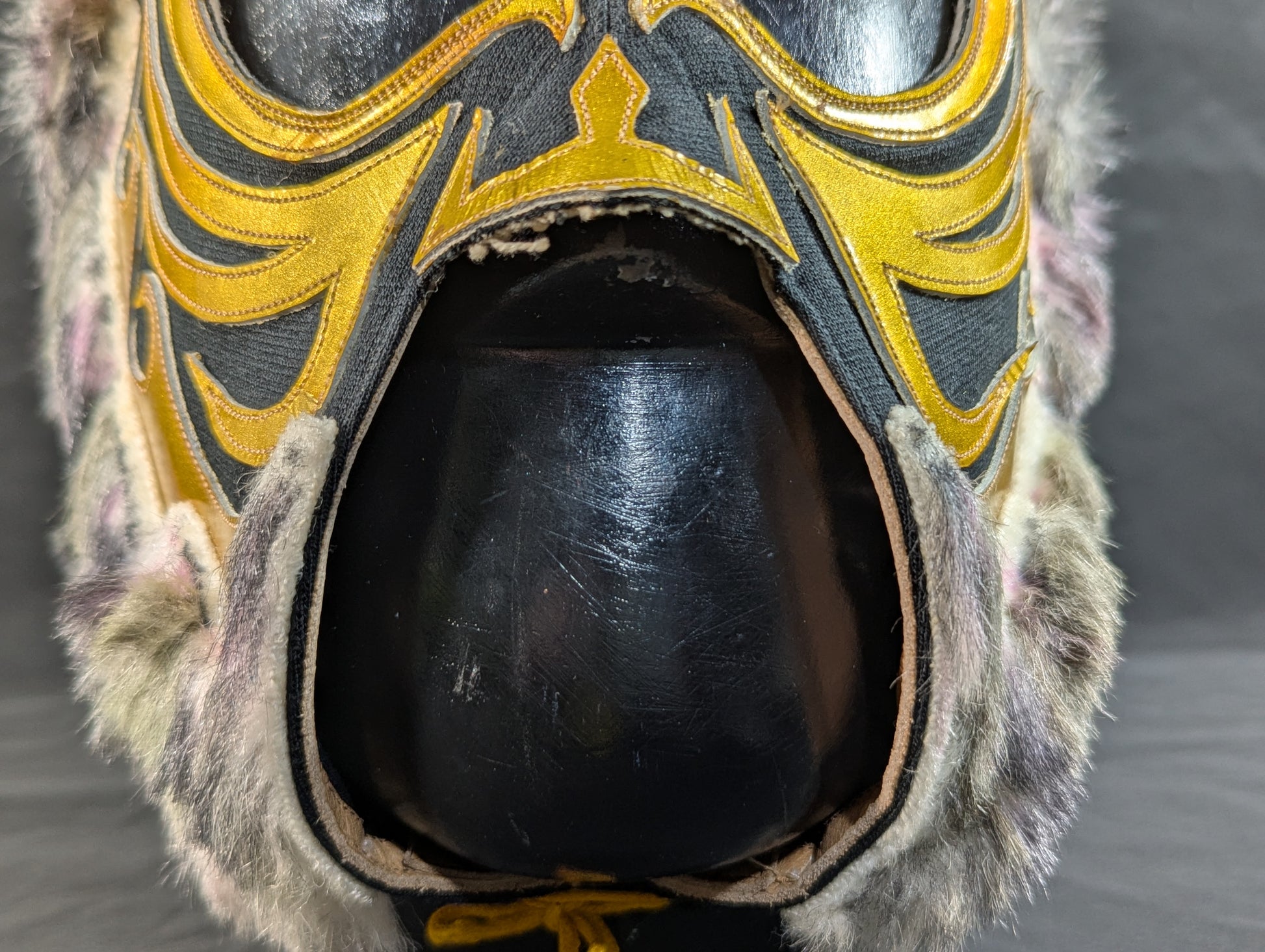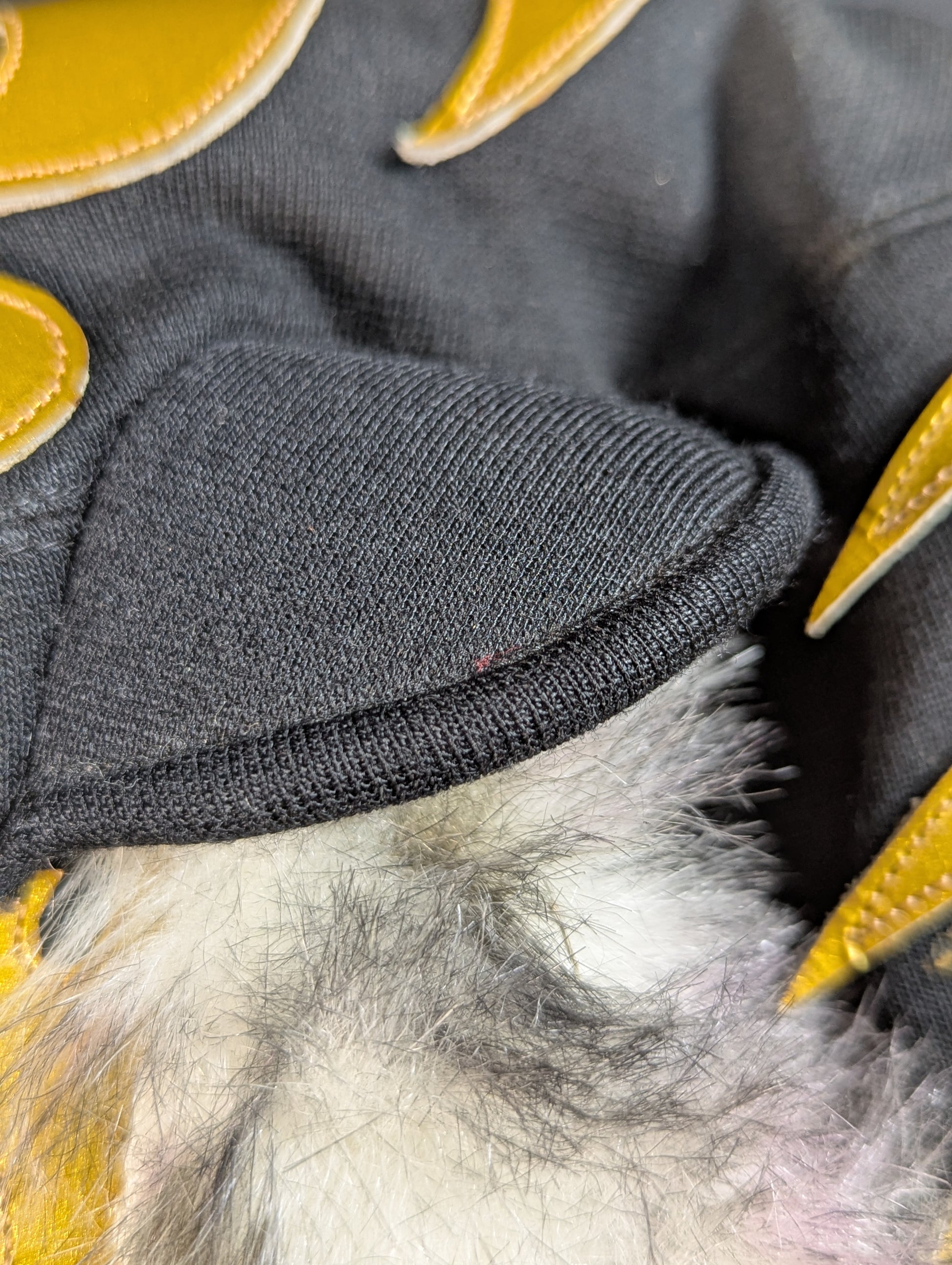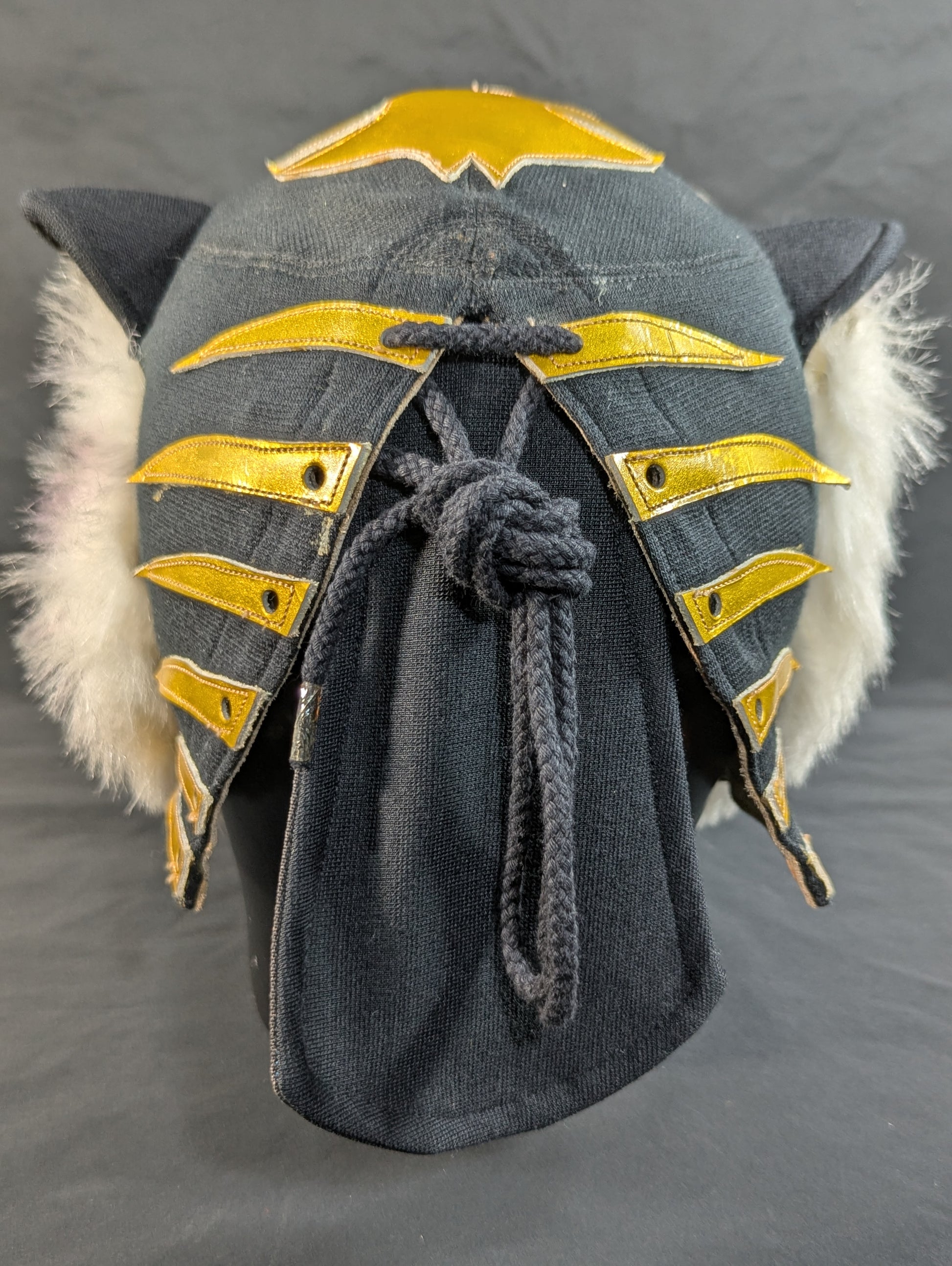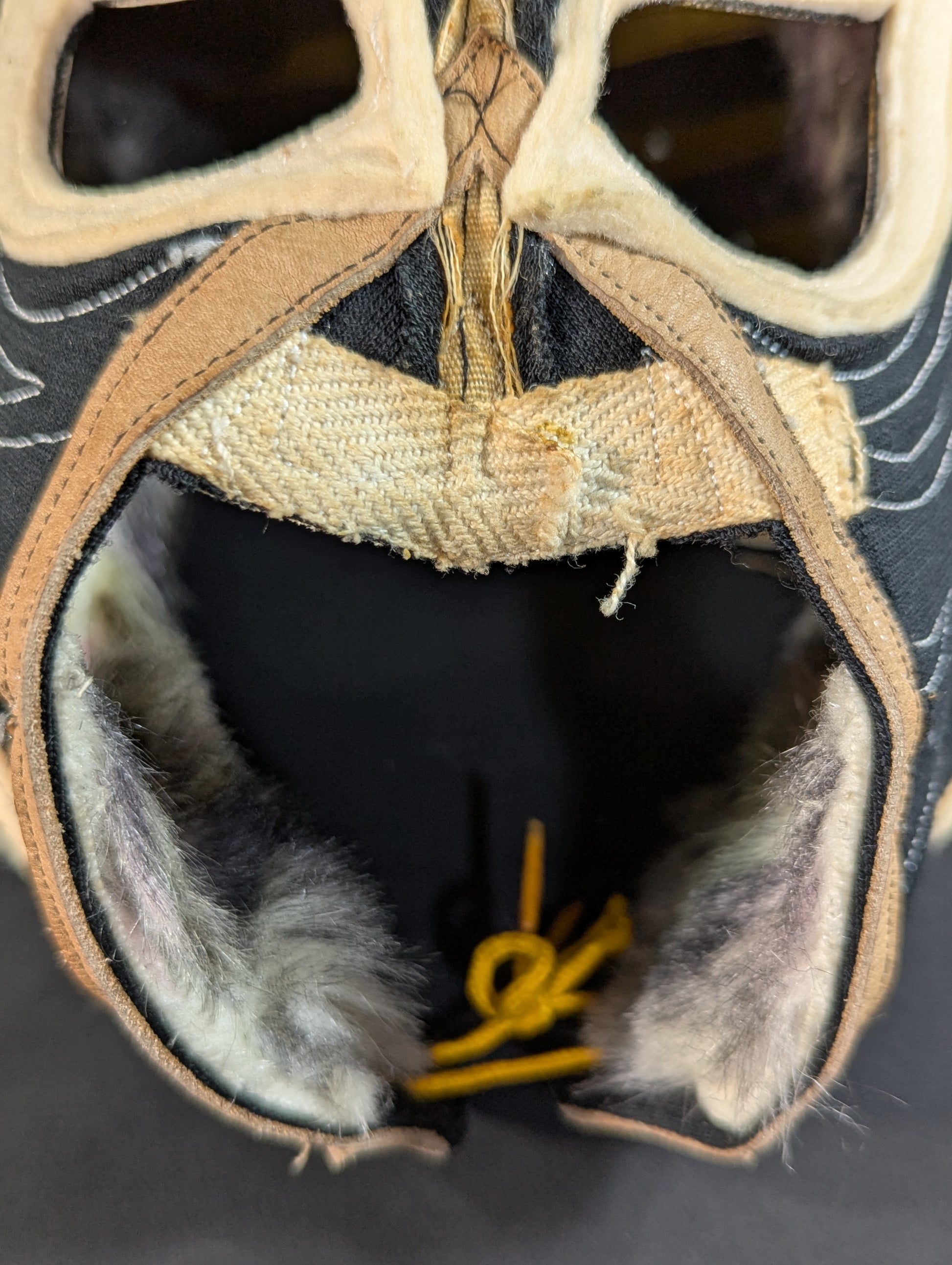 ★80年代当時モノ★ 黒ジャージ生地(ウール) 辛子金革フチ ベロは同色のウール素材と綿素材 喉テープは縦幅1.7cmで青糸のセンターステッチ入り(黒糸ステッチ上1本、下2本) 裏当ては目の周りに厚みが約5mmの白フェルト、口周りは薄茶色の本革 アイデアル十字テープ ボア着色 1984年に山崎一彦氏が製作したもの