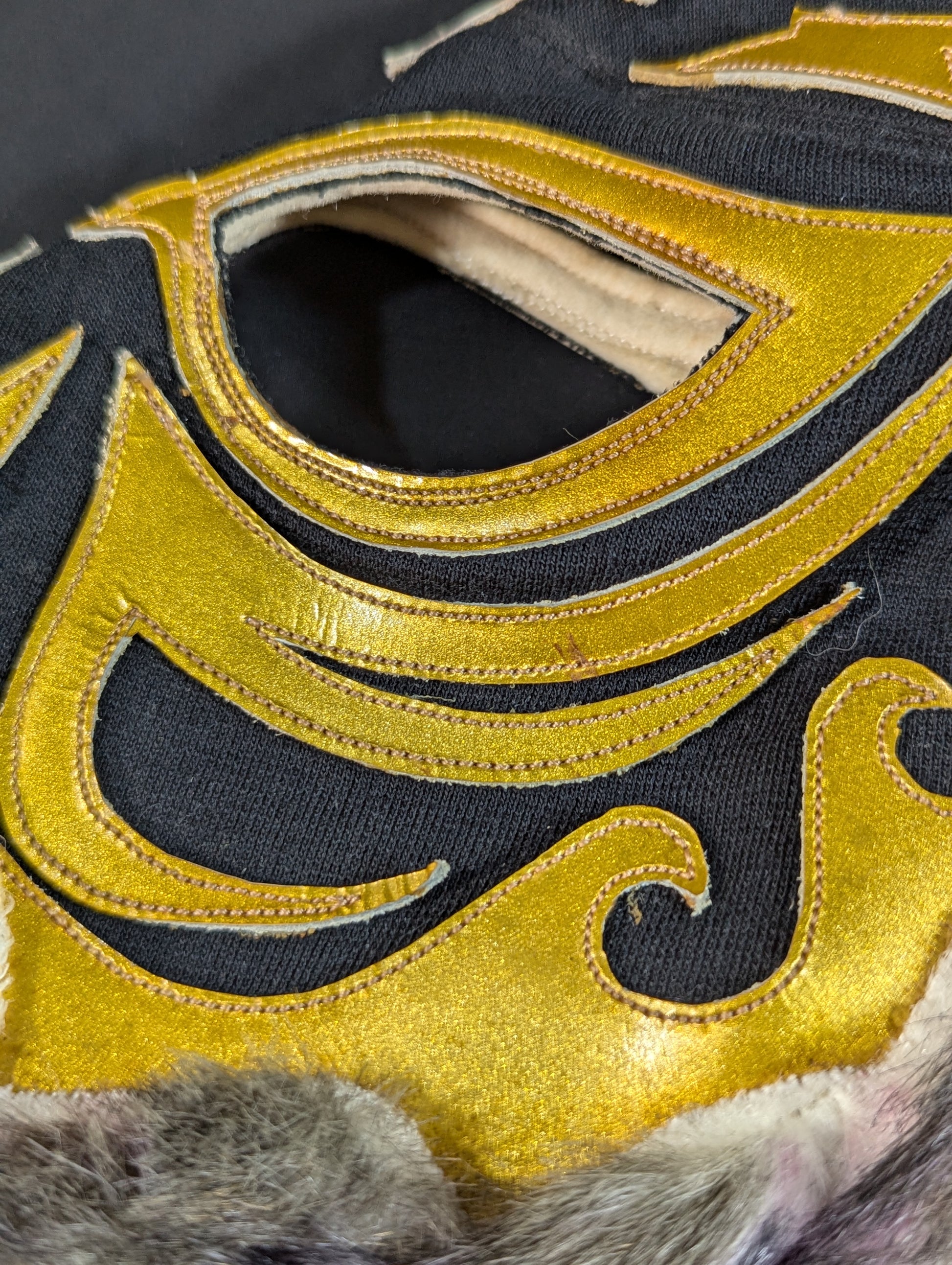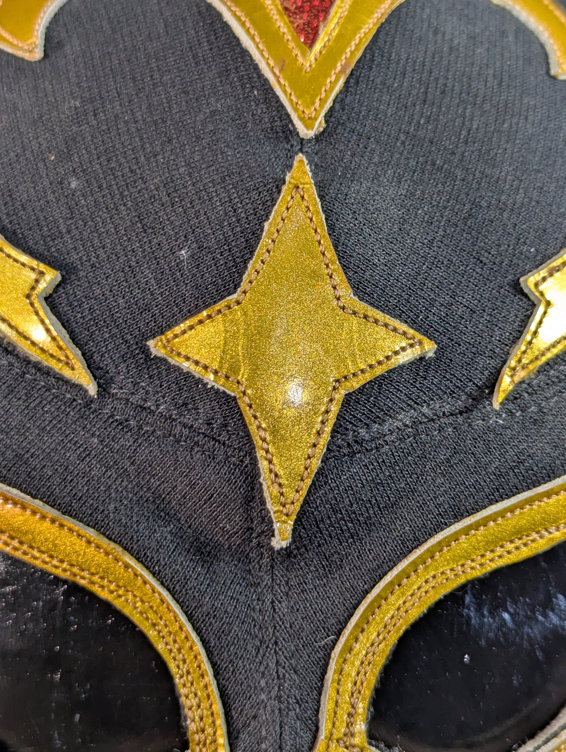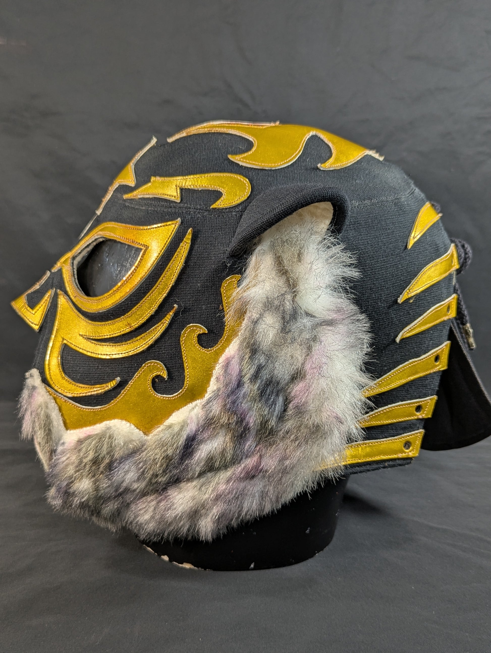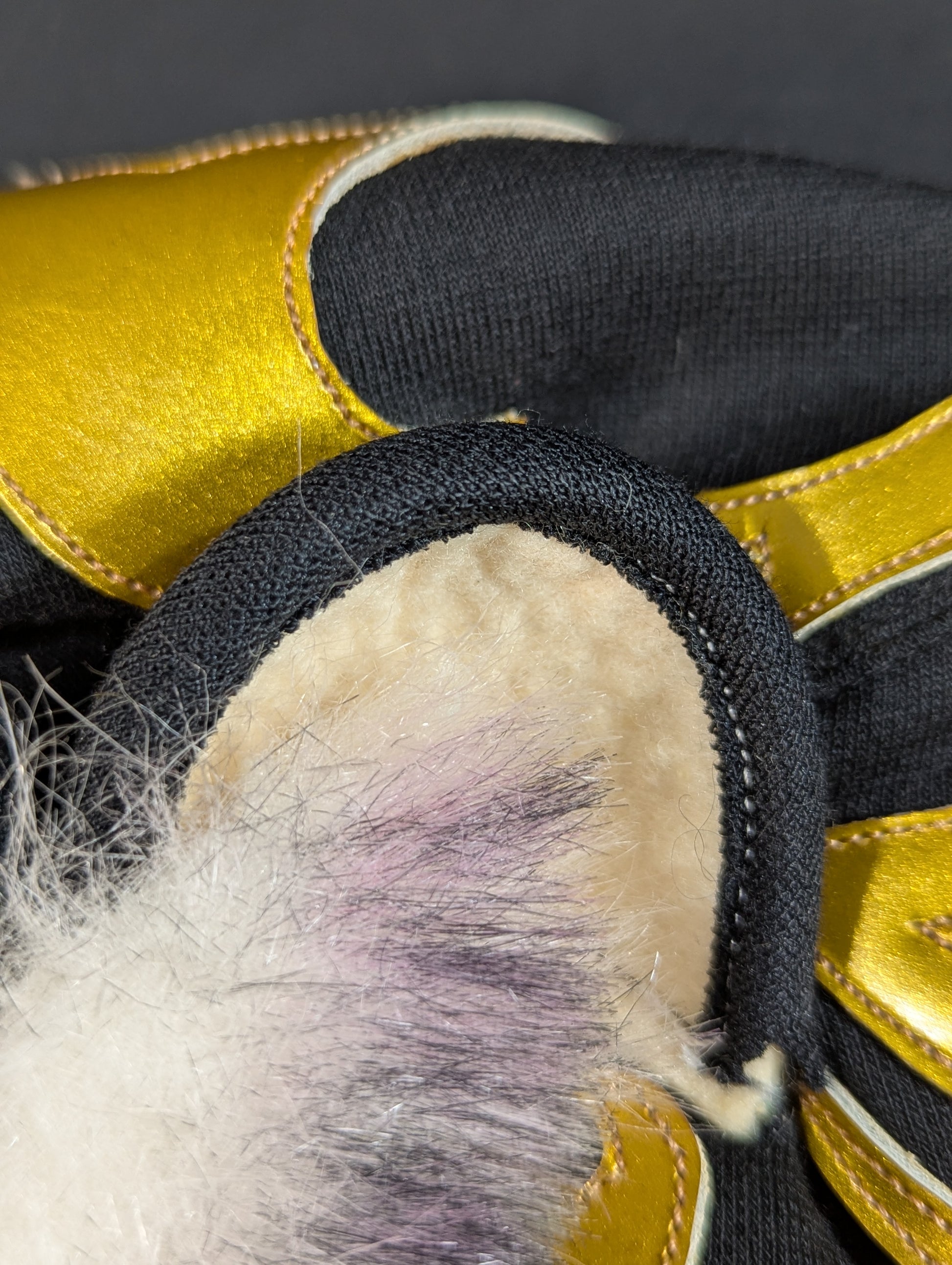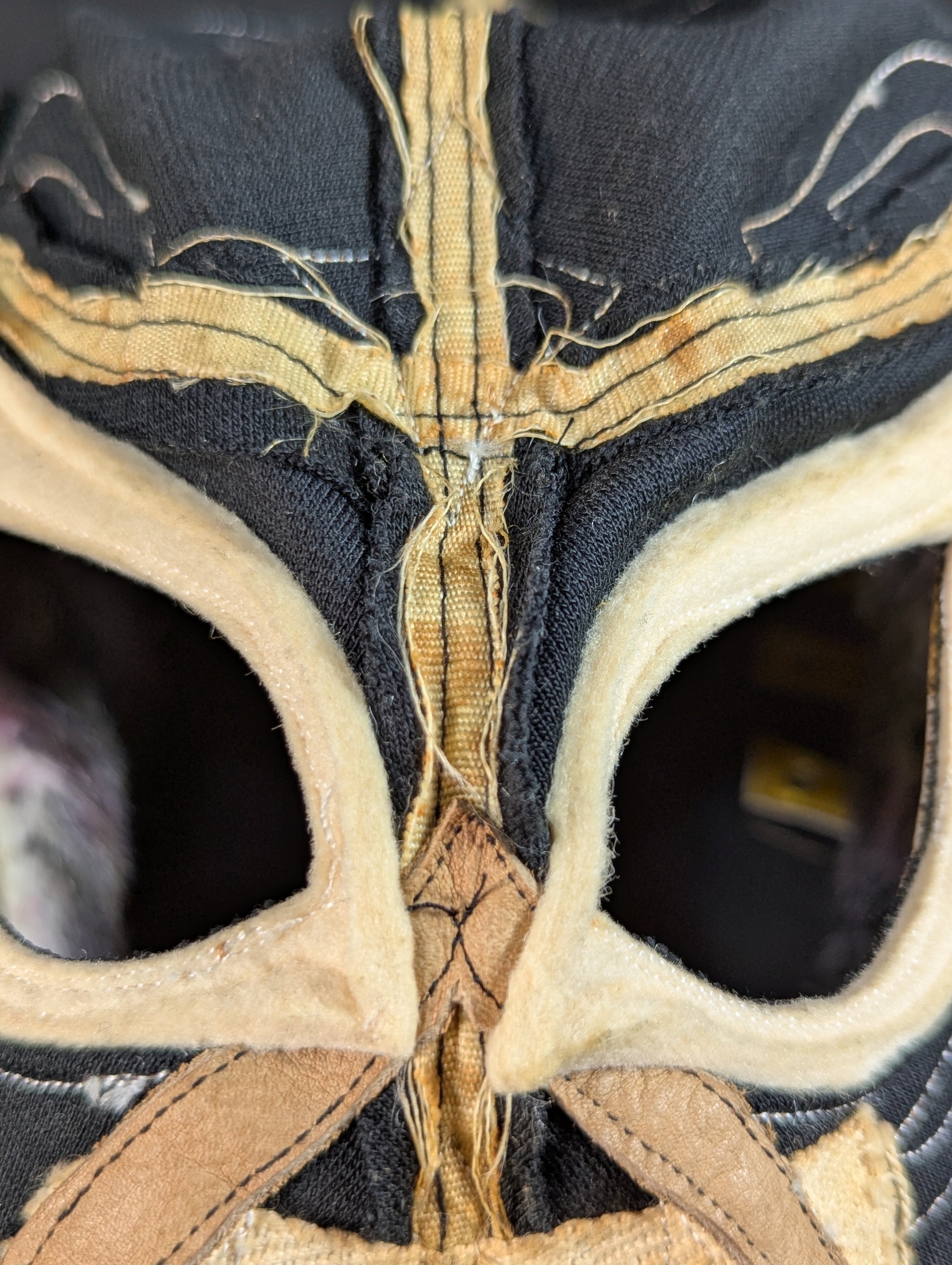★80年代当時モノ★ 黒ジャージ生地(ウール) 辛子金革フチ ベロは同色のウール素材と綿素材 喉テープは縦幅1.7cmで青糸のセンターステッチ入り(黒糸ステッチ上1本、下2本) 裏当ては目の周りに厚みが約5mmの白フェルト、口周りは薄茶色の本革 アイデアル十字テープ ボア着色 1984年に山崎一彦氏が製作したもの