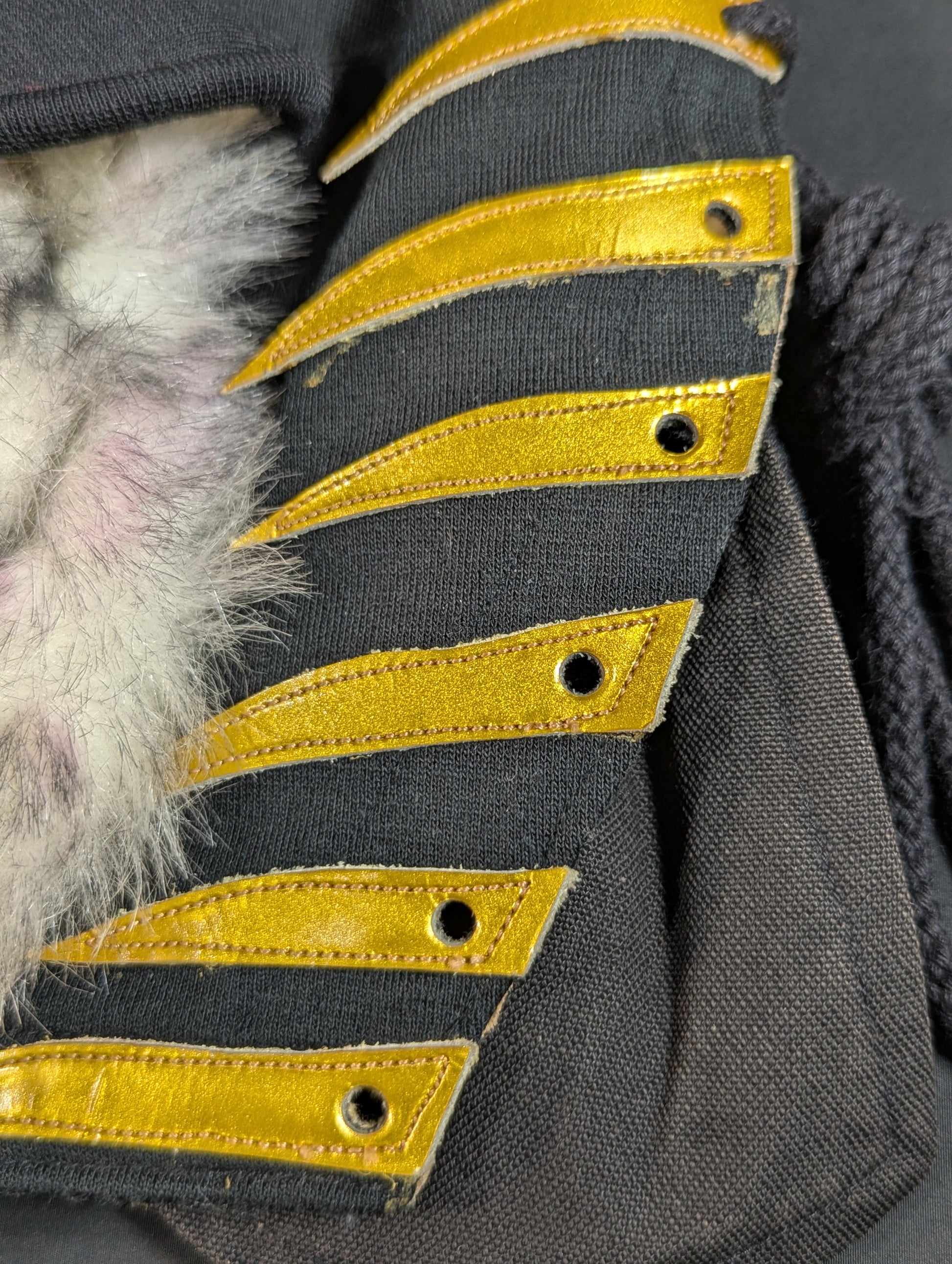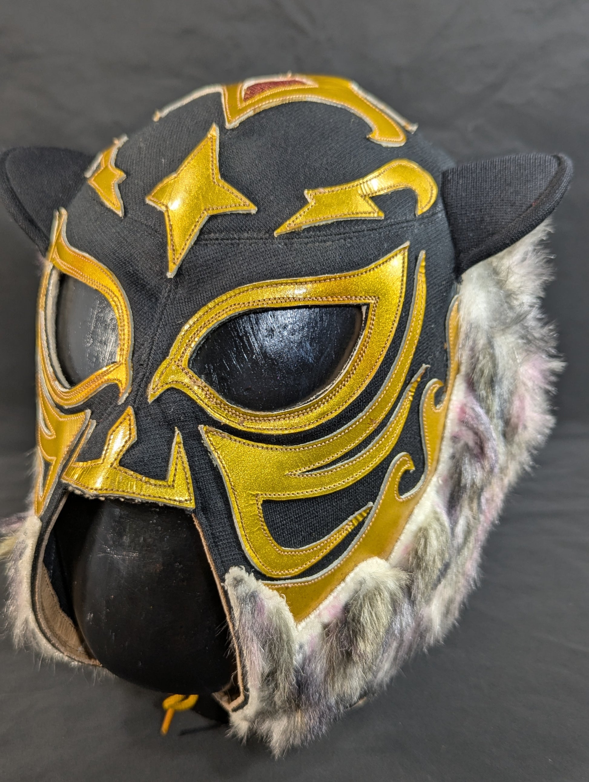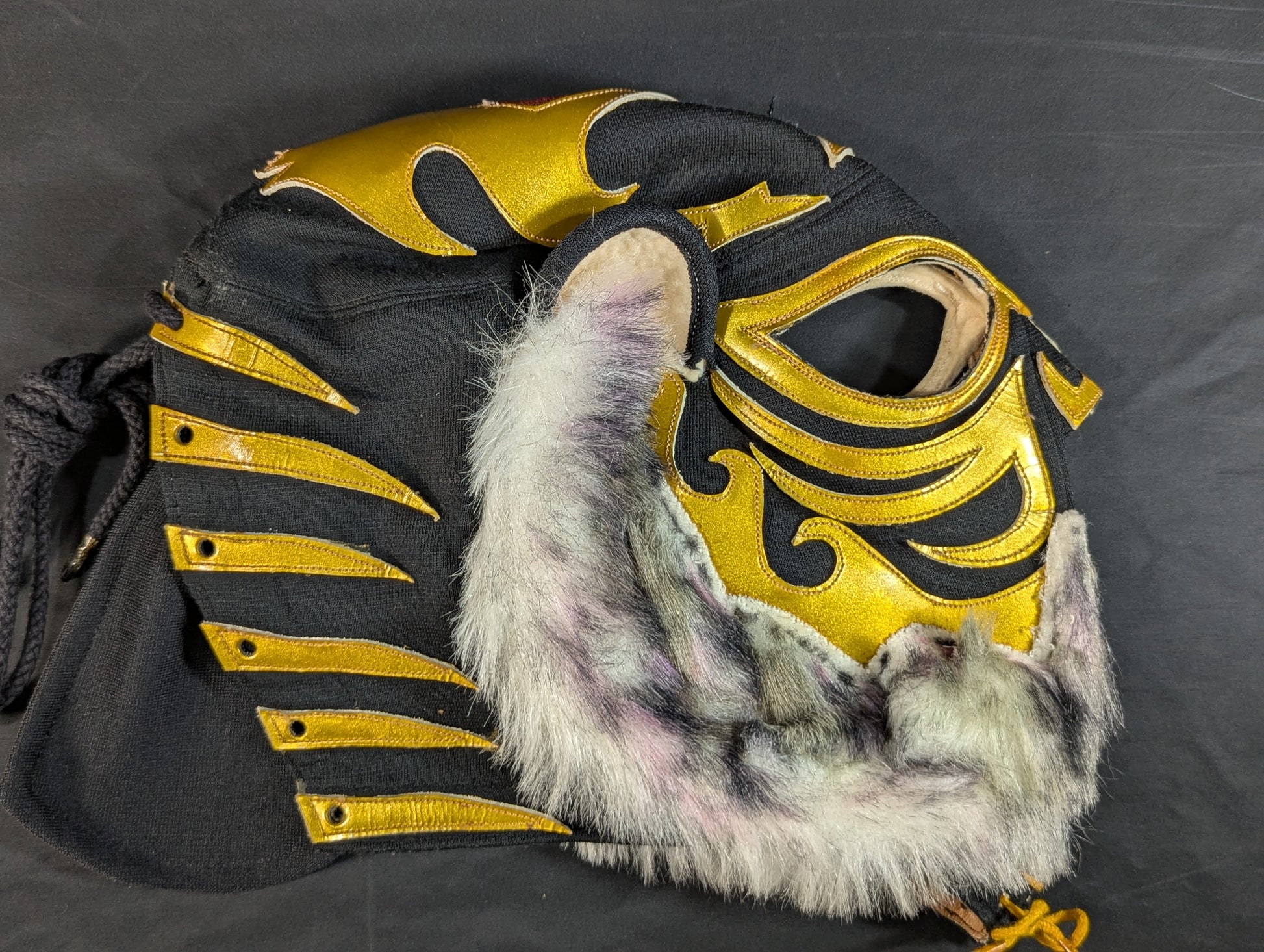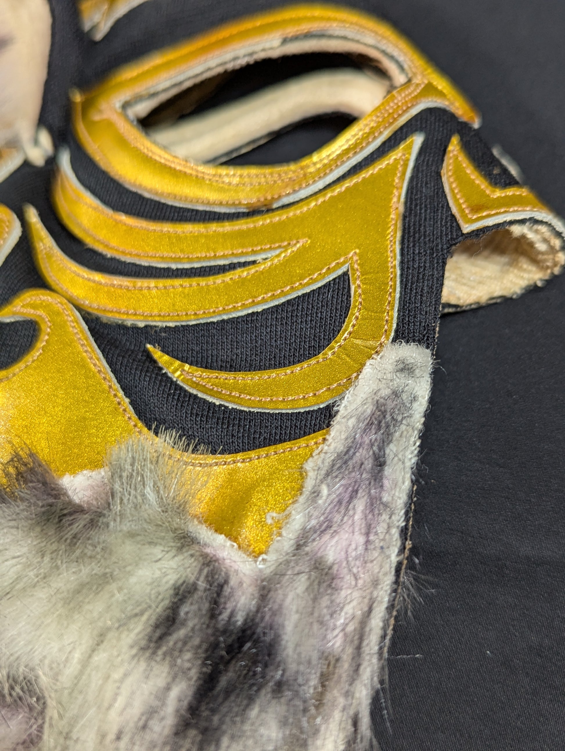 ★80年代当時モノ★ 黒ジャージ生地(ウール) 辛子金革フチ ベロは同色のウール素材と綿素材 喉テープは縦幅1.7cmで青糸のセンターステッチ入り(黒糸ステッチ上1本、下2本) 裏当ては目の周りに厚みが約5mmの白フェルト、口周りは薄茶色の本革 アイデアル十字テープ ボア着色 1984年に山崎一彦氏が製作したもの