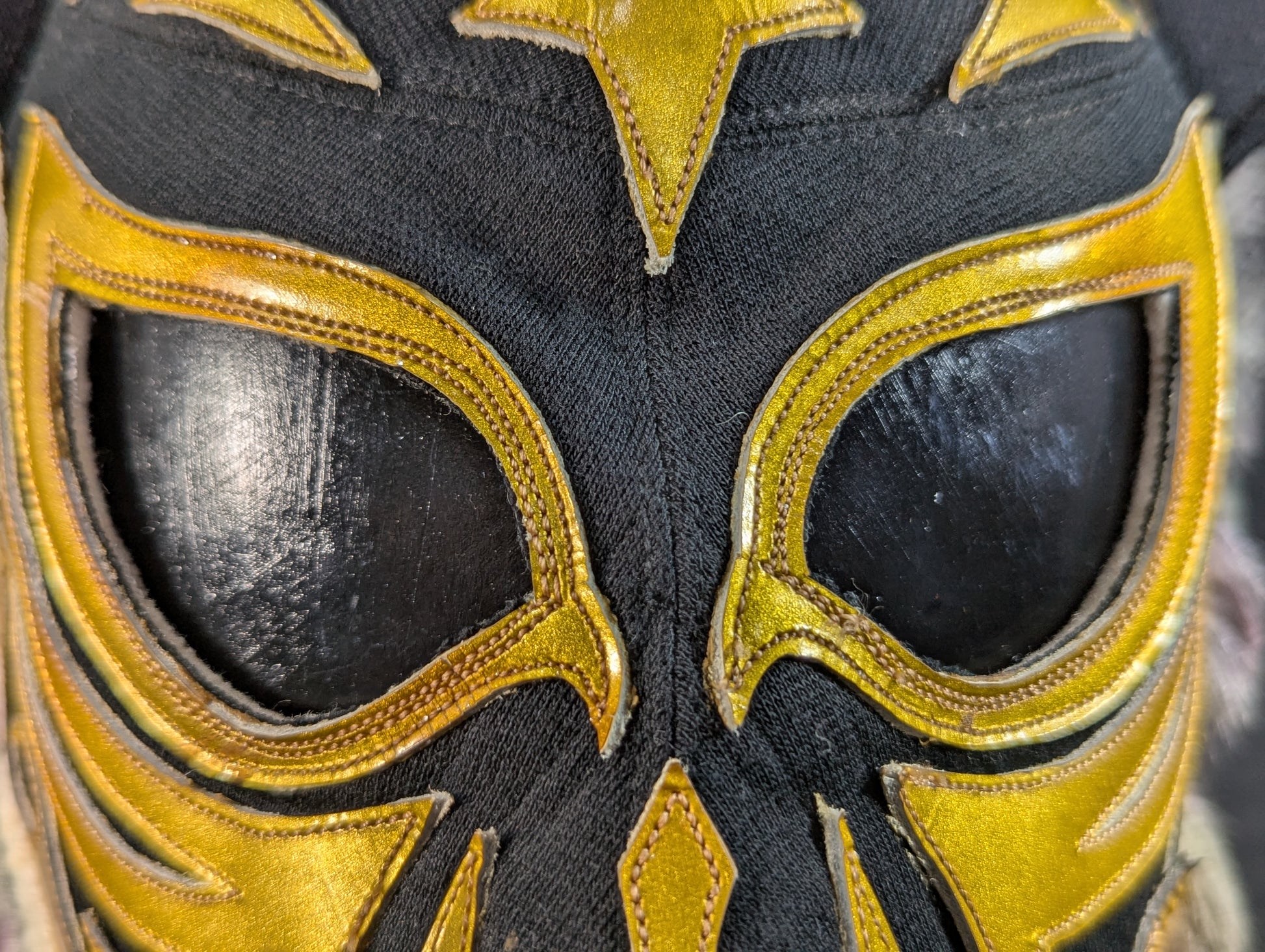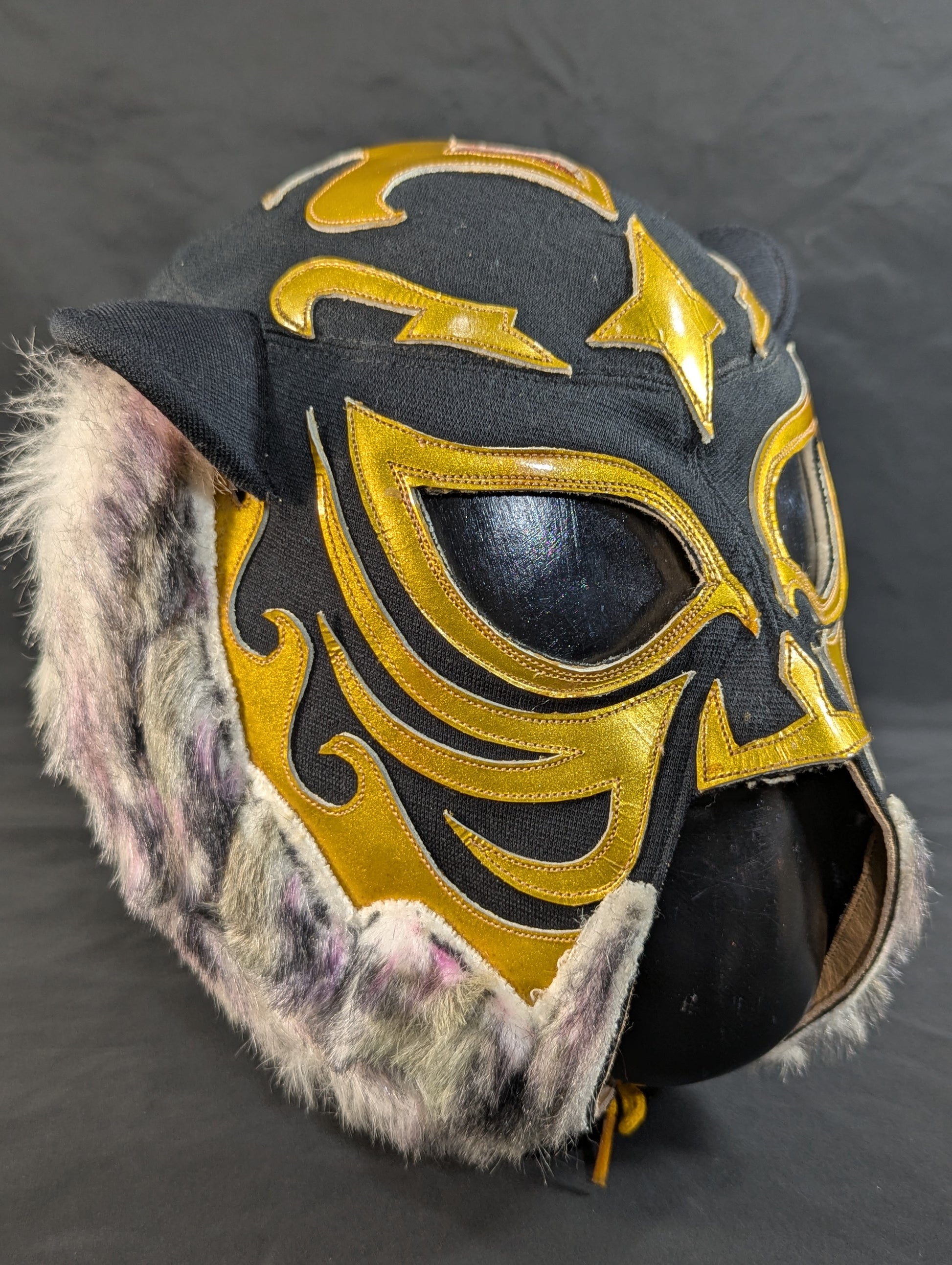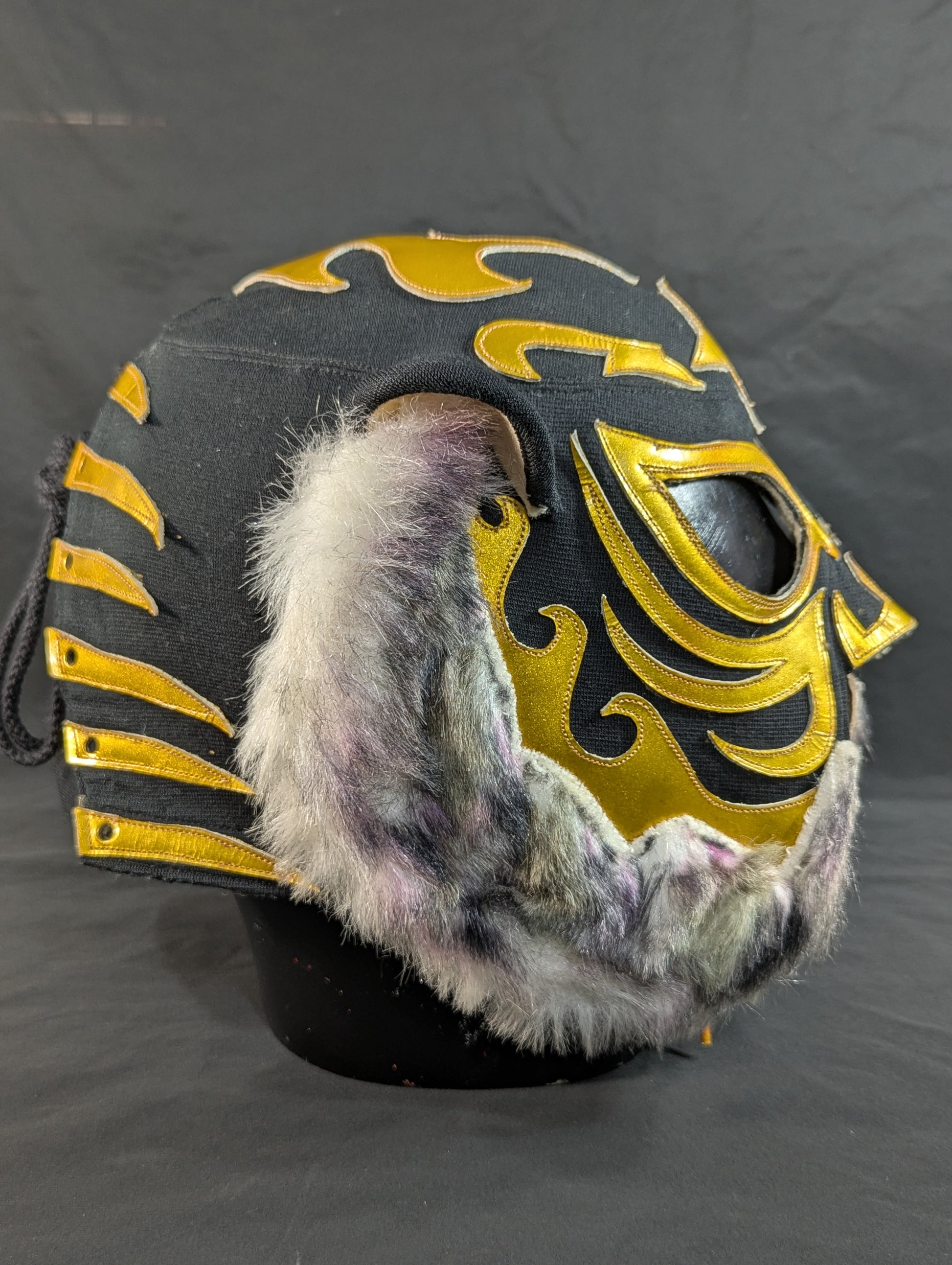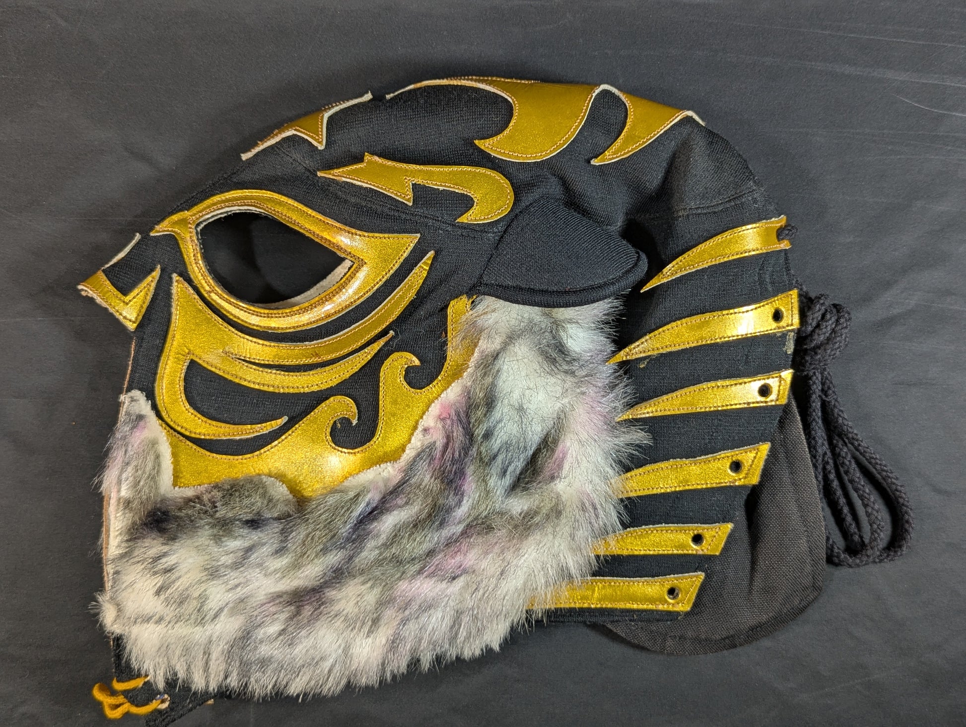 ★80年代当時モノ★ 黒ジャージ生地(ウール) 辛子金革フチ ベロは同色のウール素材と綿素材 喉テープは縦幅1.7cmで青糸のセンターステッチ入り(黒糸ステッチ上1本、下2本) 裏当ては目の周りに厚みが約5mmの白フェルト、口周りは薄茶色の本革 アイデアル十字テープ ボア着色 1984年に山崎一彦氏が製作したもの