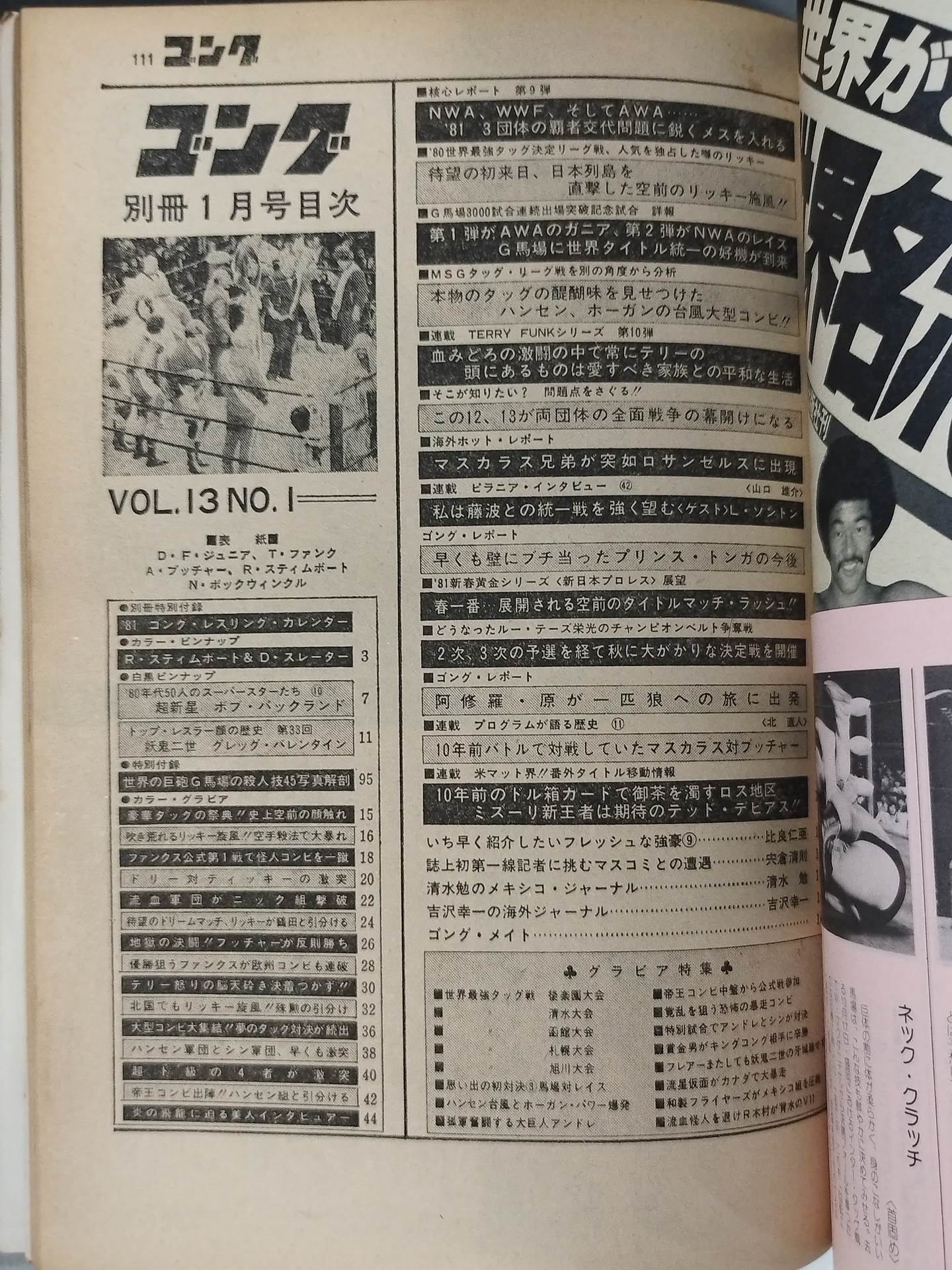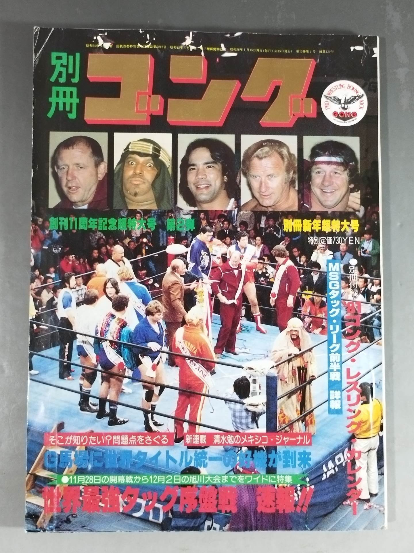 最強&MSG2大タッグ・リーグ戦速報号 G馬場に世界タイトル統一の好機が到来 /【付録】○カラーピンナップ(ディック・スレーター&リッキー・スティムボート) ○白黒ピンナップ(ボブ・バックランド) ○白黒ピンナップ(グレッグ・バレンタイン) ○特別付録(ジャイアント馬場の殺人技45写真解剖) ○カレンダー