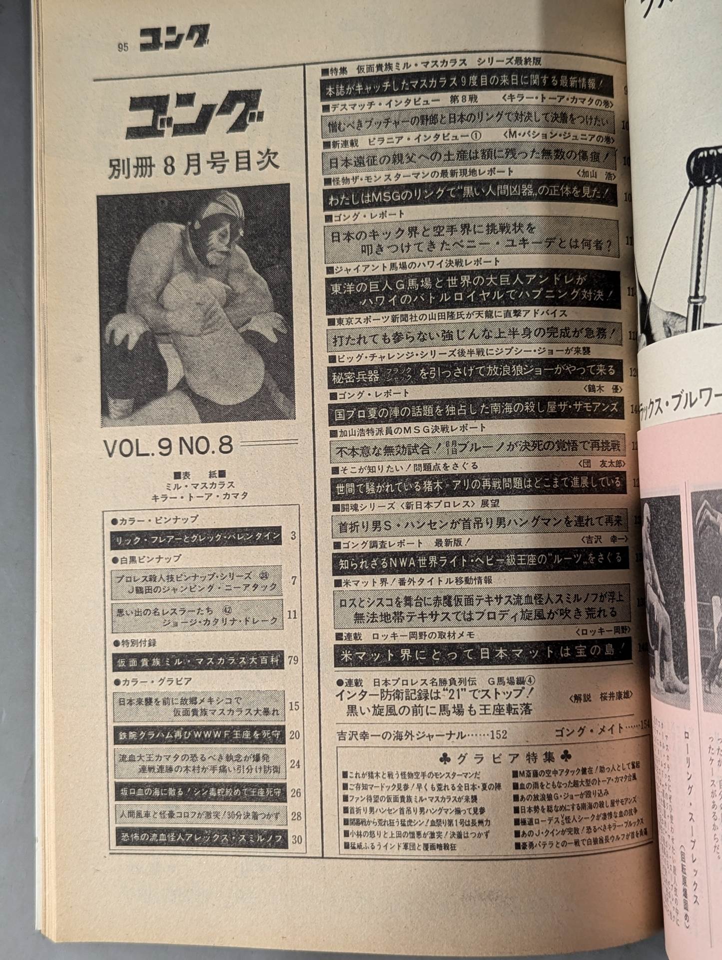 仮面貴族ミル・マスカラス最新メキシコ決戦特集怪物モンスターマンの現地情報 / 【付録】○カラーピンナップ(リック・フレアー、グレッグ・バレンタイン) ○白黒ピンナップ(プロレス殺人技シリーズ 38 ジャンピング・ニーアタック) ○白黒ピンナップ(カタリナ・ドレーク) ○特別付録(ミル・マスカラス大百科 第2弾)