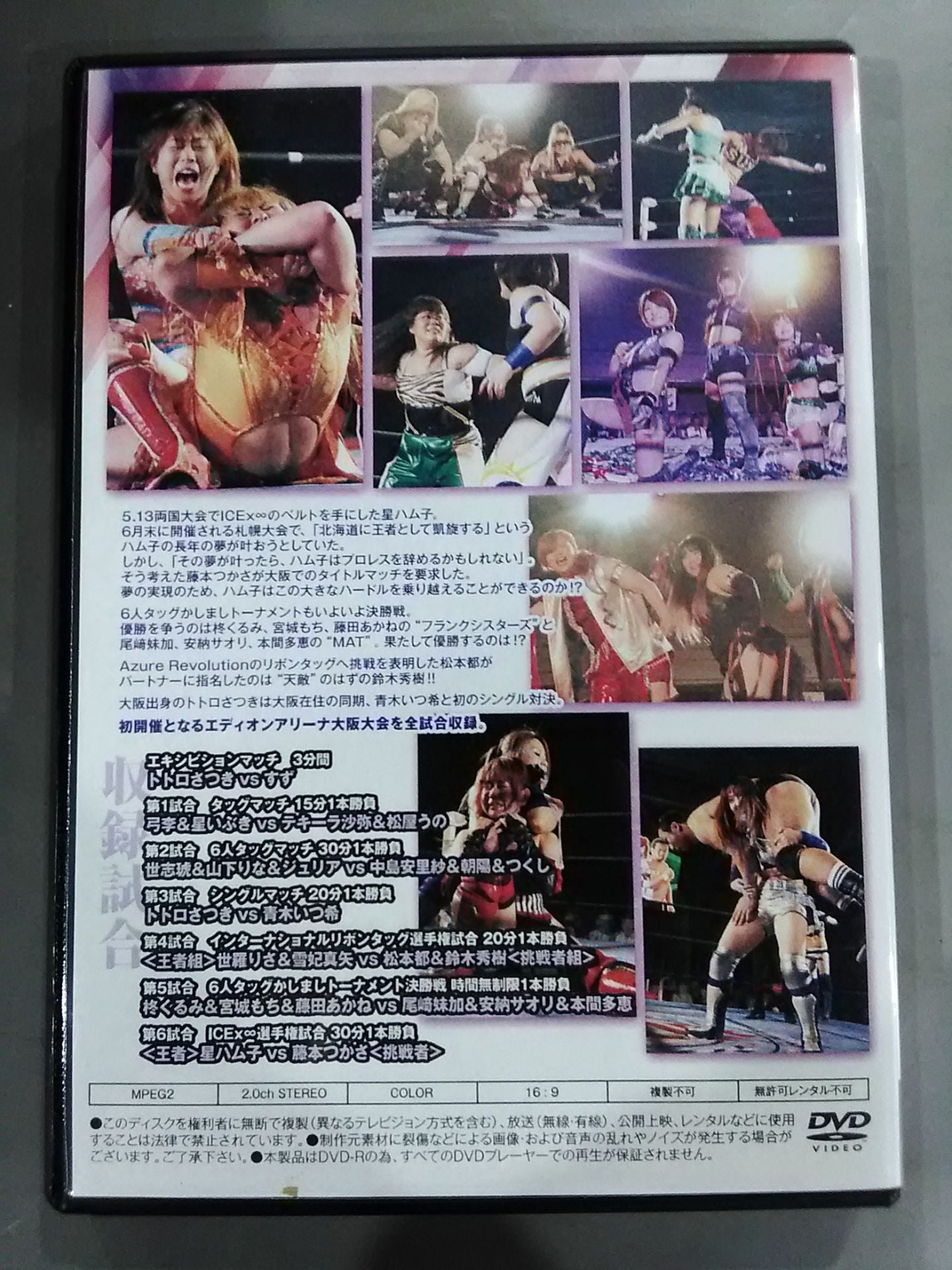 5.13両国大会でICE×∞のベルトを手にした星ハム子。6月末に開催される札幌大会で、「北海道に王者として凱旋する」というハム子の長年の夢が叶おうとしていた。しかし、「その夢が叶ったら、ハム子はプロレスを辞めるかもしれない」。 そう考えた藤本つかさが大阪でのタイトルマッチを要求した。 夢の実現のため、ハム子はこの大きなハードルを乗り越えることができるのか!?6人タッグかしましトーナメントもいよいよ決勝戦。優勝を争うのは柊くるみ、宮城もち、藤田あかねの“フランクシスターズと尾崎妹加、安納サオリ、本間多恵の“MAT”。果たして優勝するのは!?Azure Revolutionのリボンタッグへ挑戦を表明した松本都がパートナーに指名したのは“天敵”のはずの鈴木秀樹!!大阪出身のトトロさつきは大阪在住の同期、青木いつ希と初のシングル対決。初開催となるエディオンアリーナ大阪大会を全試合収録