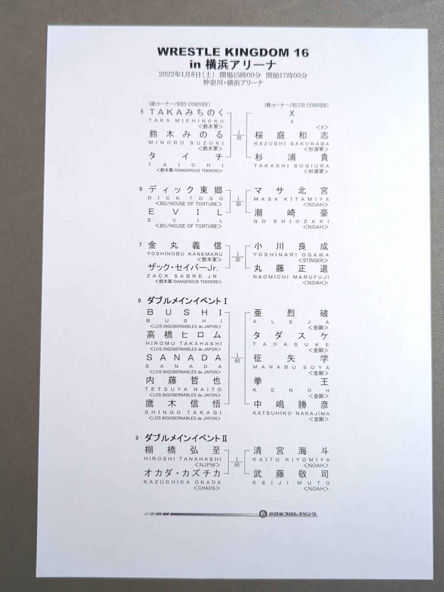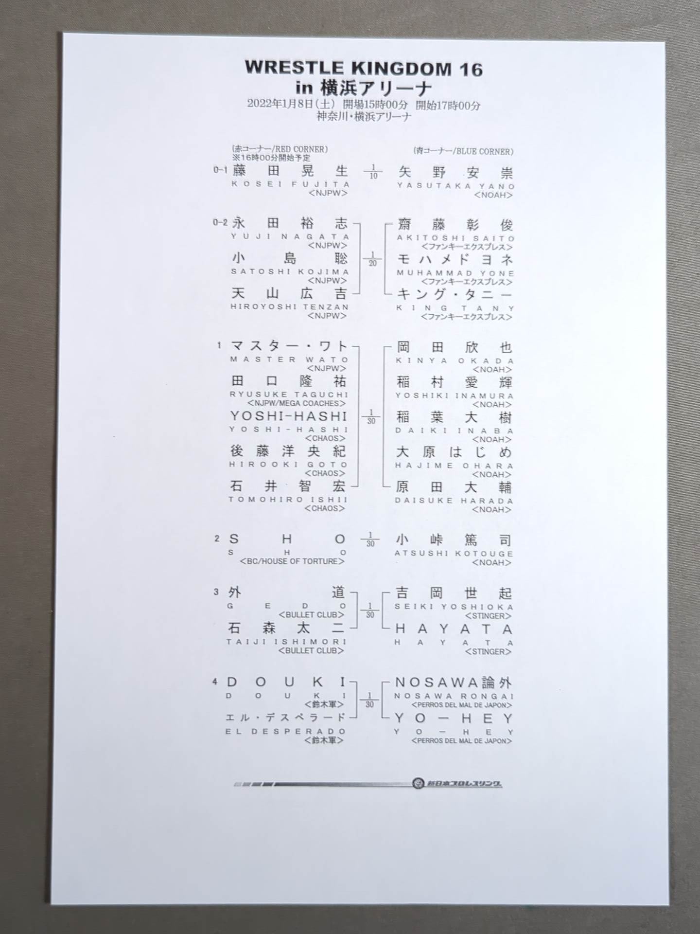 会場:横浜アリーナ / 別紙対戦カードあり:オカダ・カズチカ&棚橋弘至vs武藤敬司&清宮海斗 / 内藤哲也&鷹木信悟&SANADA&BUSHI&高橋ヒロムvs拳王&中嶋勝彦&征矢学&タダスケ&亜烈破 / ★NEW JAPAN vs NOAH★ WRESTLE KINGDOM 16 in YOKOHAMA ARENA