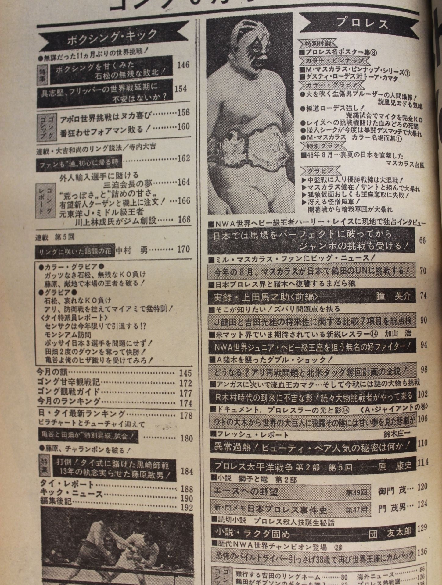 ・特報:NWA王者レイスに独占会見 ・第5回C・カーニバル中盤戦詳報 ・S・ムアンスリンvsG石松戦詳報 ・藤原、敵地で本場の王者を破る! / 【付録】〇ピンナップ(表マスカラス・ピンナップ・シリーズ①/裏ダスティ・ローデス対トーア・カマタ) 〇特別付録(プロレス名ポスター集⑧) 表紙:ジャンボ鶴田、アブドーラ・ザ・ブッチャー、ロイヤル小林