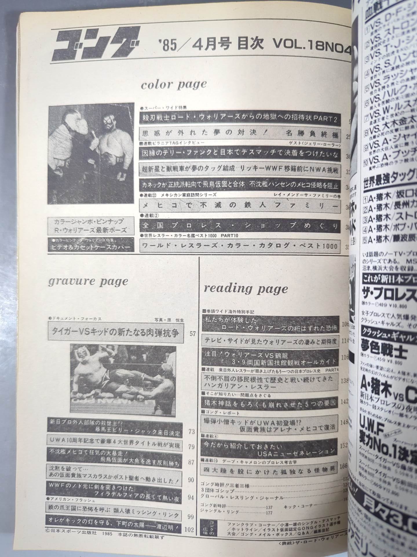 1985年 殺刃戦士ロード・ウォリアーズ超特集!!新着フォトと最新レポートで綴る「地獄からの招待状」PART2 ドキュメント・フォーカス タイガーvsキッドの新たなる肉弾抗争 「世界のプロレス」ウォーリア-ズ特集 カラー名鑑ベスト1000⑩ / 【付録】×カラー・ジャンボ・ピンナップ(ザ・ロード・ウォリアーズ) ◯特別付録(ビデオ&カセットケースカバー) 表紙:ザ・ロード・ウォリアーズ