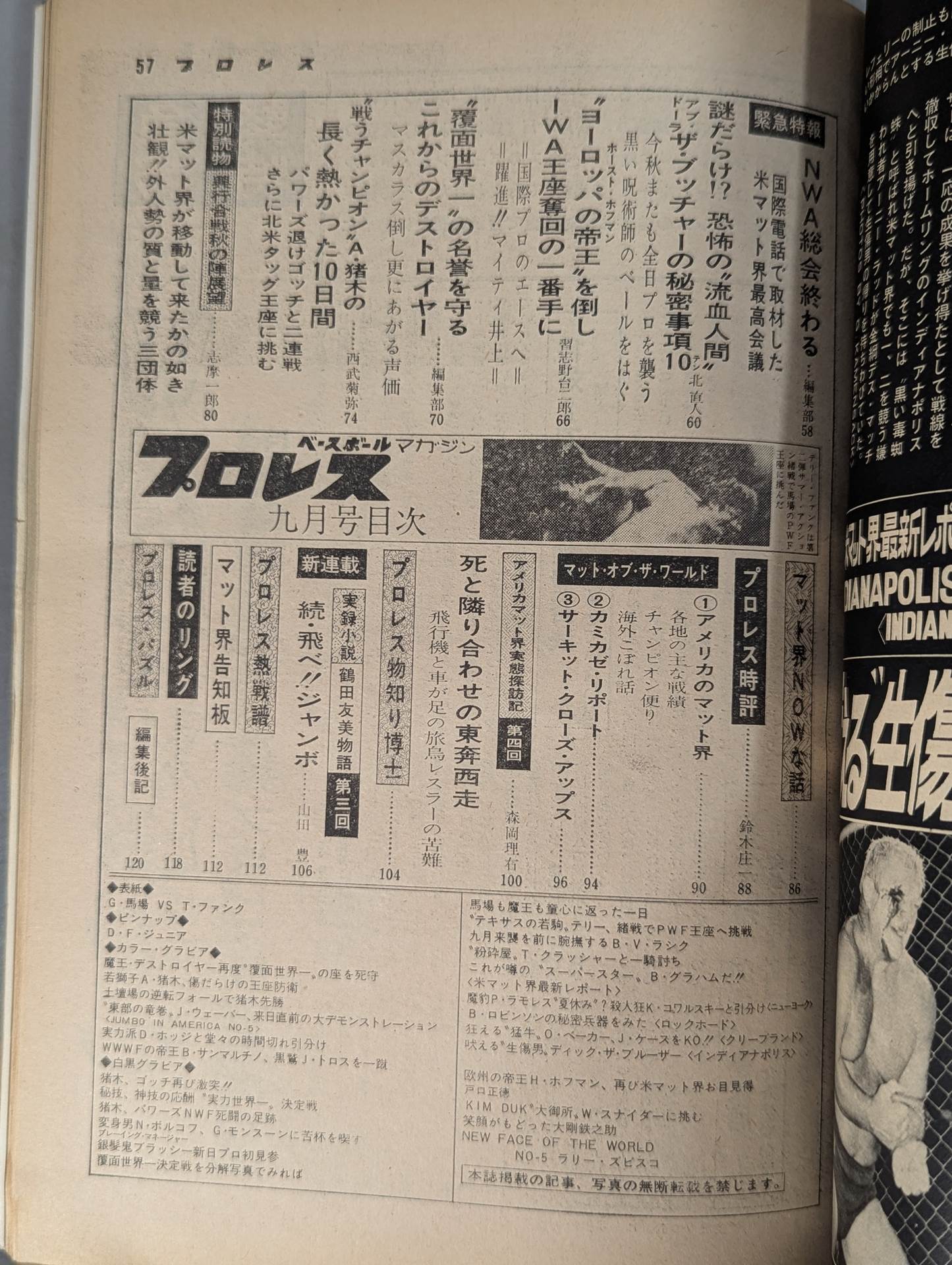猪木vsゴッチ 二番勝負完全詳報 米マット界が日本に移動? 三団体の興行合戦 謎だらけ?! 恐怖の流血人間A・ブッチャーの秘密事項10 / 【付録】◯ピンナップ(ドリー・ファンク・ジュニア) / 表紙:ジャイアント馬場vsテリー・ファンク