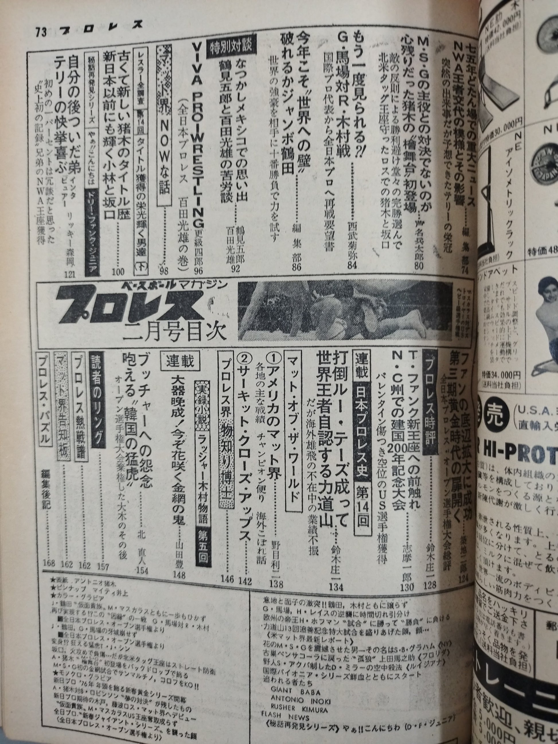今年こそ”世界”への壁破れるかJ・鶴田 世界の強豪相手に”十番勝負”で力を試す / もう一度見られる!? G・馬場対R・木村戦 国際・吉原代表から全日プロへ再戦要望書 / 【付録】◯ピンナップ(マイティ井上) 表紙:アントニオ猪木